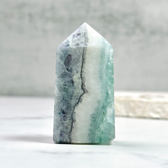 シャリシャリとした質感の3色フローライト。透き通ったグリーンにミルキーホワイト、色味を抑えたブルーパープルの3層構造になっています。可愛らしい虹が煌めき、優しい雰囲気を醸し出しています。リビングやドレッサー周りなどお気に入りの場所に飾って楽しんでください。インテリアやギフトとしてもおすすめの天然石アイテムです。 ◉フローライト フローライトは「天才の石」とも呼ばれ、多彩な色合いと透明感が魅力の天然石です。グリーンフローライトは、特に心を穏やかに整えるような柔らかな色味が人気で、主な産地は中国、アメリカ、イギリスなど。古来より「思考をクリアにする石」と伝えられ、癒しと浄化の象徴としても親しまれています。 ◉サイズ Height:59mm 天然石の性質上、または加工や輸送によるキズ・欠け・穴・内包物等が見られることがございます。それらの全てをお伝えしきれない場合もございますので、予めご了承ください。また、極力実物通りの表現を心がけておりますが、天然石の性質や撮影環境、お使いのデバイス等により、実物と相違があると感じることがあるかもしれません。商品について気になる点がございましたら、ご購入前にお問い合わせください。ご注文後のキャンセルはできません。