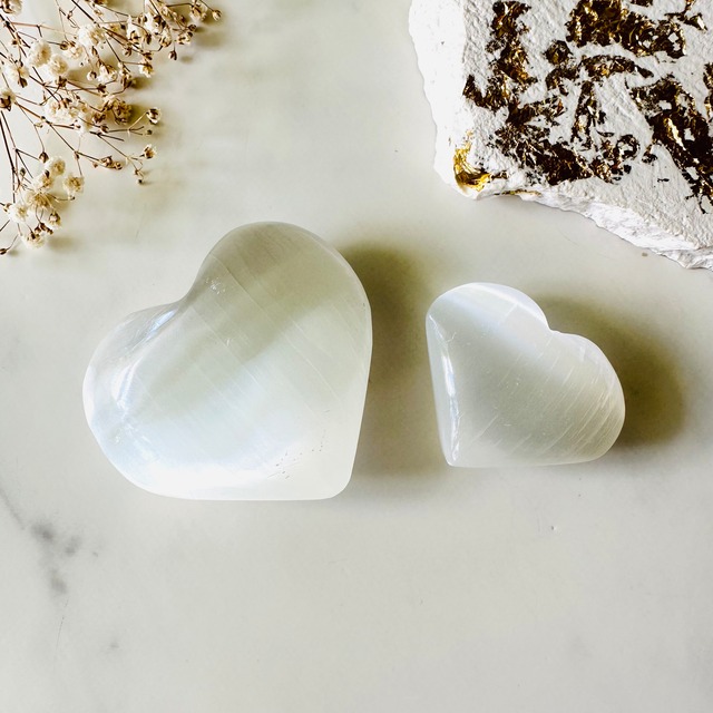動画をご覧ください https://www.instagram.com/reel/CzKsxPxSYex/?igshid=MzRlODBiNWFlZA== 月のように清らかで美しい光を放つセレナイトのハート型ストーンのセットです。 セレナイトは、ギリシャ語の「月」と、月の女神「セレーネ」から名付けられたと言われます。女神のようにとても優しい波動を持つ天然石で、持ち主を優しく包み込んで傷ついた心や身体を癒やしてくれます。 ◉サイズ 大 Length:63mm Weight:91g 小 Length:45mm Weight:31g ※若干の個体差があります 天然石の性質上、または加工や輸送によるキズ・欠け・穴・内包物等が見られることがございます。それらの全てをお伝えしきれない場合もございますので、予めご了承ください。 また、極力実物通りの表現を心がけておりますが、天然石の性質撮影環境、お使いのデバイス等により、実物と相違があると感じることがあるかもしれません。商品について気になる点がございましたら、ご購入前にお問い合わせください。ご注文後のキャンセルはできません。