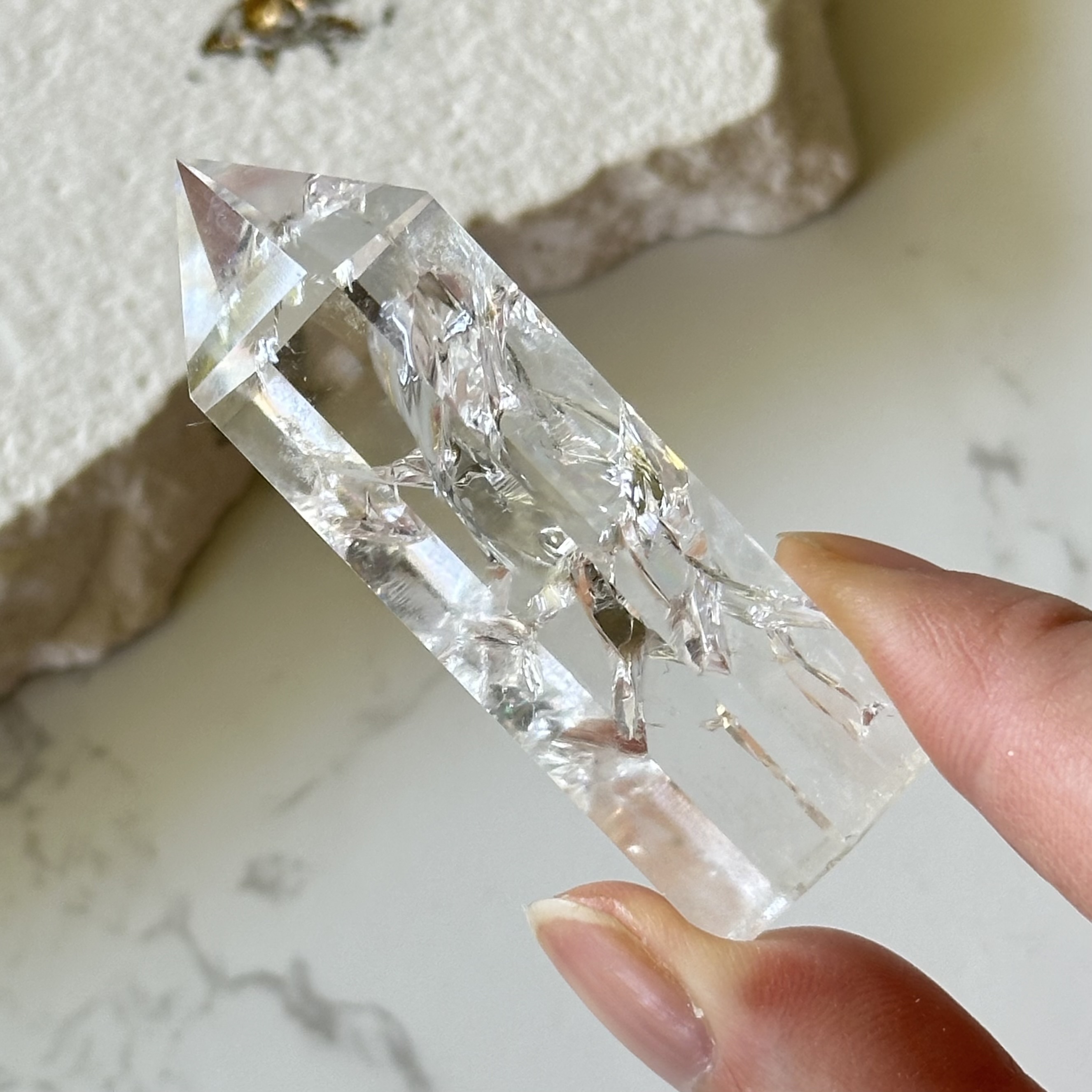 天然水晶に人工的にクラックを入れたクラック水晶タワーです。クラックが光を反射して美しく煌めき虹を宿します。