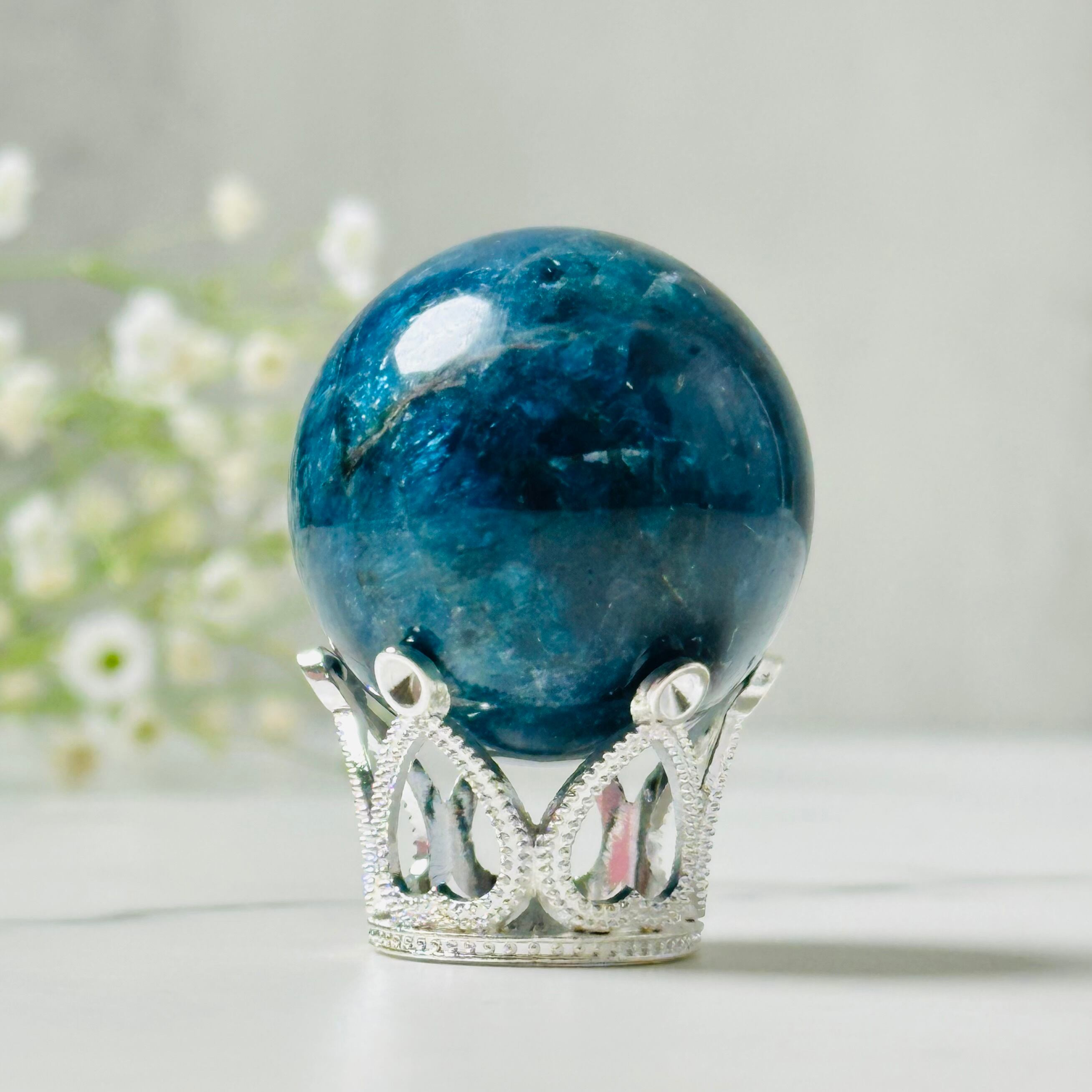 美しいブルーの色合いが海や空、地球を連想させます。自然の美しさを感じながらこの小さなスフィアを手に取ると、自分自身が宇宙の一部であると感じられるような気がします。意識が宇宙に溶け込み一体化するような感覚は、不思議と安らぎをもたらし深い癒しを得ることができます。
