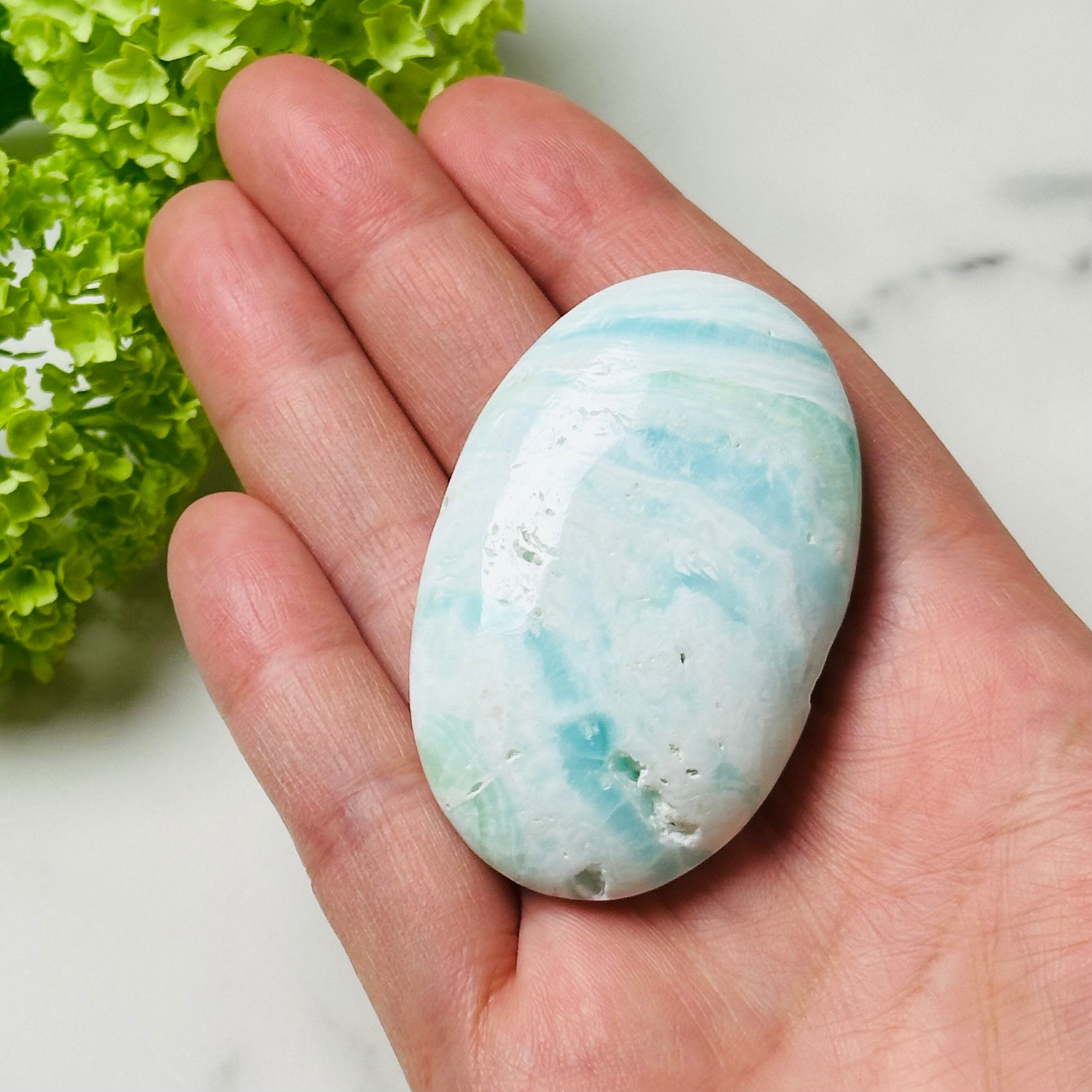 優しい空色と白の層模様が美しい、カリビアンブルーカルサイトのパームストーン。手のひらにぴったりと収まるなめらかなフォルムで、眺めるだけでも心がすーっと落ち着いていくような癒しのひと品です。ナチュラルテイストのインテリアとの相性もよく、置くだけでふんわりとした空間に。プレゼントやお守りにもおすすめです。