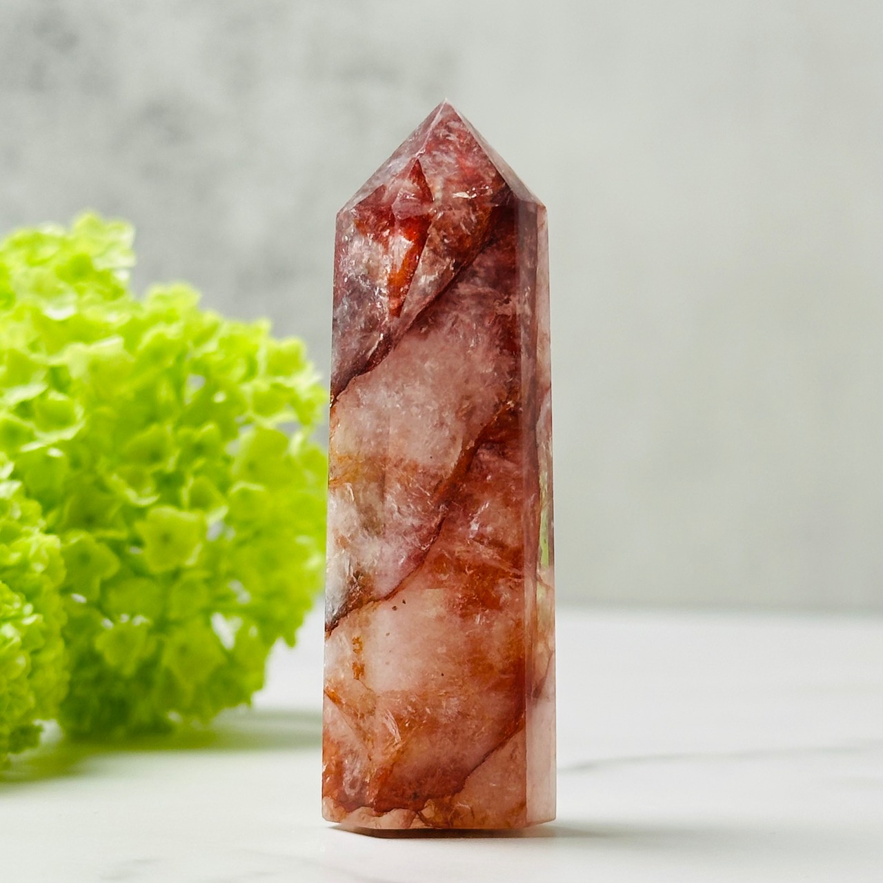 透明な水晶の中に、燃えるような赤やオレンジのインクルージョンが幻想的に広がるファイヤークォーツのタワー。まるで夕焼けを閉じ込めたかのような表情は、一点ものならではの魅力。シャープなフォルムと輝きは、お部屋に洗練されたエネルギーをもたらし、空間を引き締めるアクセントにぴったり。見るたびに元気をもらえる、存在感あるインテリアアイテムです。