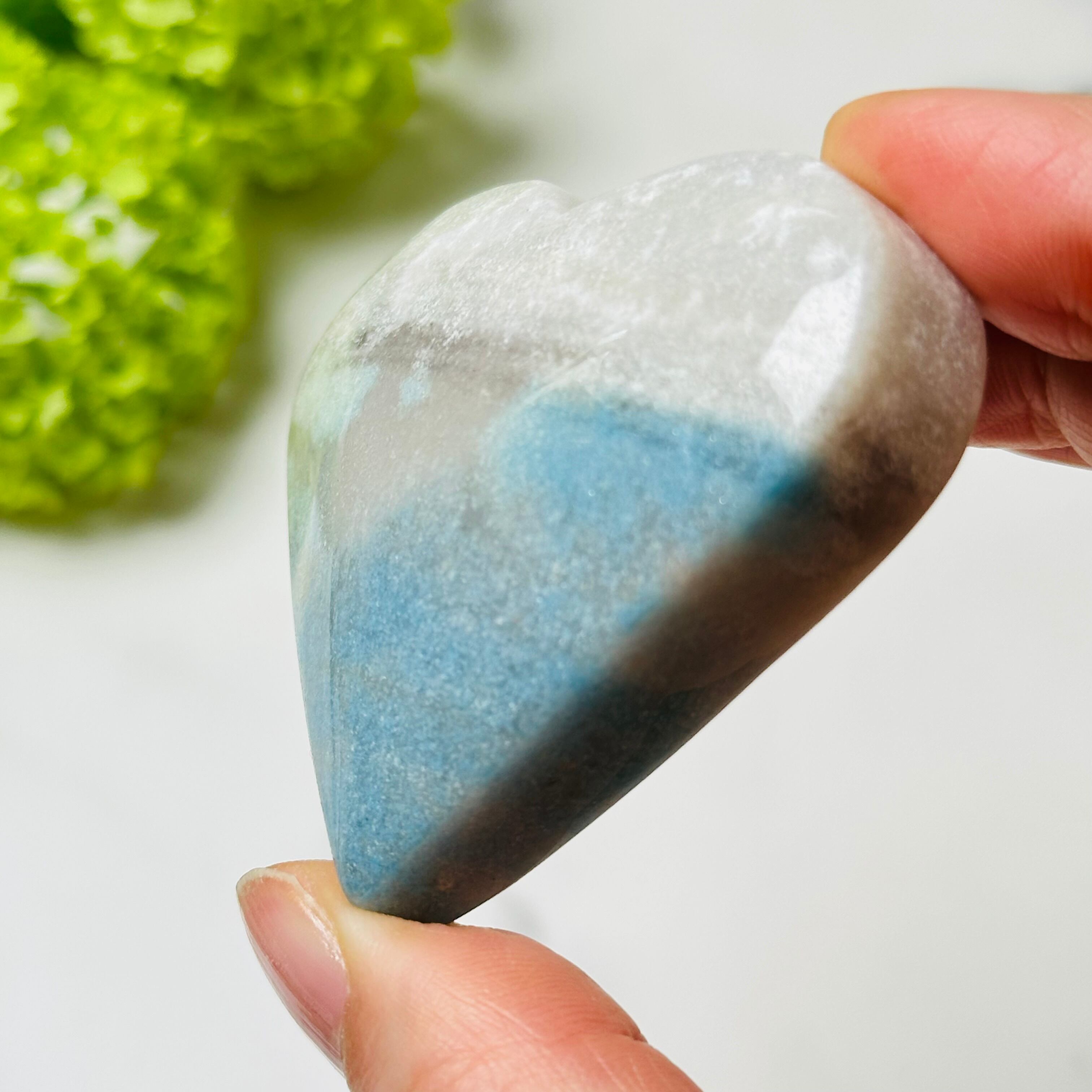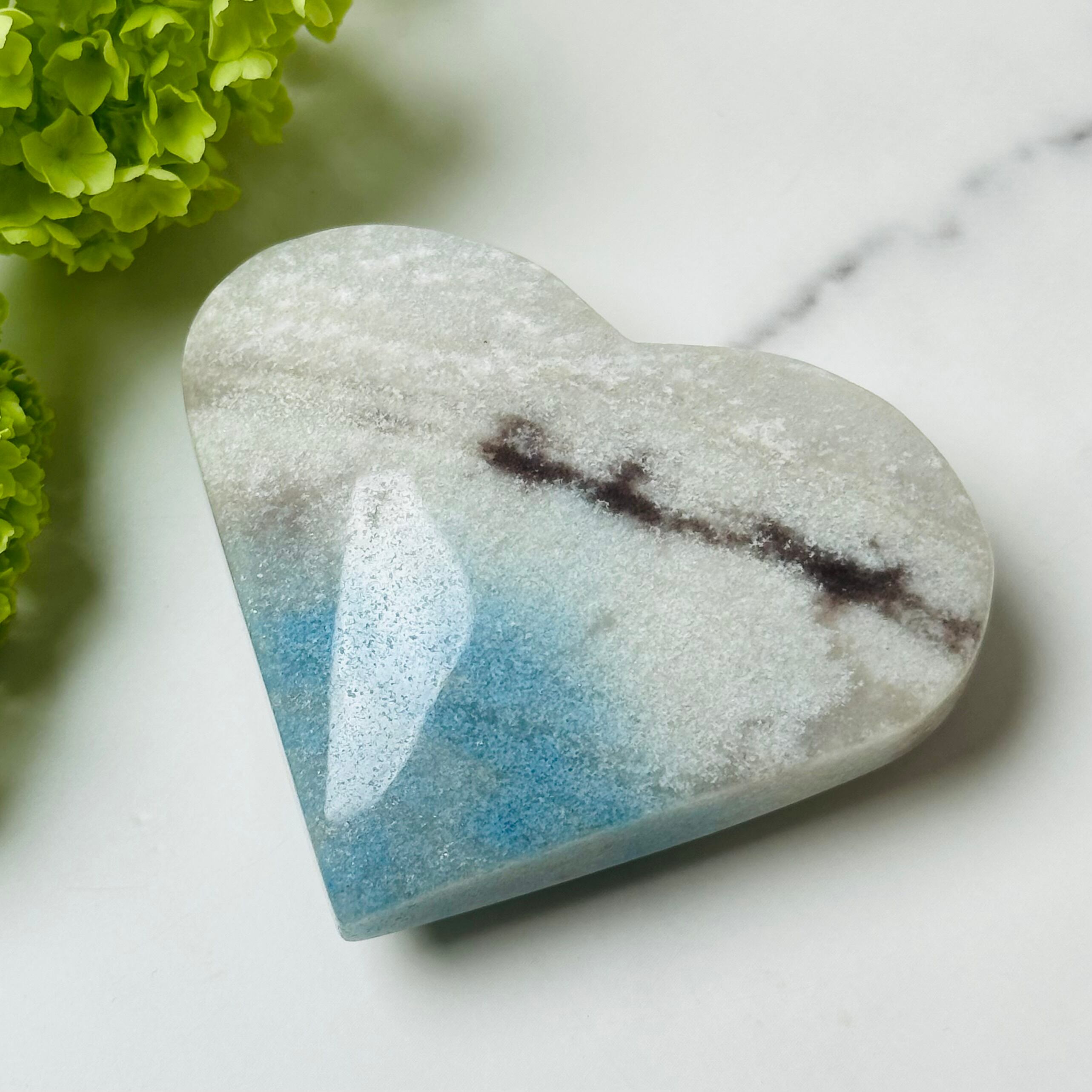 優しい水色とグレーが溶け合う、幻想的なトロレアイトのハート型ストーン。手のひらサイズの可愛らしいフォルムが、見る人の心をふんわりと包み込みます。ナチュラルインテリアとの相性も抜群で、飾るだけでお部屋に癒しのエッセンスをプラス。大切な方へのちょっとした贈り物にもおすすめです。