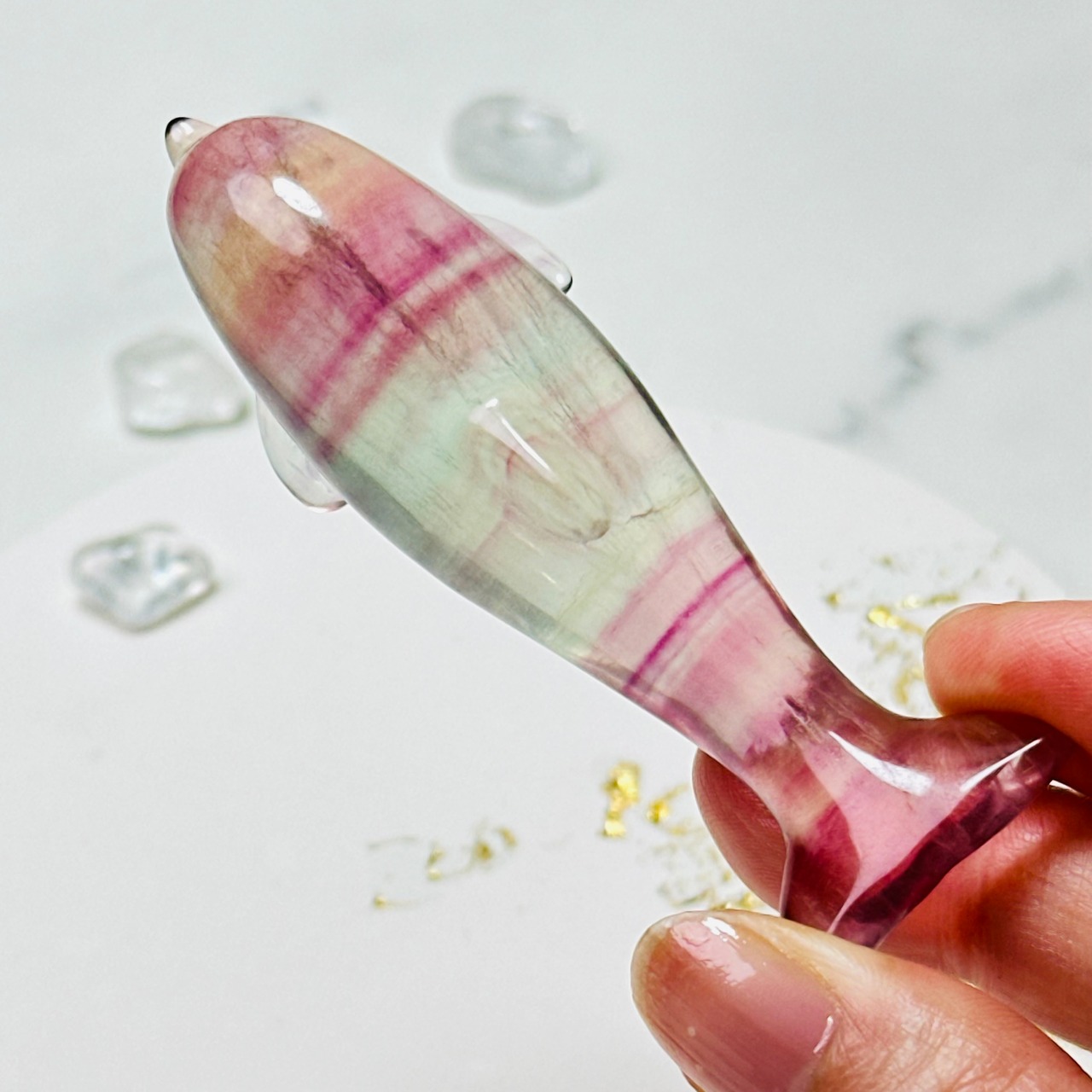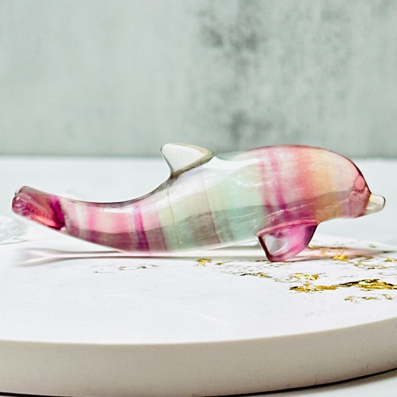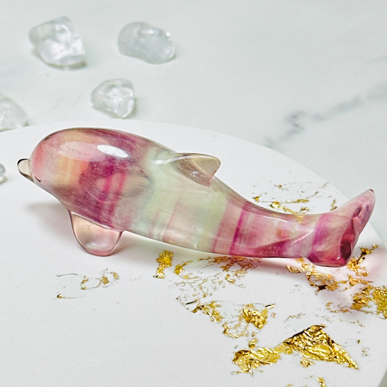 キャンディカラー天然石イルカ|ピンク×グリーンの癒しフローライト彫刻(Length:80mm)