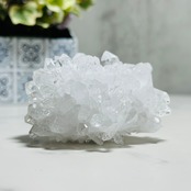 透明度の高いクリアな結晶が群晶をなします。ひとつひとつの花弁のような結晶が繊細に重なり、光を受けるたびにキラキラと輝く様子は、まるで自然が生み出した芸術作品のよう。お部屋に飾るだけで空間を浄化するような清らかさを放ち、癒しと品のあるインテリアとして活躍してくれます。