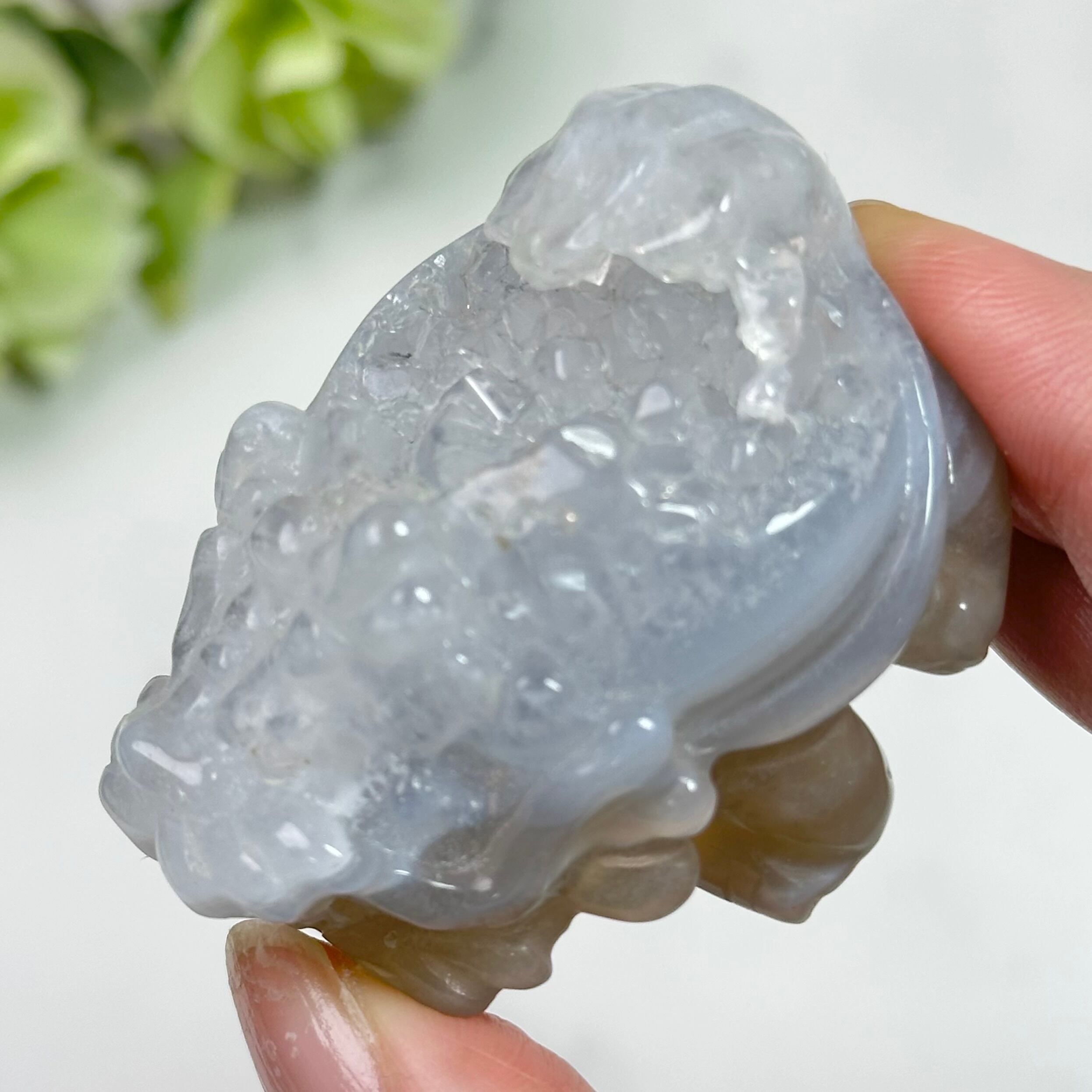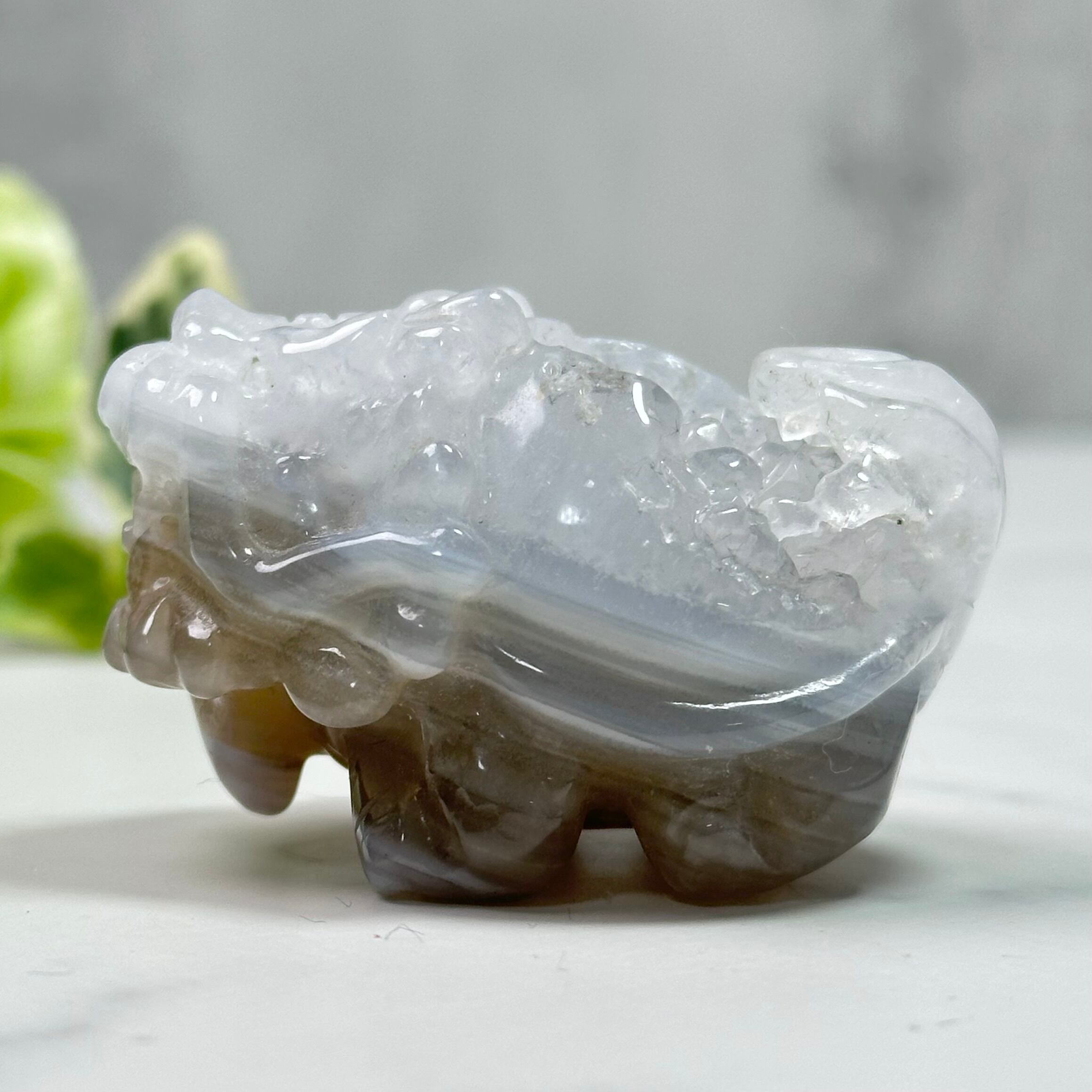 背中に結晶がきらめくドゥルージーアゲートのロングイ。ころんと丸いシルエットに、自然が作り出した繊細な輝きが映える一点もの。落ち着いたグレートーンのグラデーションとキラキラ輝くドゥルージーがアクセントとなり、ナチュラルかつ高級感のあるインテリアを演出します。小さなスペースにも飾りやすく、デスクや窓辺にさりげなく置くだけで、お部屋の雰囲気がグッと洗練されます。