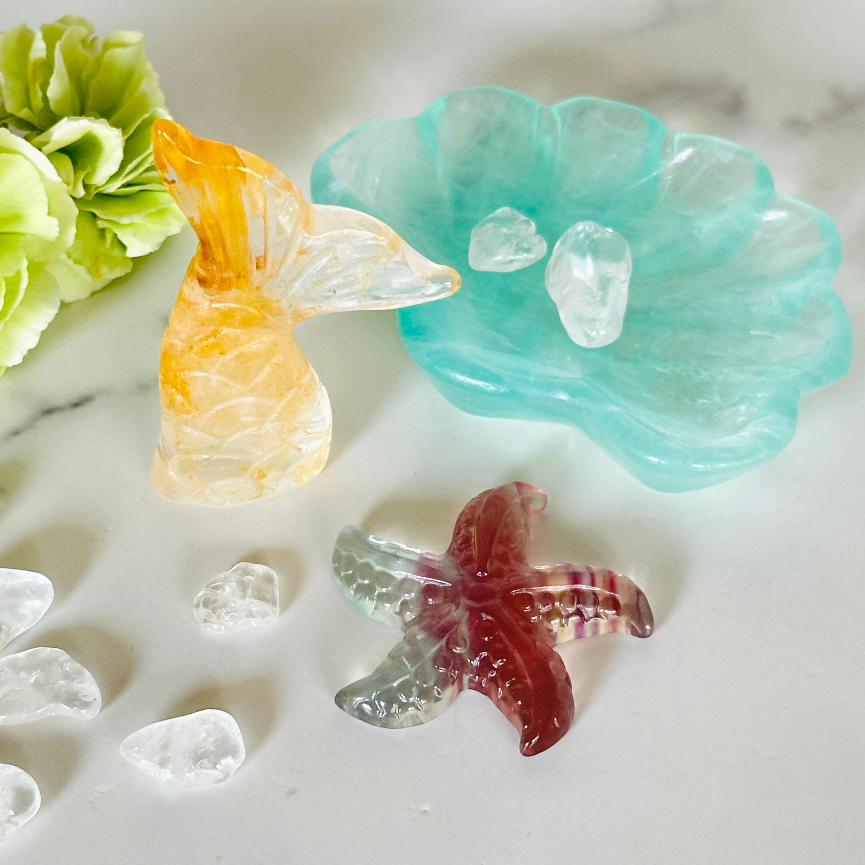 光を受けてほんのりと輝く、ゴールデンヒーラーのフィッシュテイルカーヴィング。魚の尾びれをモチーフにした曲線美が美しく、見る角度によって表情を変える上品なデザインです。イルカやスターフィッシュ、巻貝など海辺のモチーフやパールシェル、天然石さざれなどど一緒にデスクや棚に飾ればあなただけの小さなプライベートビーチ海辺が完成します。