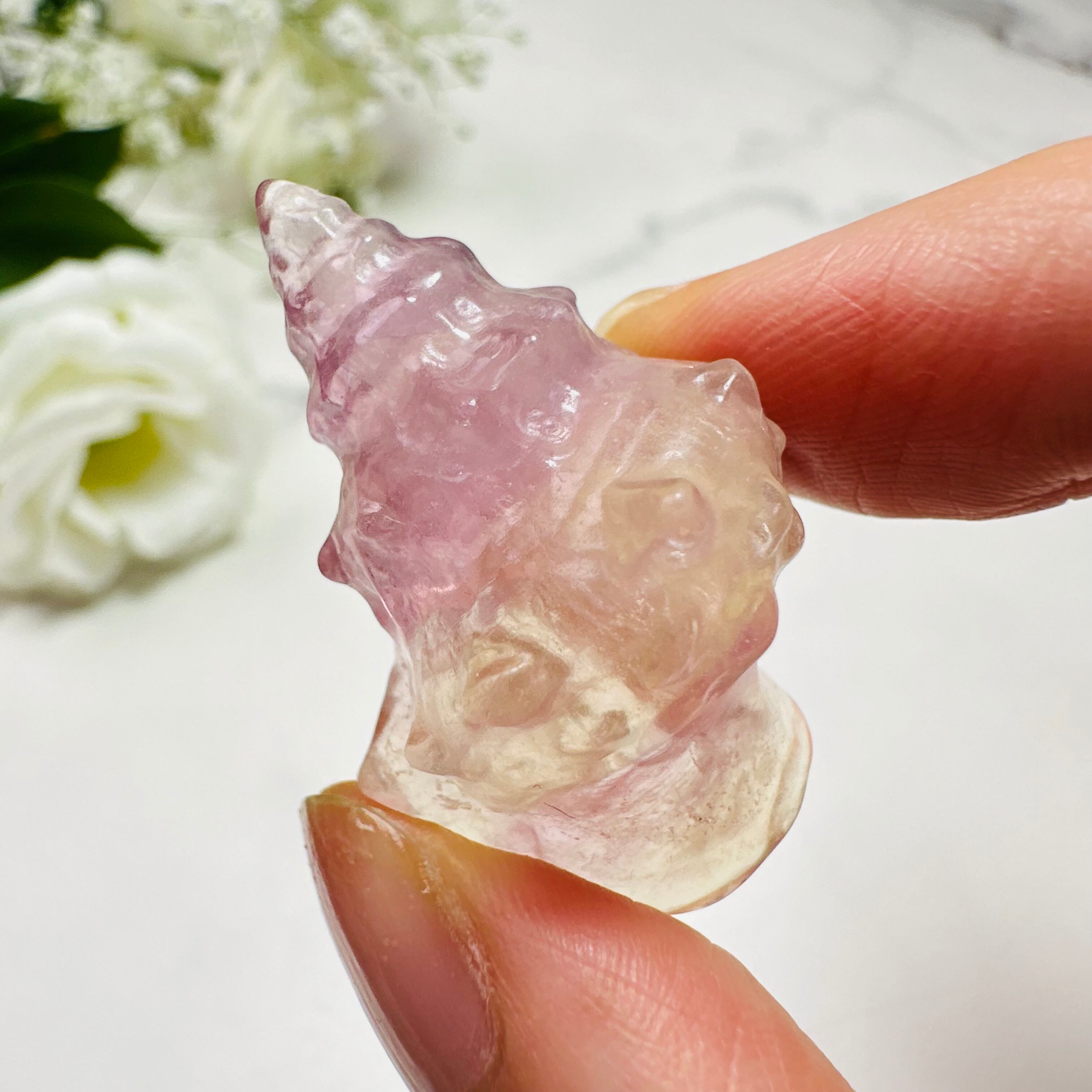 宝石のようなフローライトの巻貝カーヴィング。透き通った質感と美しい色合いが魅力です。貝殻の形が海辺を思わせる、夏のインテリアにぴったりの天然石アイテムです。シェルや流木と組み合わせて飾れば、リゾート感あふれる癒しの空間が完成。窓辺や玄関に飾るだけで、季節を感じるナチュラルなインテリアが完成です。
