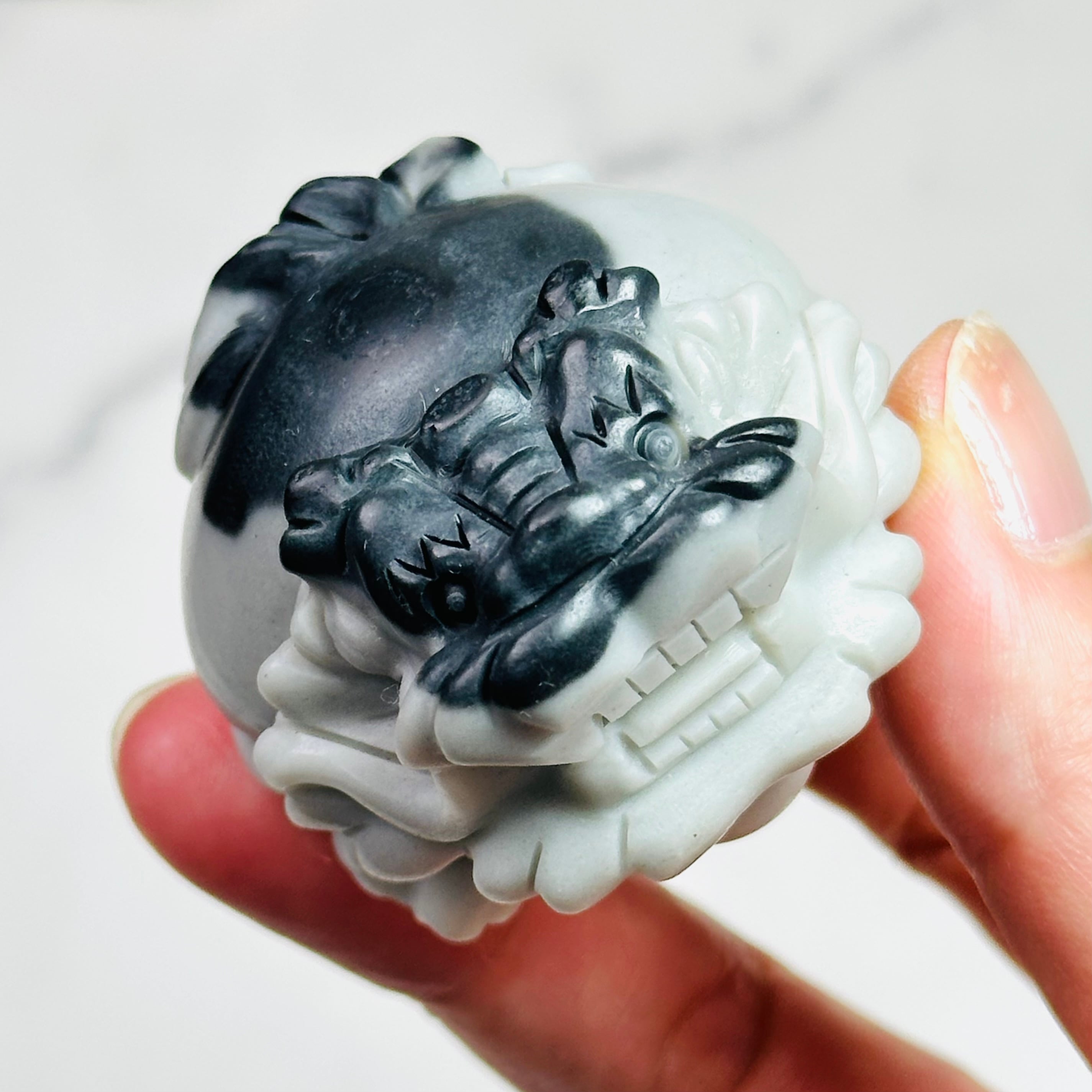 陰陽のバランスを象徴する天然石「太極石」で作られたロングイ(龍亀)です。白黒のコントラストが美しく洗練された印象を与えます。男性への贈り物にもぴったり。仕事部屋のデスク周りや、モノトーンの落ち着いたお部屋のインテリアに最適です。