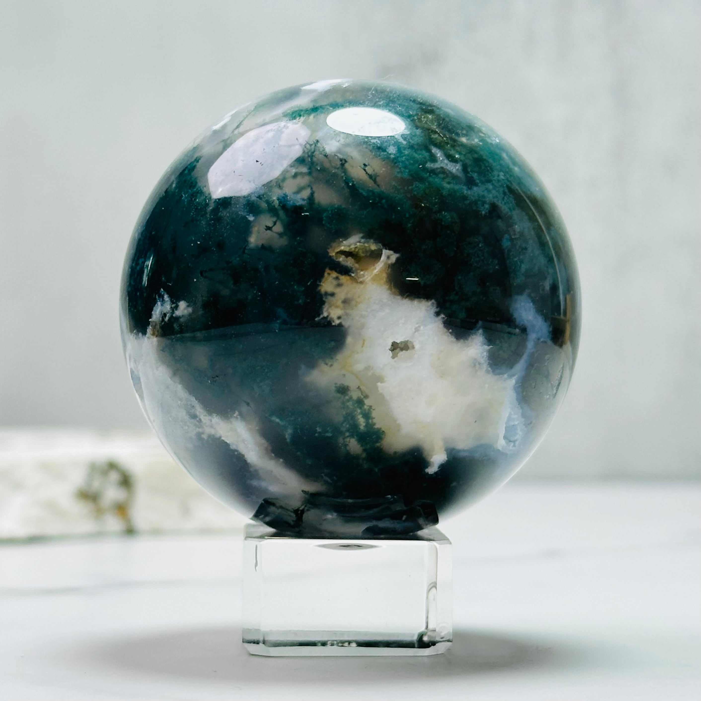 森の風景をそのまま閉じ込めたような、幻想的な模様が魅力のモスアゲートスフィア。ナチュラルな風合いと柔らかなグリーンの色合いが、空間に優しい癒しのエネルギーをもたらします。お部屋に一つ置くだけで森林浴をしているような癒しのエネルギーを受け取り、心が回復していくのを感じることができます。