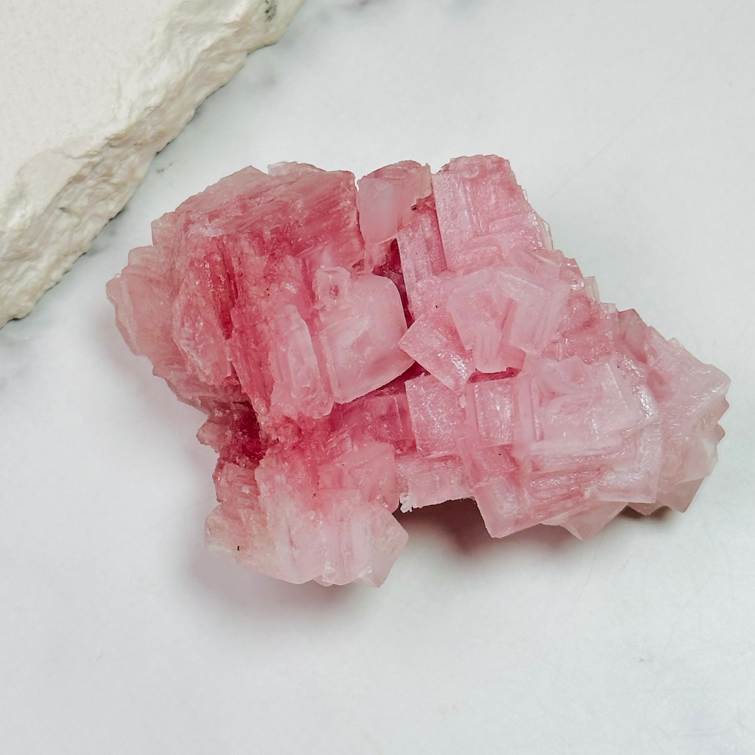 綺麗なピンク色が優しく輝く、アメリカ・カリフォルニア州の塩湖で採掘されたピンクハーライトの原石。天然の岩塩がゆっくりと結晶化することで生まれるこの石は、まるでお菓子のような見た目と独特の質感が魅力です。限られた地域でしか採れない希少性の高さと、自然が生み出した優しい色合いをお楽しみください。