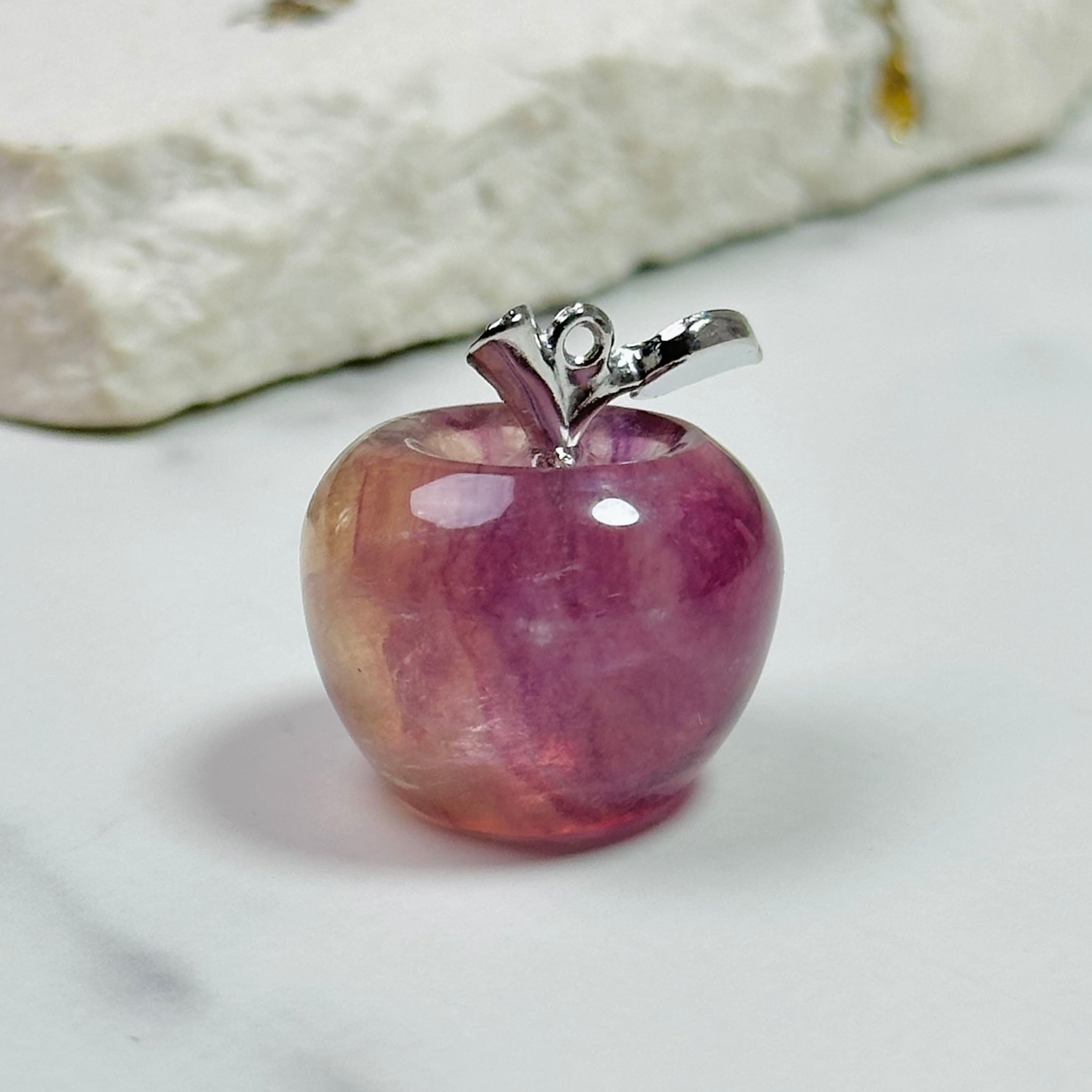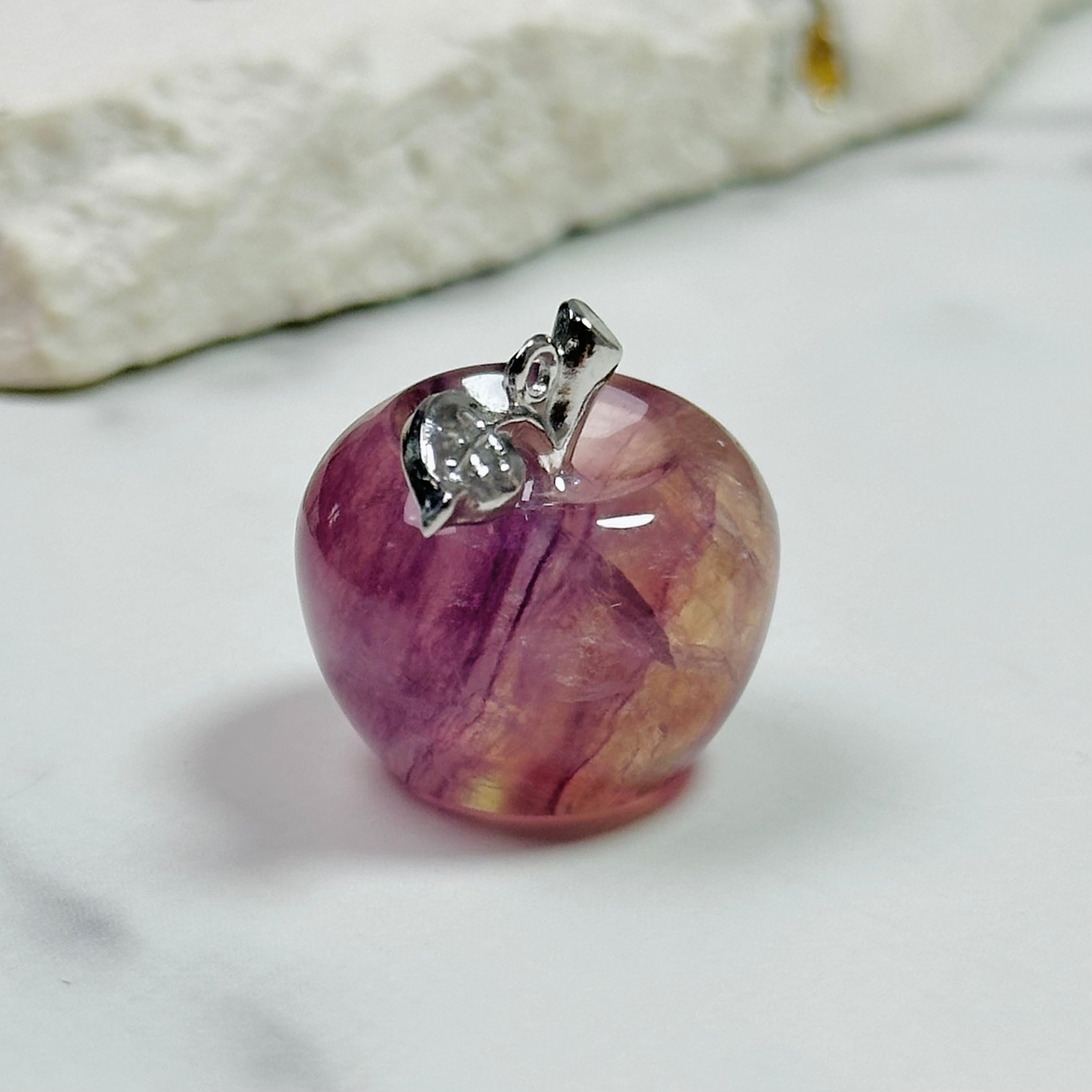 ころんとしたフォルムが愛らしい天然石フローライトのりんご。美しい色合いで光の当たり方や角度によって表情が変わります。お部屋のお気に入りスペースに飾ったり、ペーパーウエイトとしてお使いください。大切な方へのギフトにもぴったりです。ナチュラルで上品な雰囲気が、大人の可愛らしさを引き立てます。