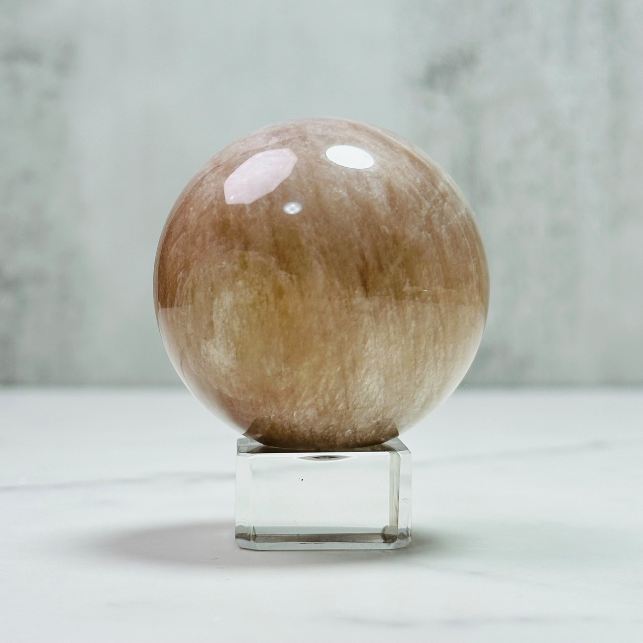 ミルクティのような柔らかいベージュカラーで、手の中でくるくる回すと驚くほど美しいシラーがきらめきはじめます。手に取るたびに変化する表情は、まるで月の光を閉じ込めたかのように神秘的でムーンストーンならではの魅力があります。、光の反射によって浮かび上がる光がなんとも幻想的で夢見心地にさせてくれます。