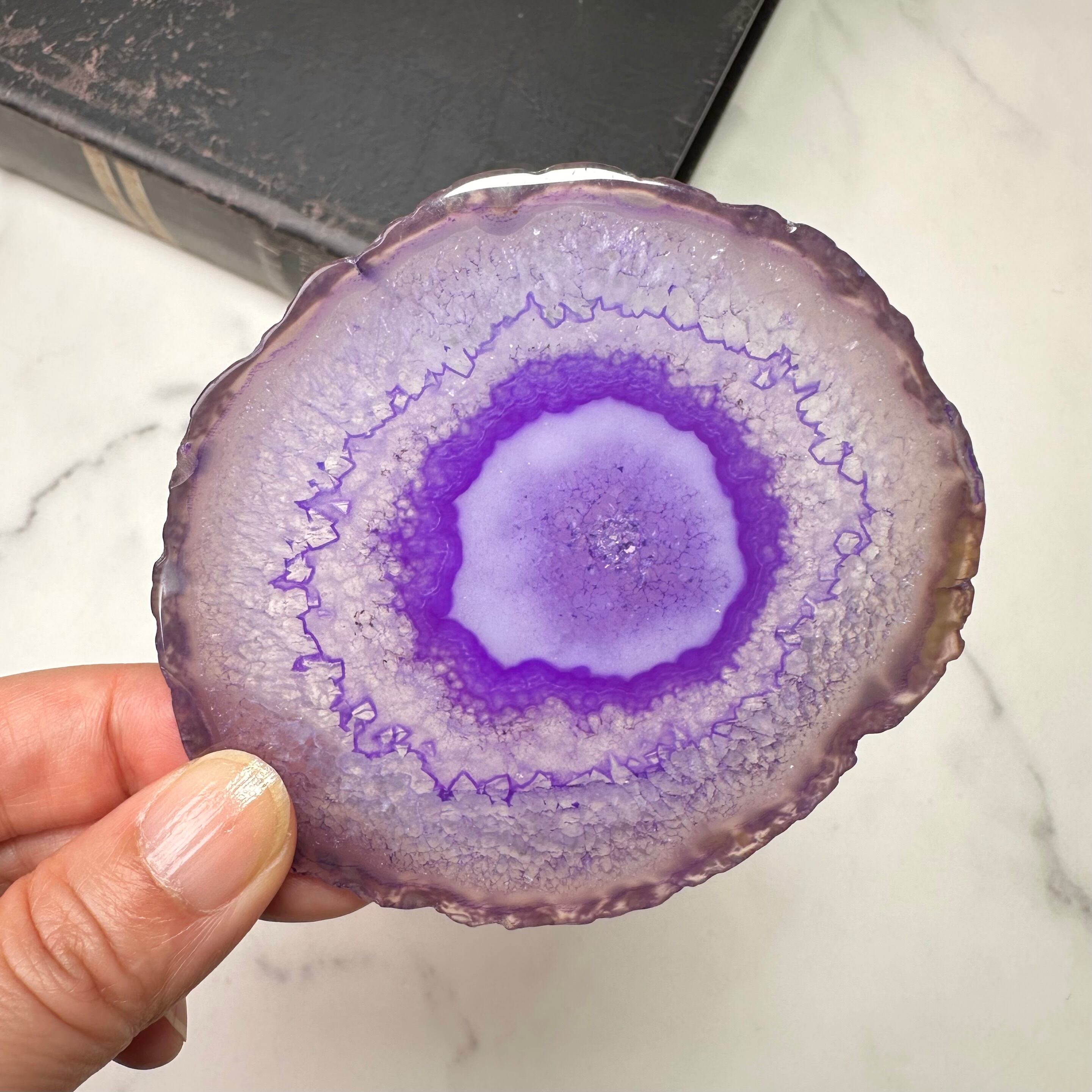 おしゃれなインテリアとしてお部屋の雰囲気を格上げしてくれる鮮やかなパープルのアゲートプレートです。天然石ならではの模様と色合いが、お部屋に上質な癒しと彩りを添えてくれます。キャンドルやアクセサリートレイとして、またコースターとしてもお使いいただけます。自然の恵みが宿る一枚で、毎日の暮らしにほっとするひとときを取り入れてみませんか?