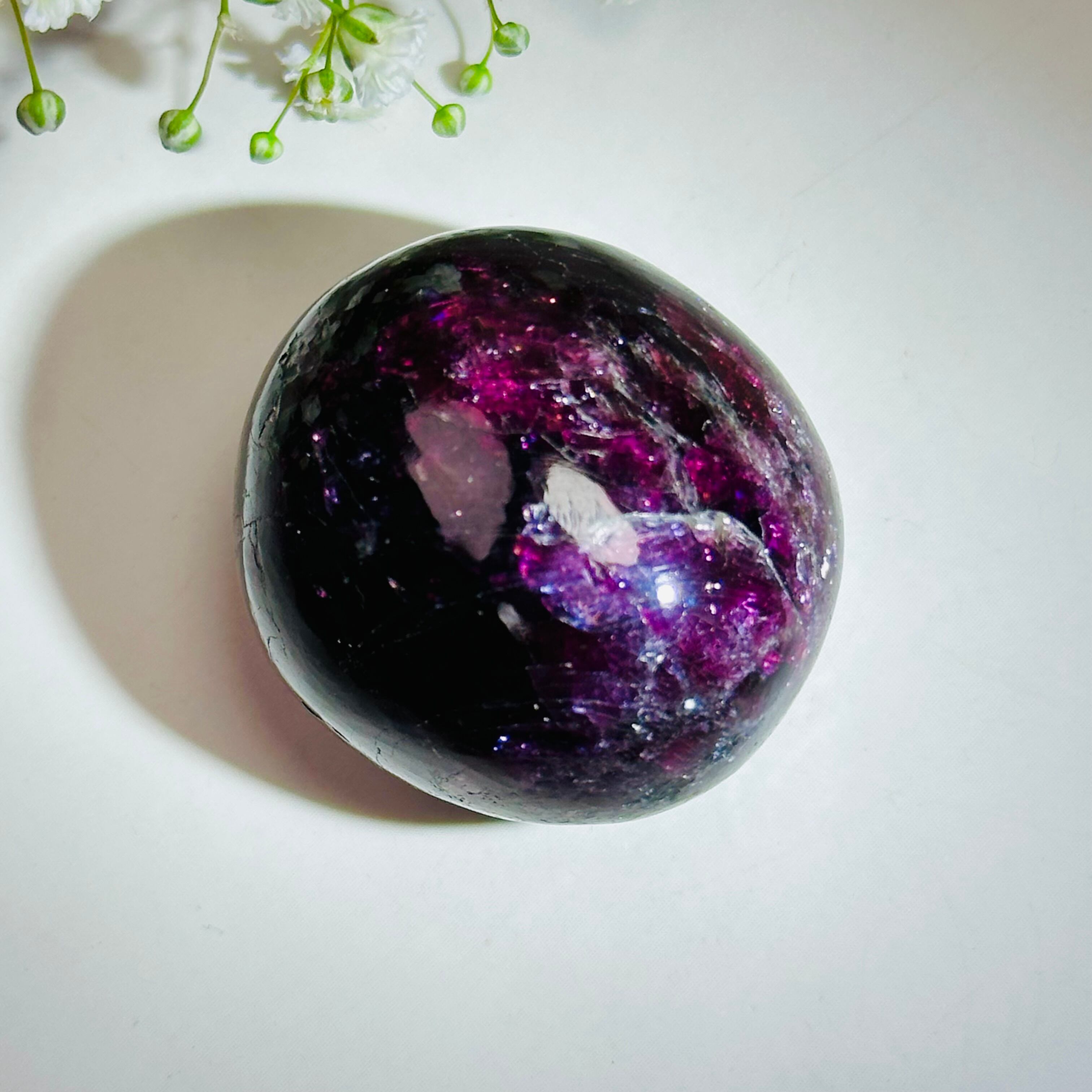 深みのある赤い結晶が綺麗なインド産のガーネットタンブル。神秘的な佇まいですが、ひとたびその身に光を受けると高貴な美しさに心を奪われます。