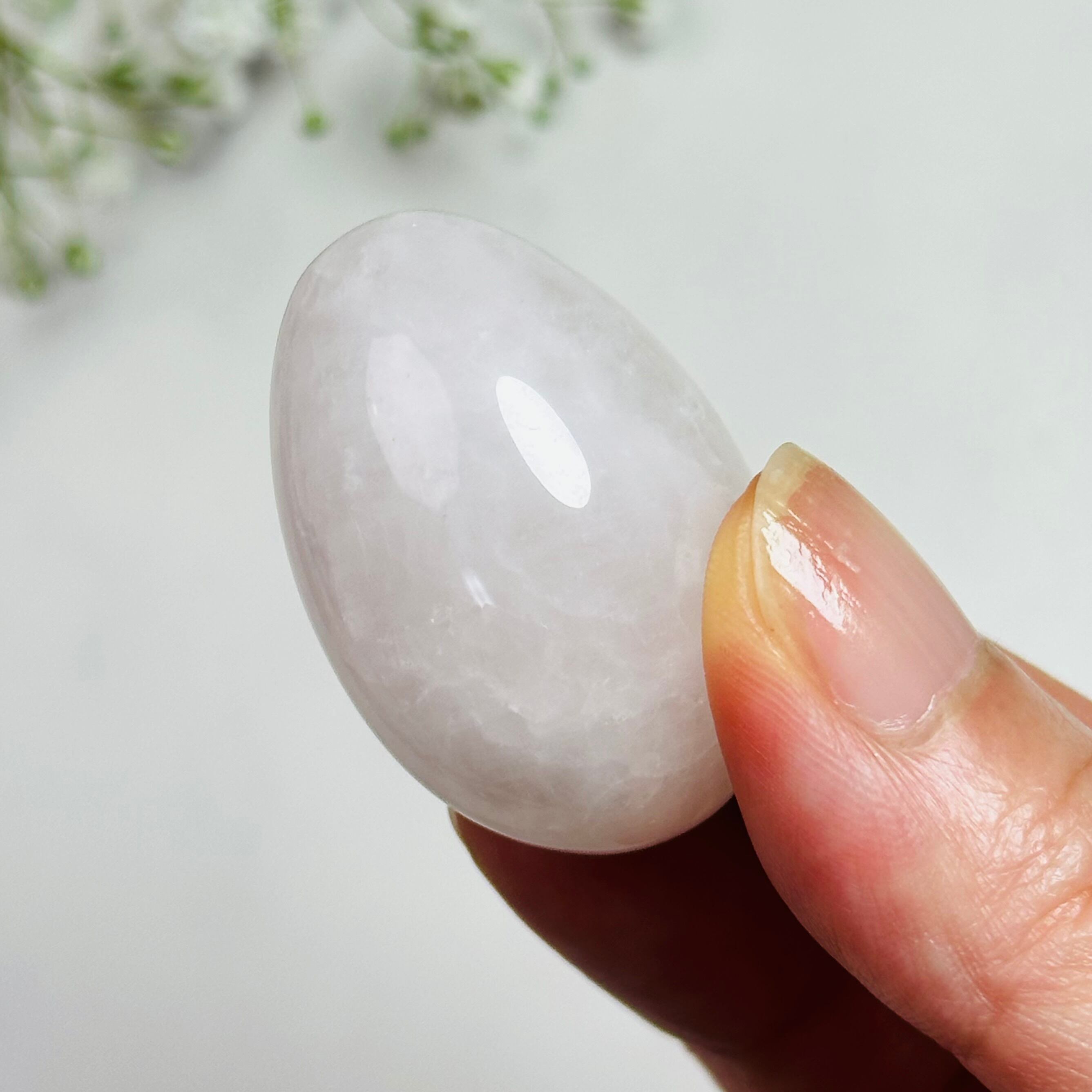 上品なローズクォーツのエッグ型ストーンです。ホワイトに近いごくごく淡いピンク色は、大人女性の心を静かに落ち着ける柔らかな波動を放ちます。