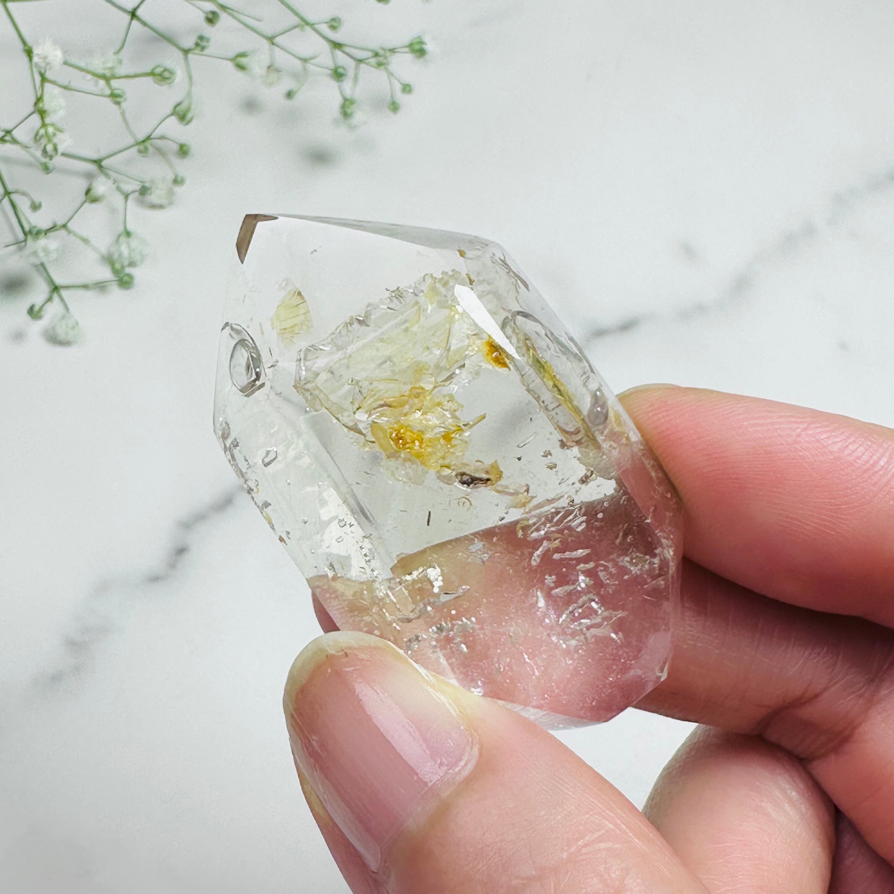 透明感あふれるクリアな水晶の中に、やわらかな黄金色が美しく広がります。内部には、長い年月を経て閉じ込められた天然の水が静かに宿っています。光に透かすと黄金色の輝きと共に、水泡がきらめき、時折ゆったりとゆらめきます。唯一無二の特別なこのピースは、自分自身の宝物として、また大切な方への贈り物にもおすすめです。