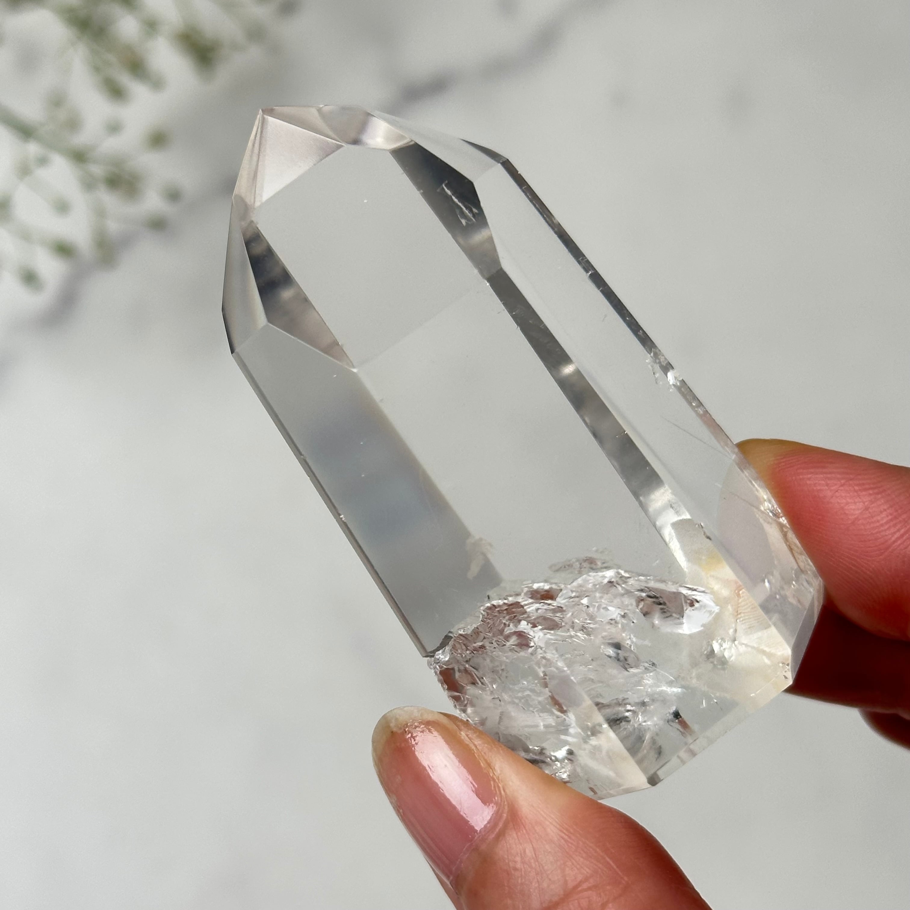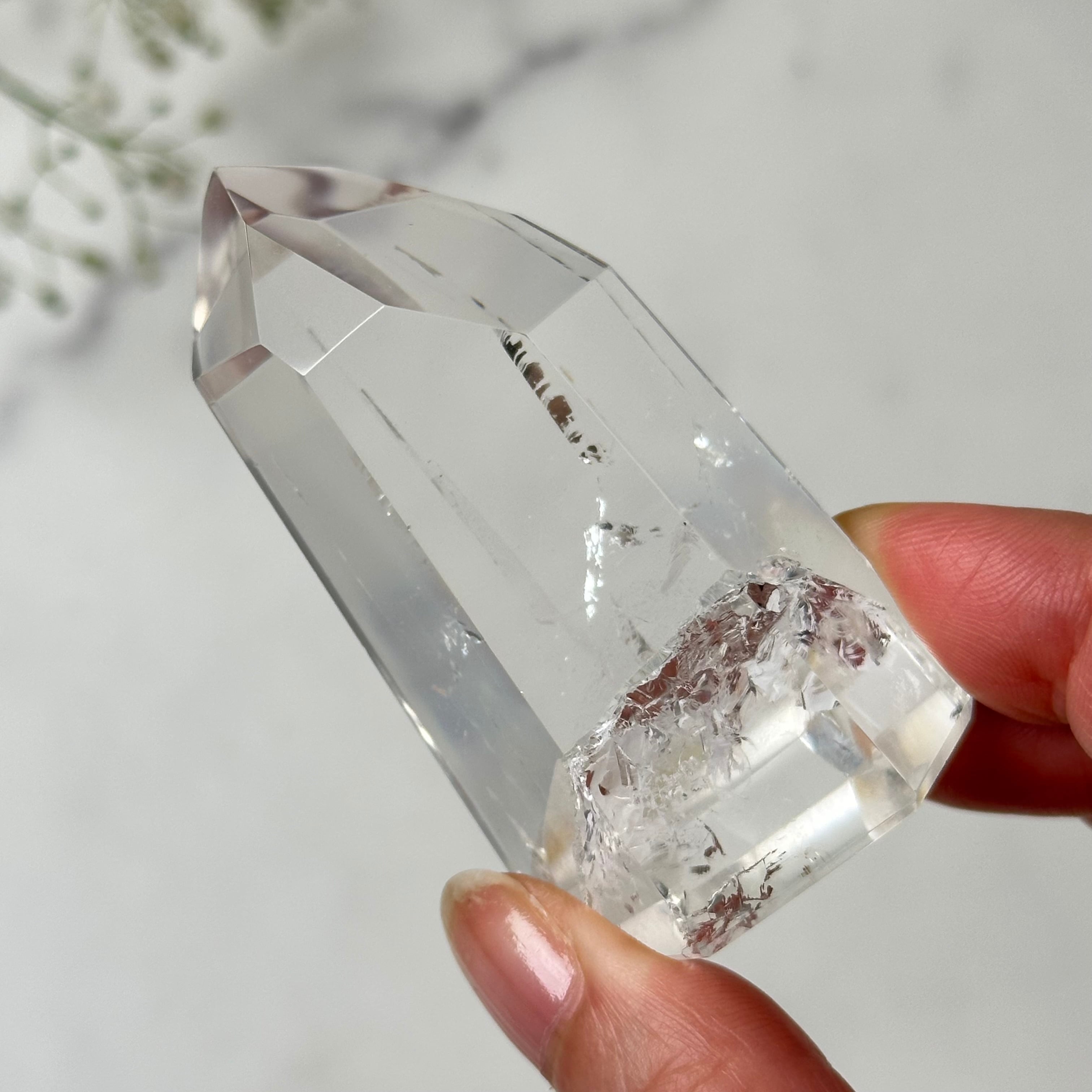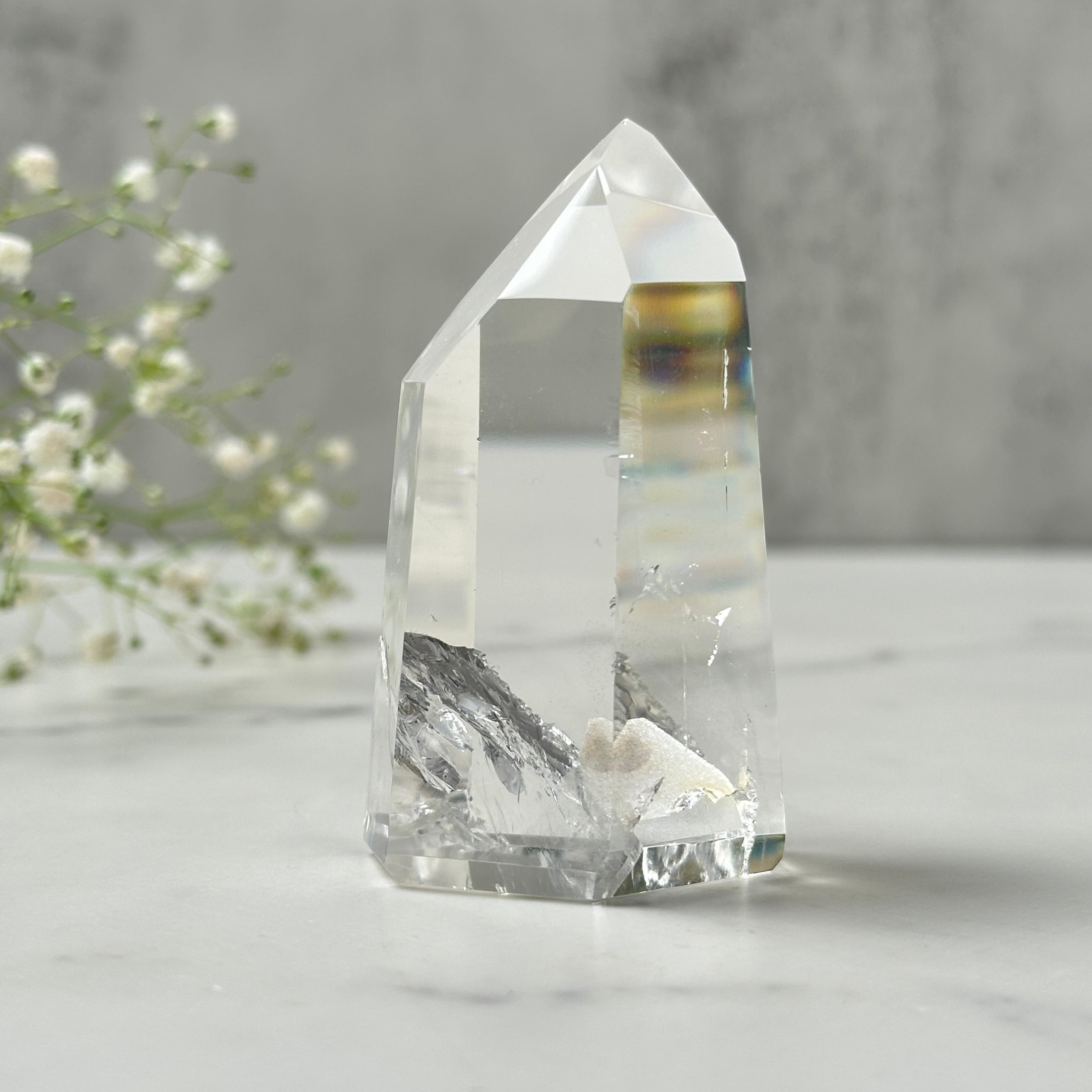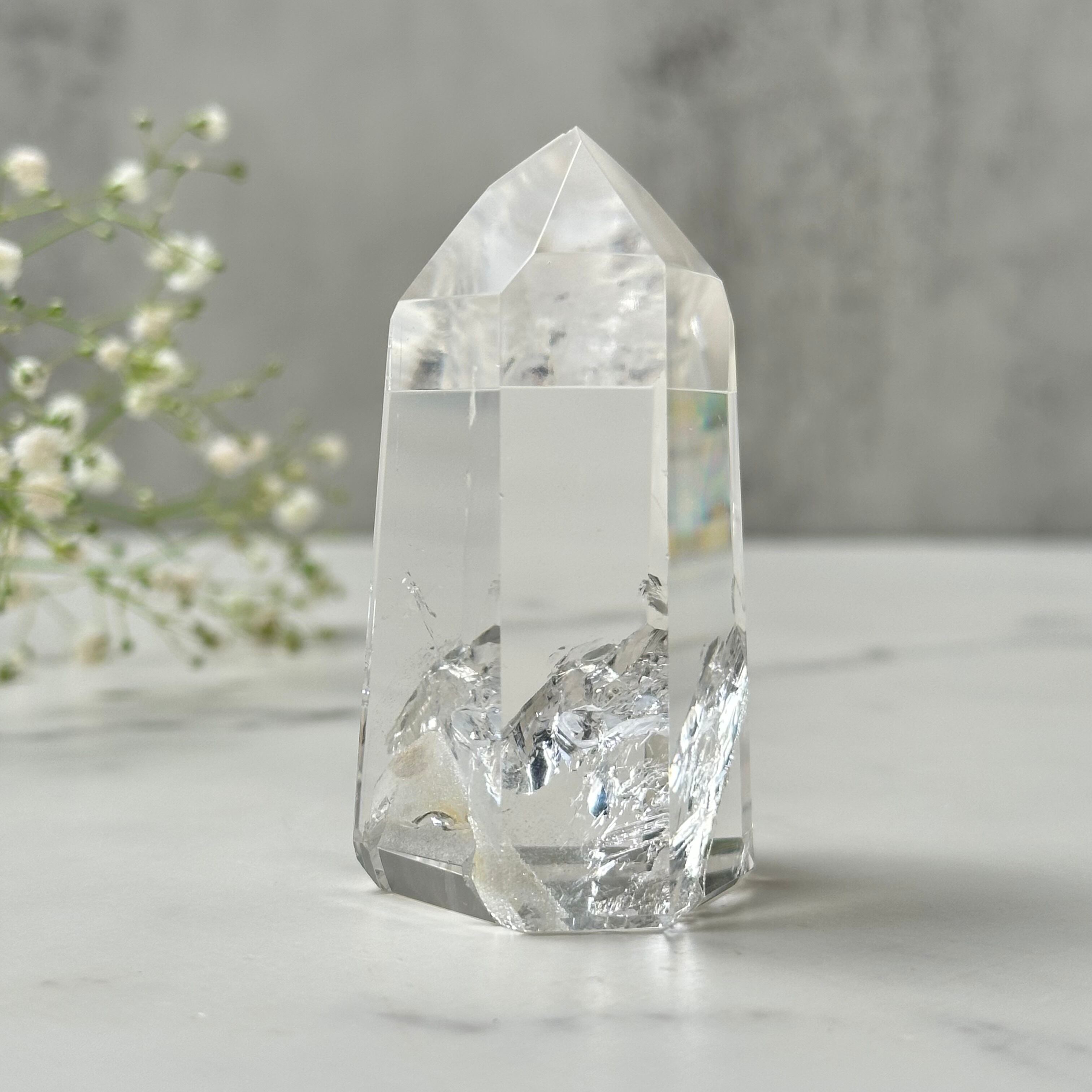 ブラジル・バイーア州セントセ産の希少なレムリアンクォーツを、美しいタワー形に研磨しました。透明感の高い水晶の中に柔らかな光が差し込み、静かな輝きを放ちます。トップはどこまでもクリアで、ボトムには白いホワイトファントムが雪山のような美しい佇まいを見せてくれます。瞑想やリラックスタイムのお供としてはもちろん、上品なインテリアストーンとしてもおすすめです。