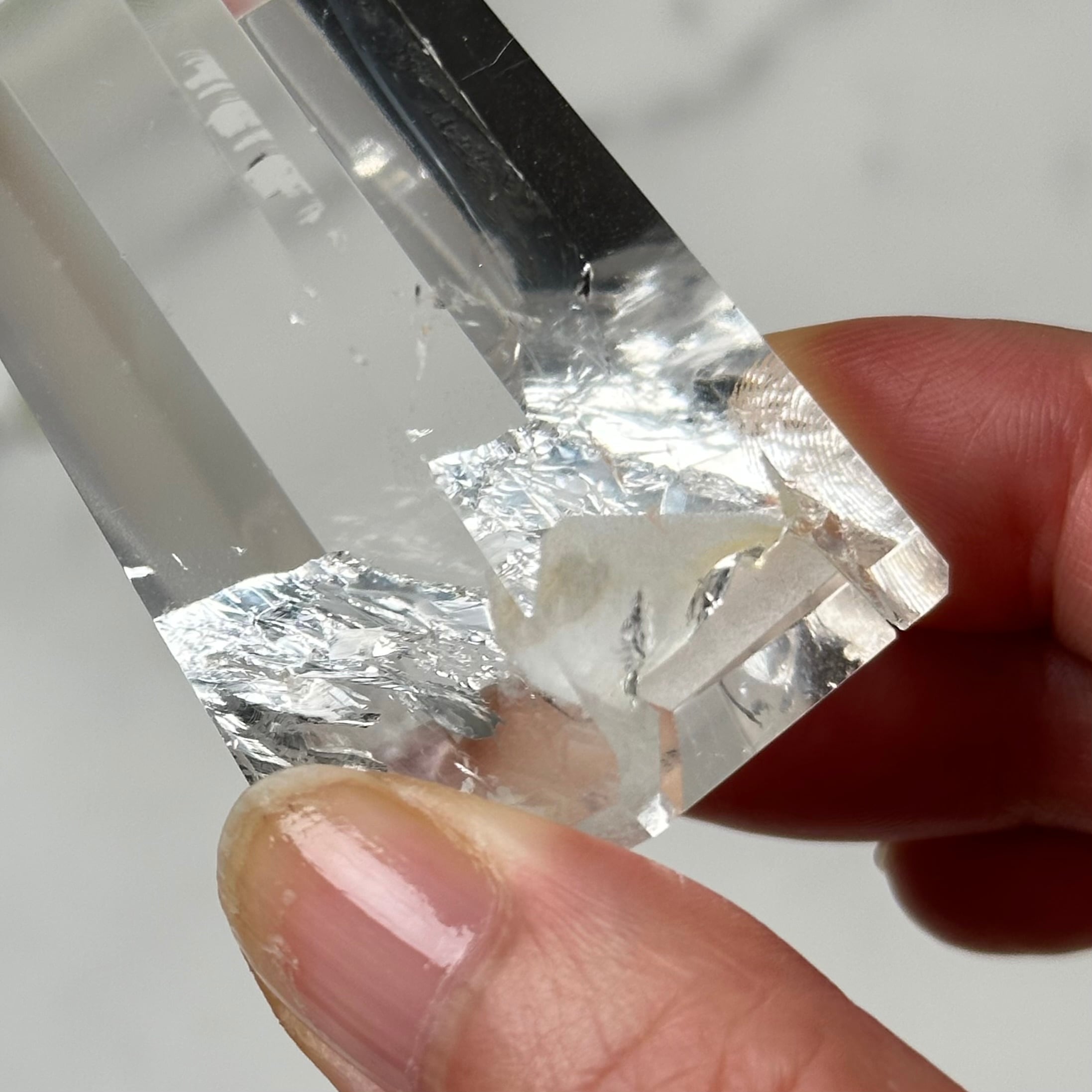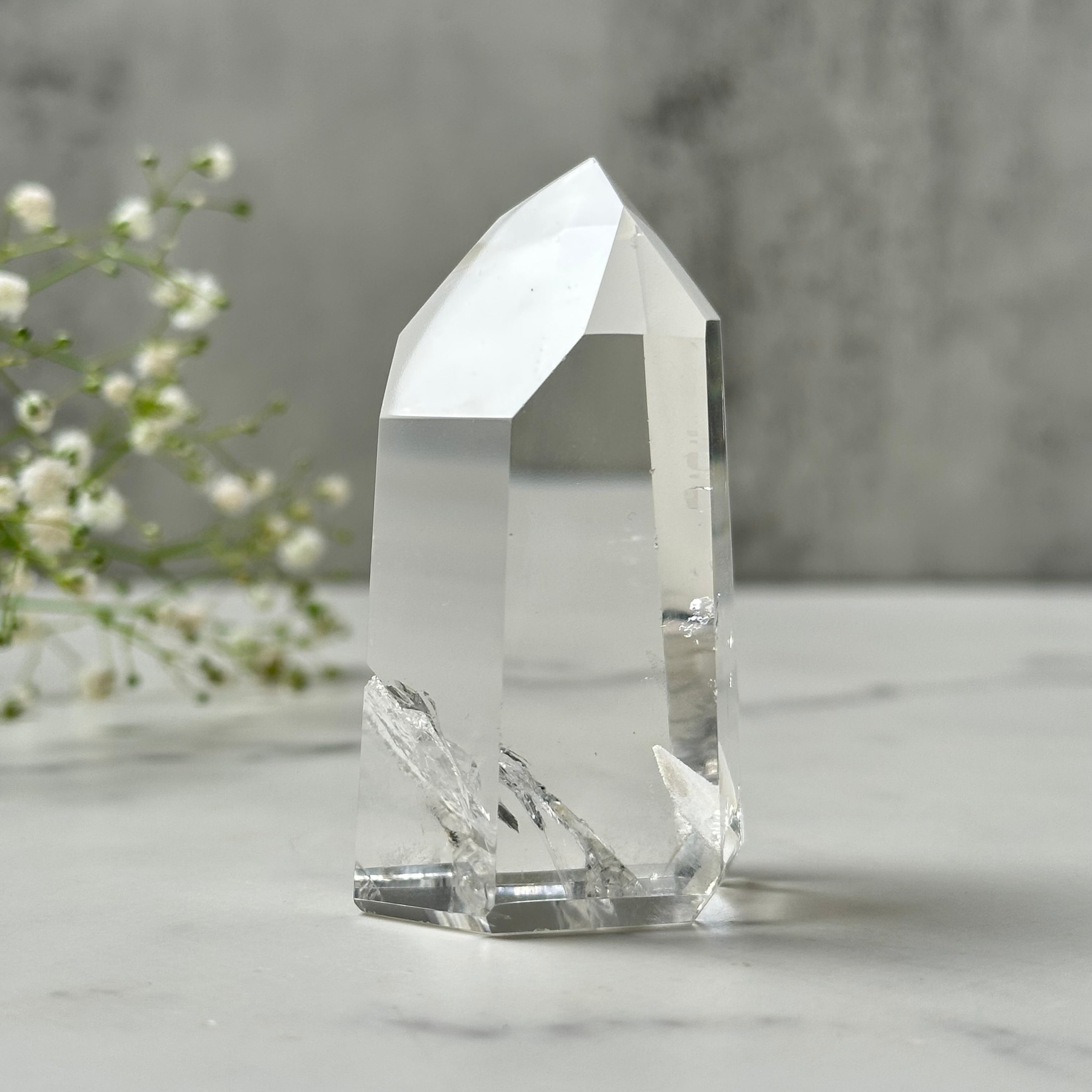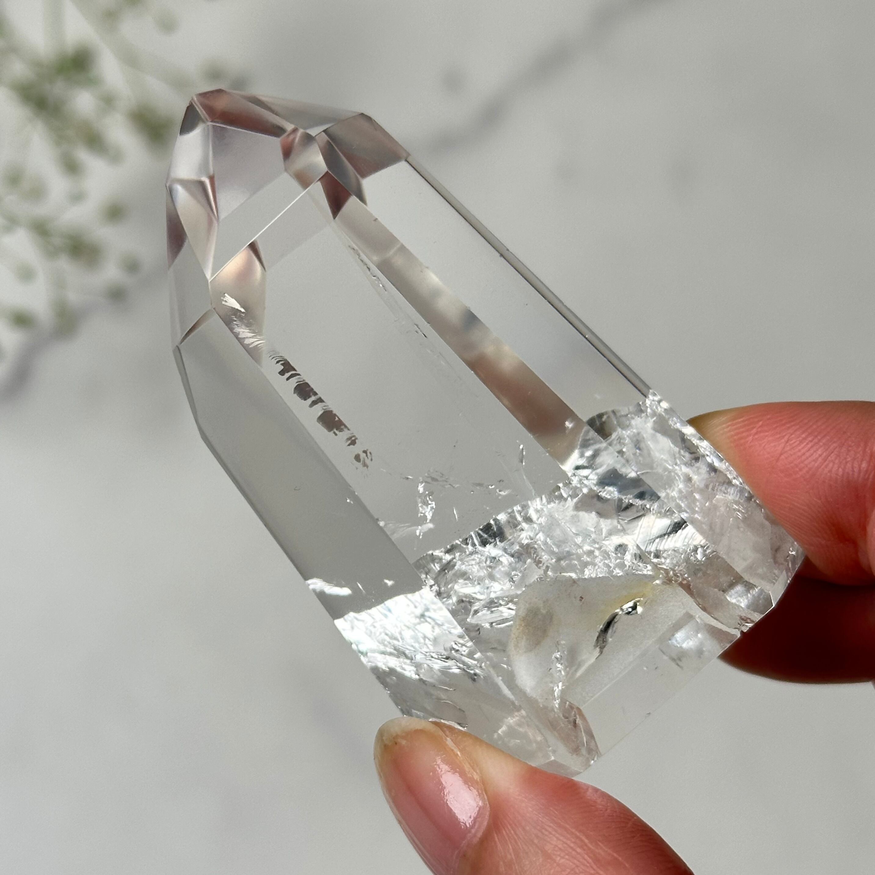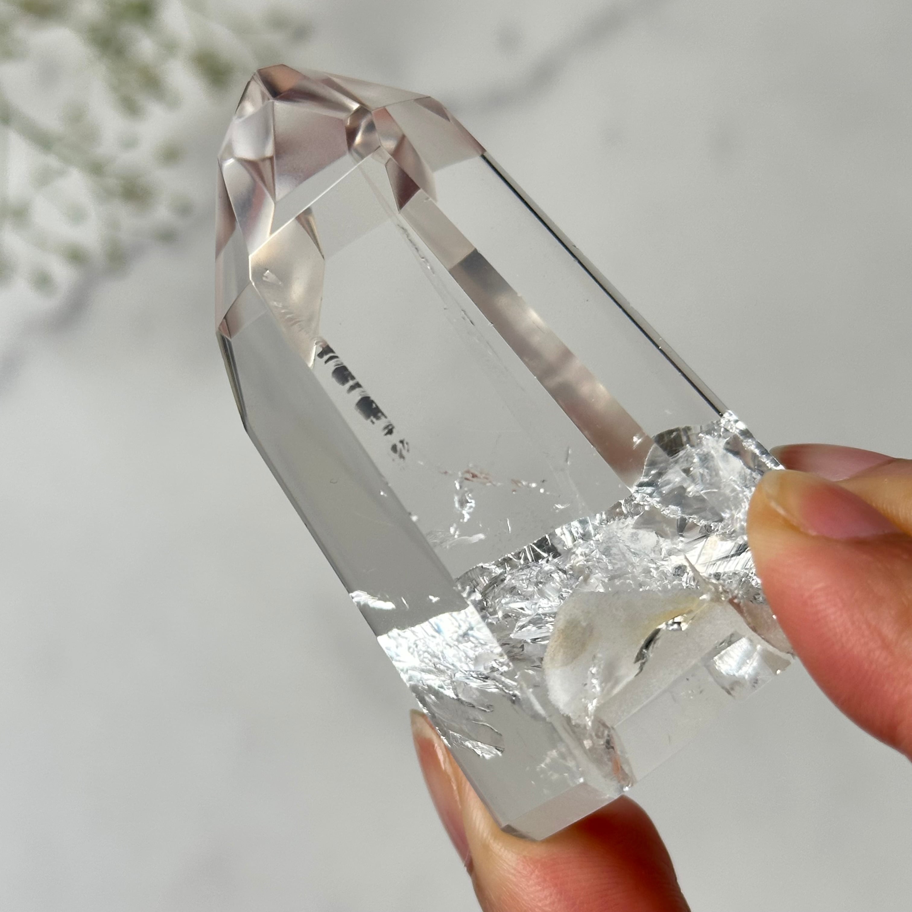ブラジル・バイーア州セントセ産の希少なレムリアンクォーツを、美しいタワー形に研磨しました。透明感の高い水晶の中に柔らかな光が差し込み、静かな輝きを放ちます。トップはどこまでもクリアで、ボトムには白いホワイトファントムが雪山のような美しい佇まいを見せてくれます。瞑想やリラックスタイムのお供としてはもちろん、上品なインテリアストーンとしてもおすすめです。
