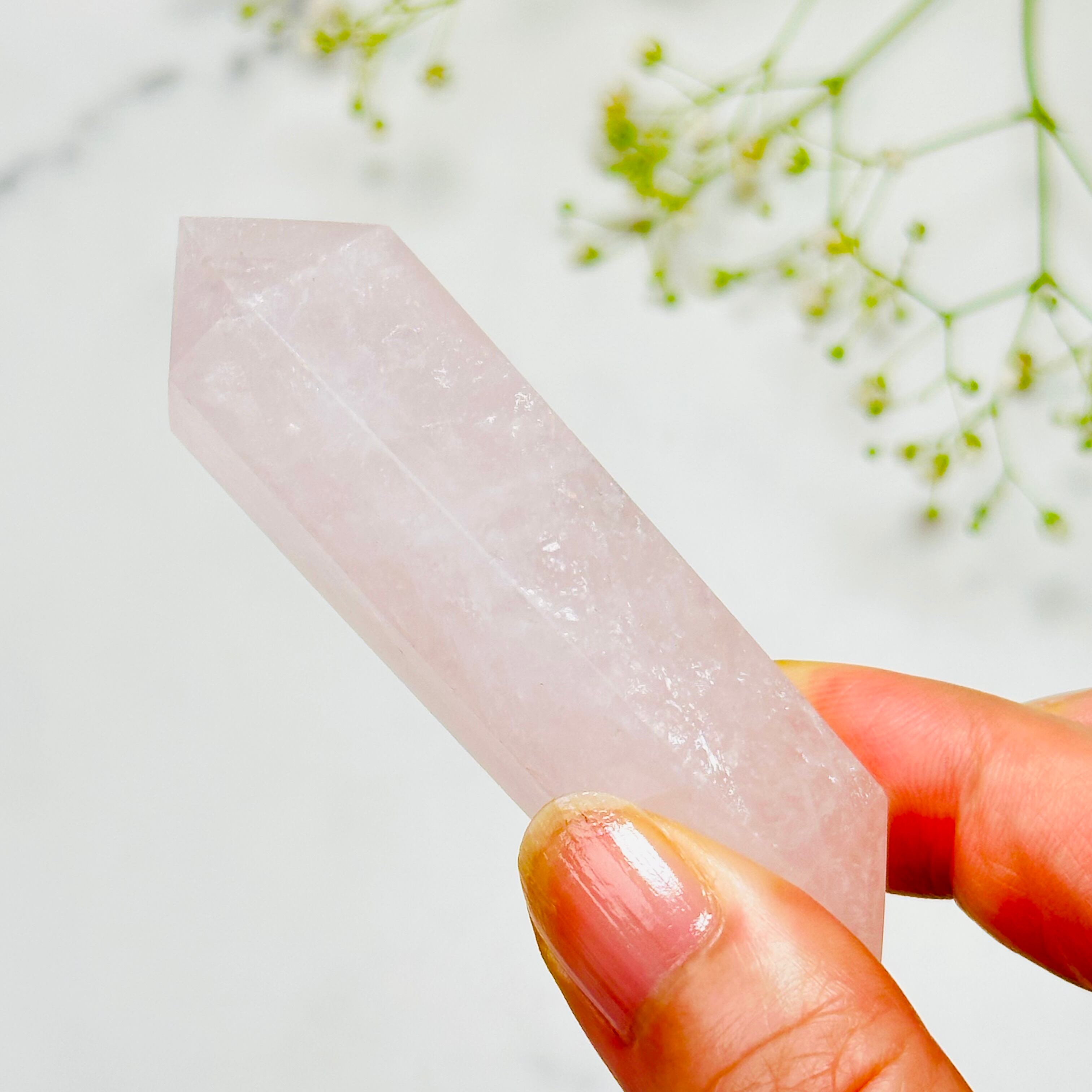 淡く優しいピンク色が魅力のローズクォーツを、両端が美しく尖ったダブルポイントに仕上げました。ダブルポイントは一方から受け取ったエネルギーをもう一方に伝え、反対方向に流すとされます。インプット(受け取る)とアウトプット(与える)のバランスを整える象徴でもあります。瞑想やリラックスタイムのお供に最適で握りやすい形状に仕上げました。恋人や家族など、大切な人との心の交流を深めるお守りとしてもおすすめです。