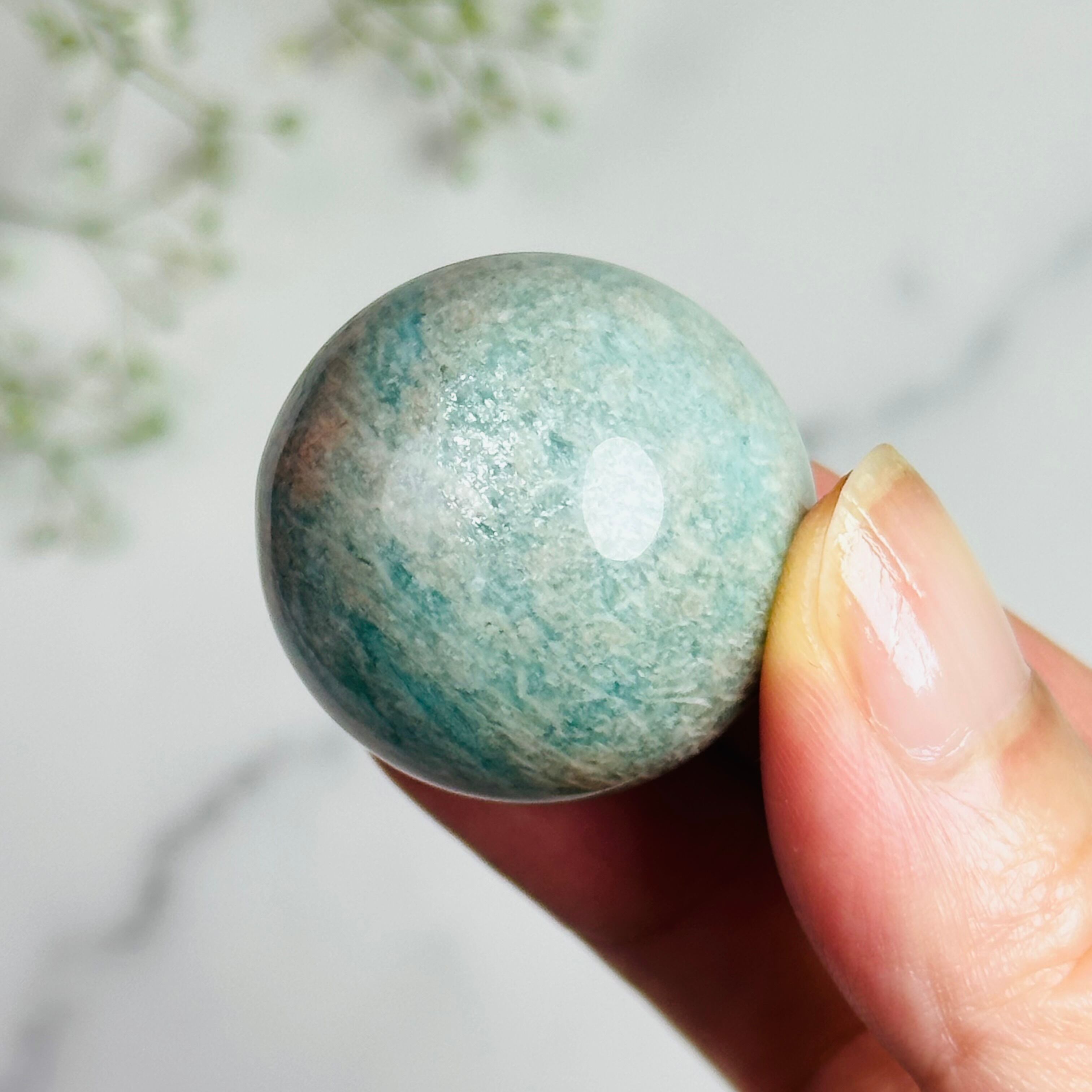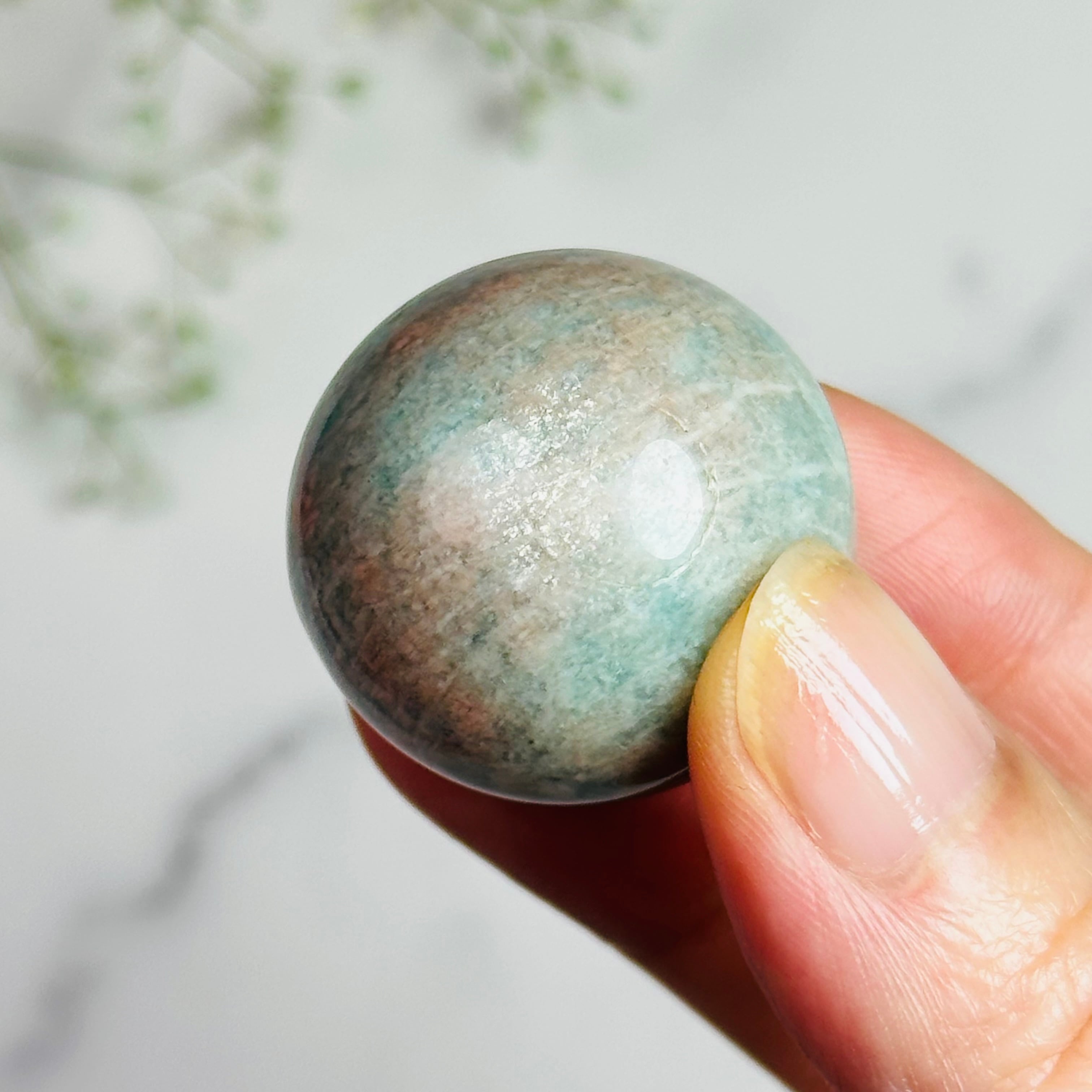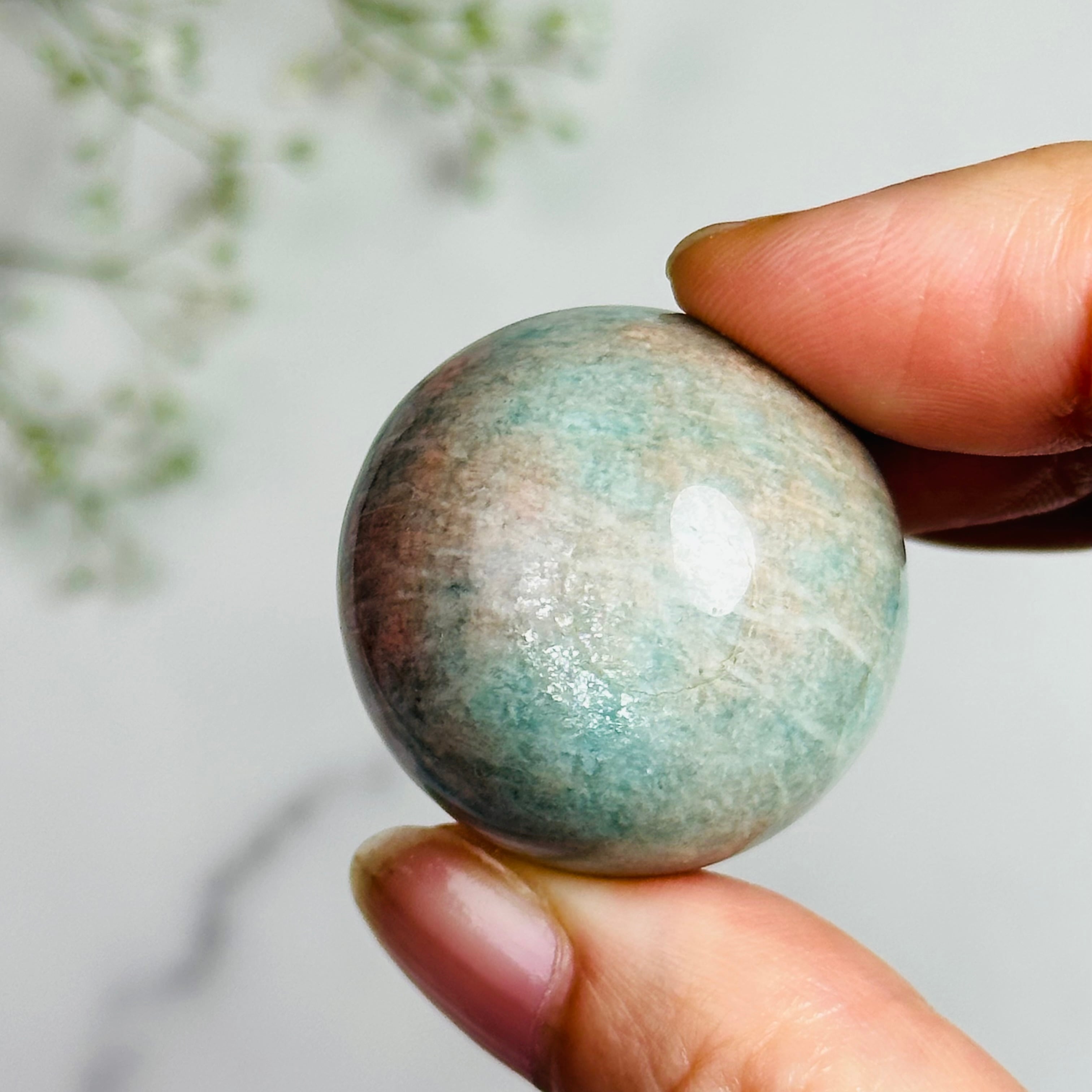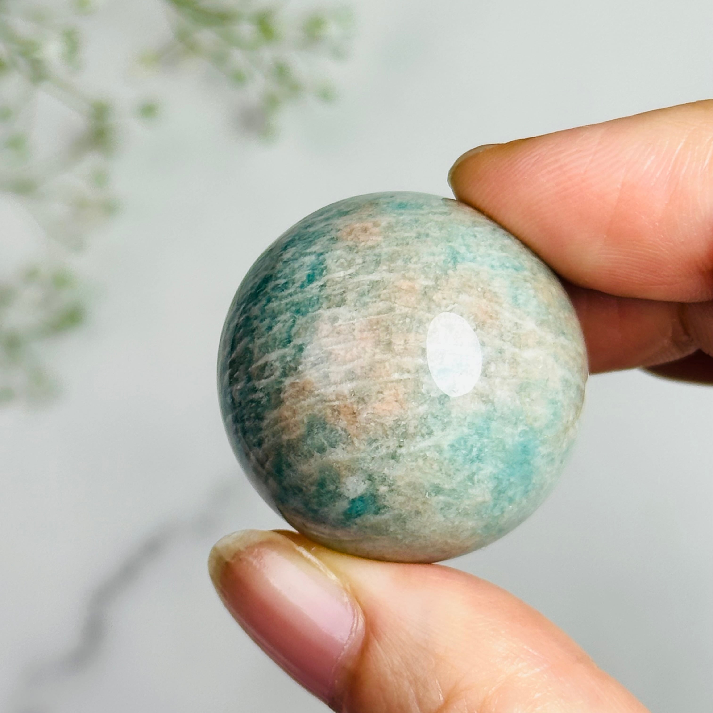 ほんのりピンクが混ざったグリーンのアマゾナイトスフィアです。