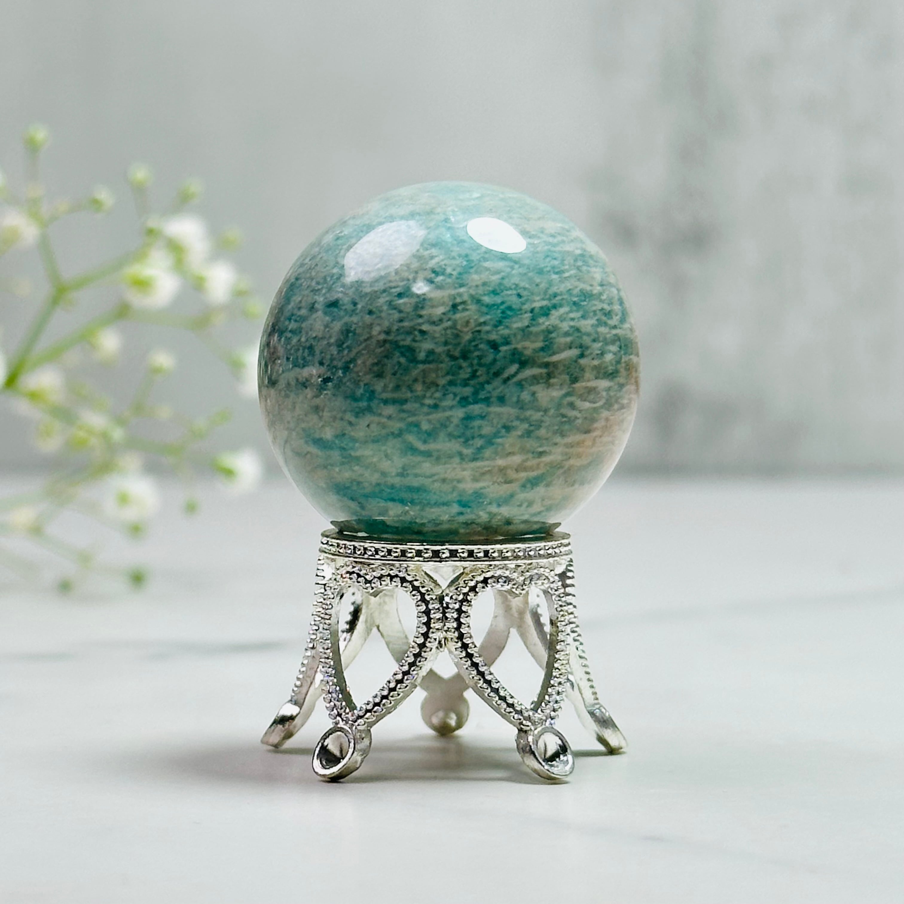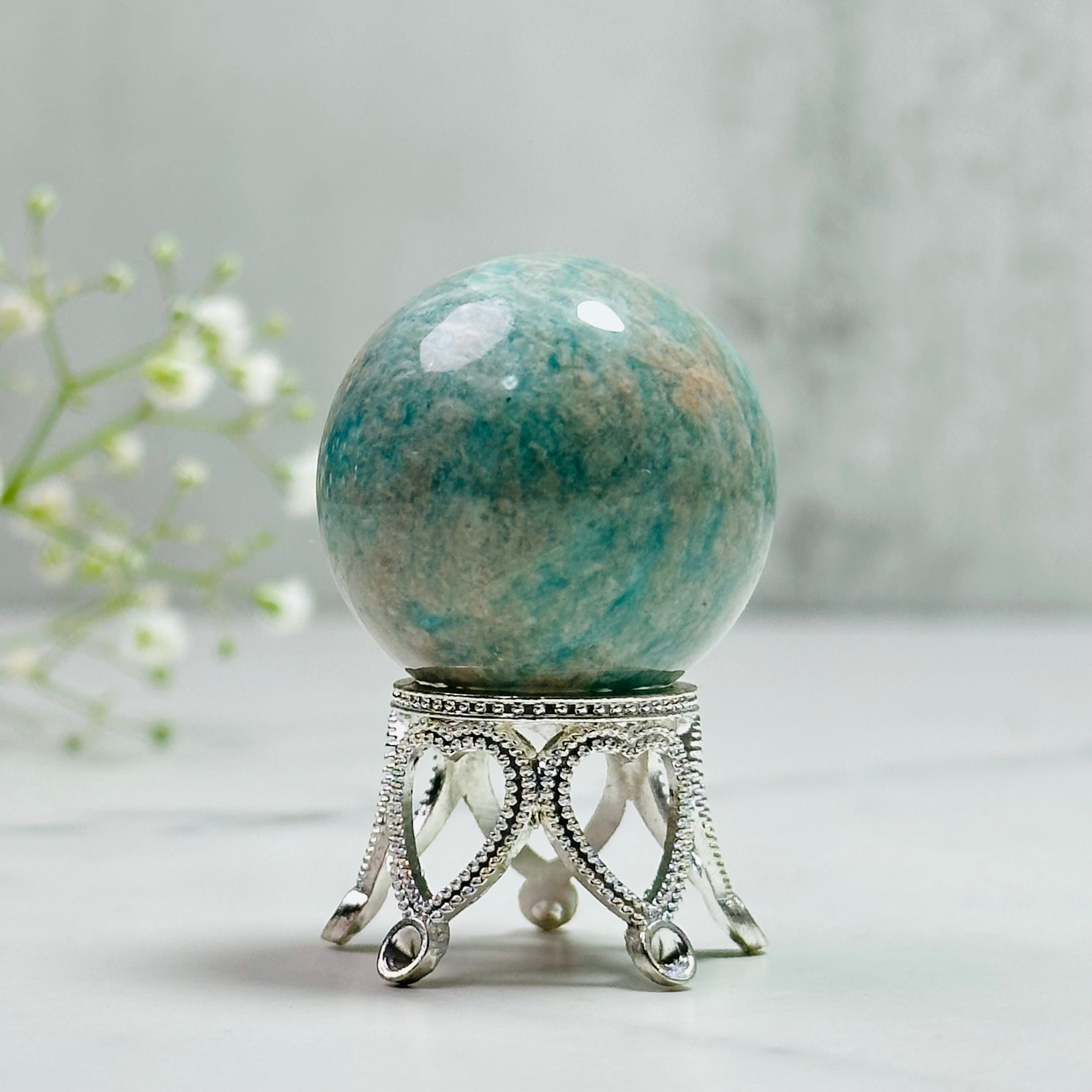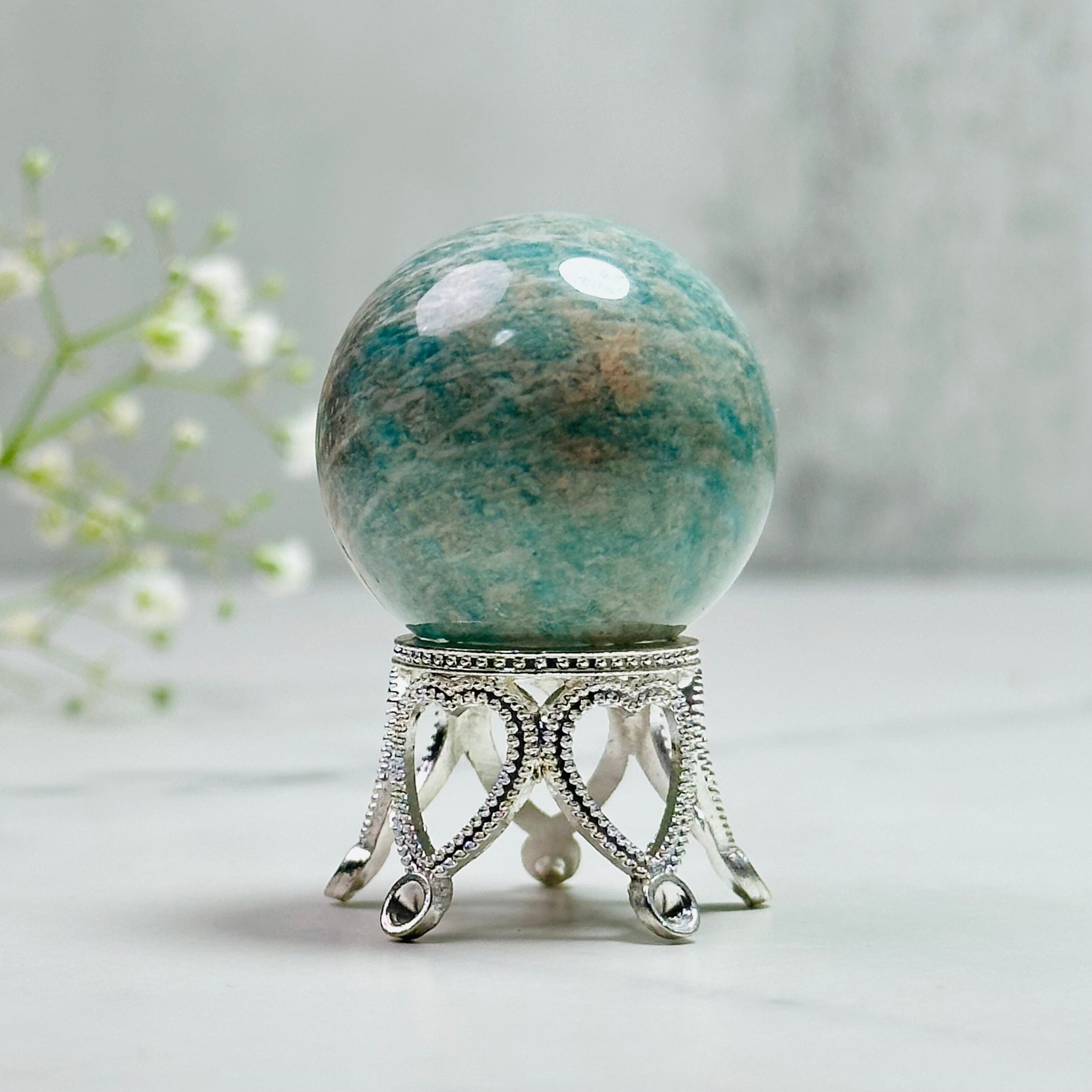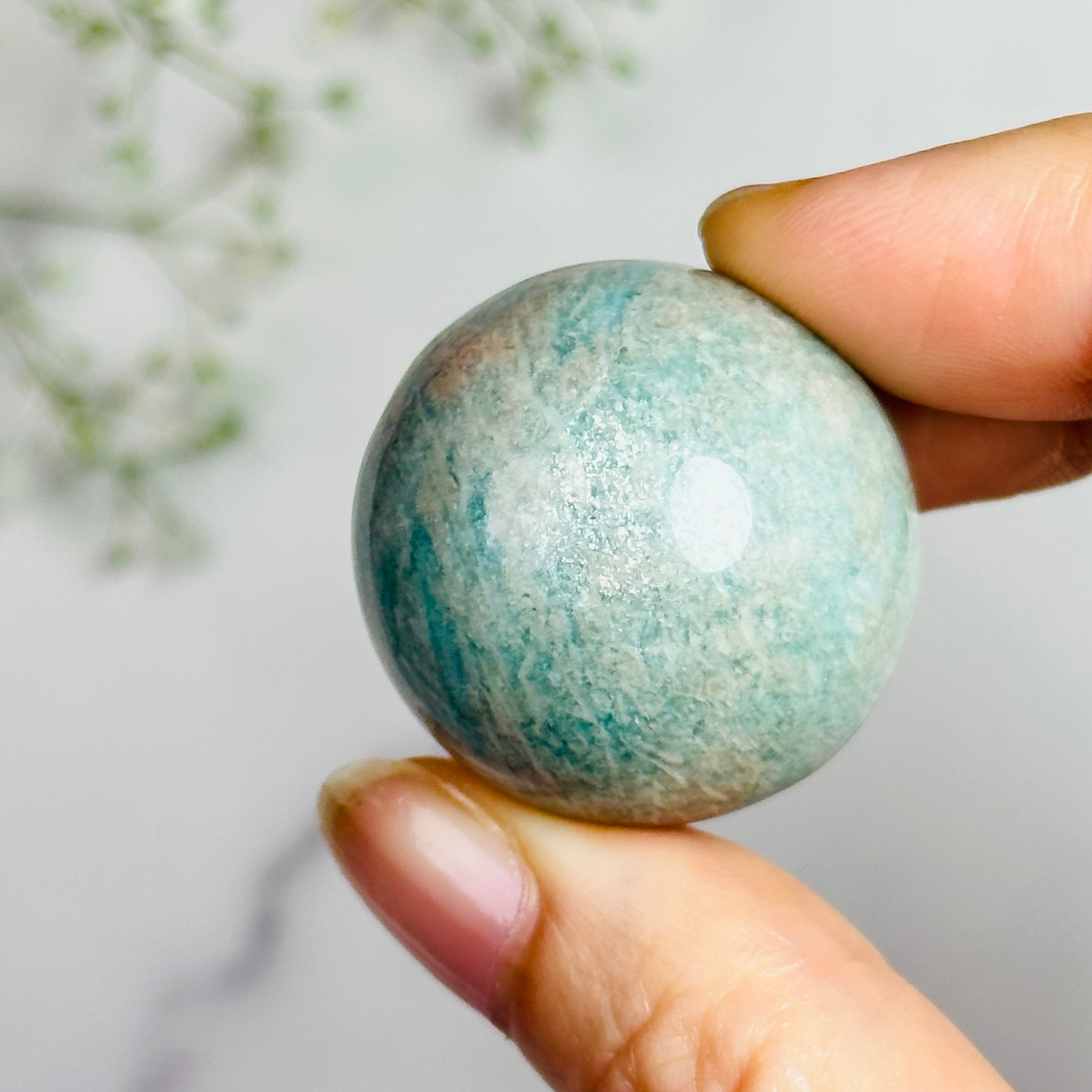 ほんのりピンクが混ざったグリーンのアマゾナイトスフィアです。