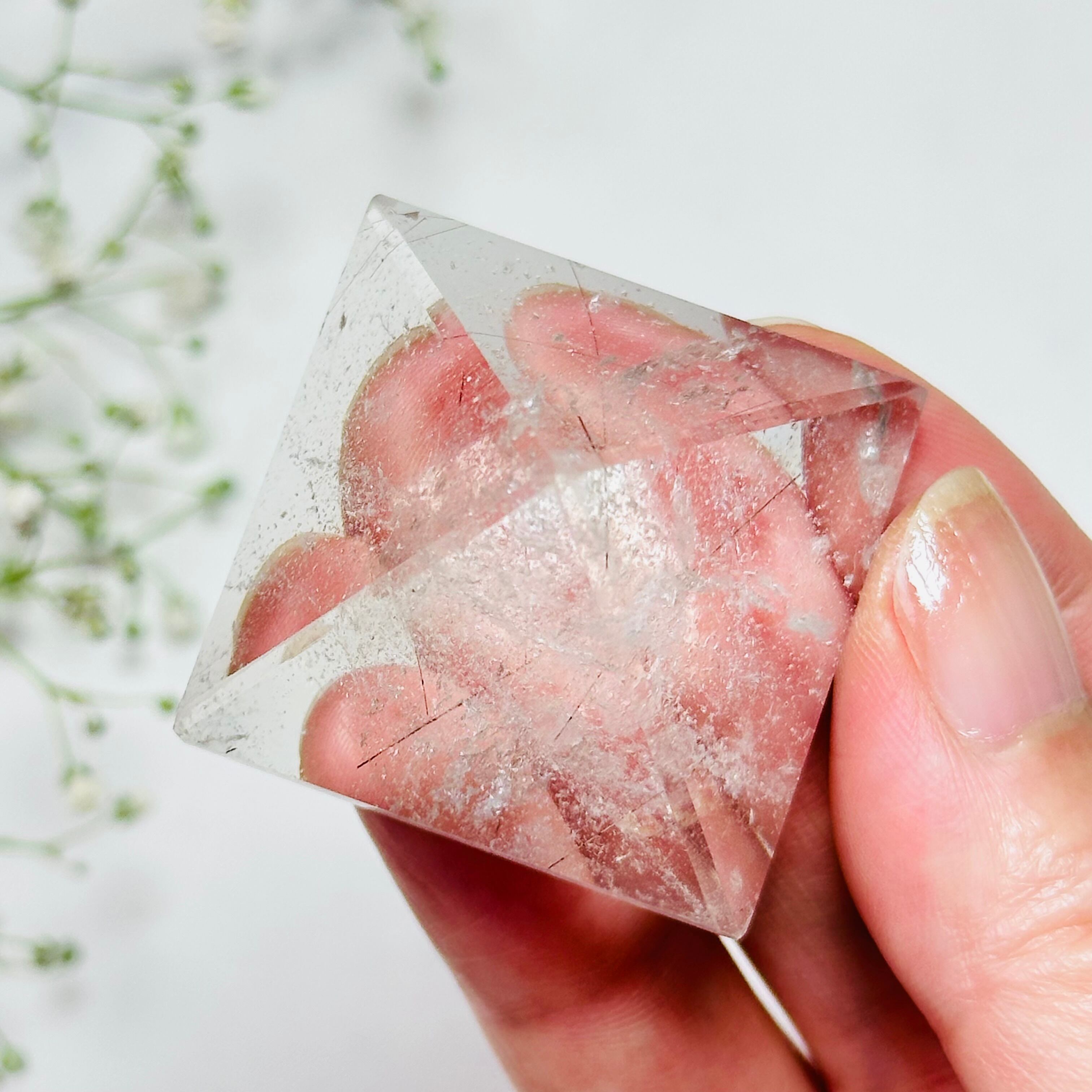ブラジル産水晶の中に、銅ルチル((コッパールチル・金紅石)を内包したピラミッド型の天然石。角度を変えるたびにキラリと光る針状のルチルが、神秘的な輝きを放ちます。ピラミッド形状は古代からエネルギーを集め増幅させる形とされ、空間の浄化や集中力アップに効果的。銅ルチルは金運・仕事運を高め、持つ人に活力と行動力を与えるといわれます。インテリア性と開運要素を兼ね備えたアイテムです。