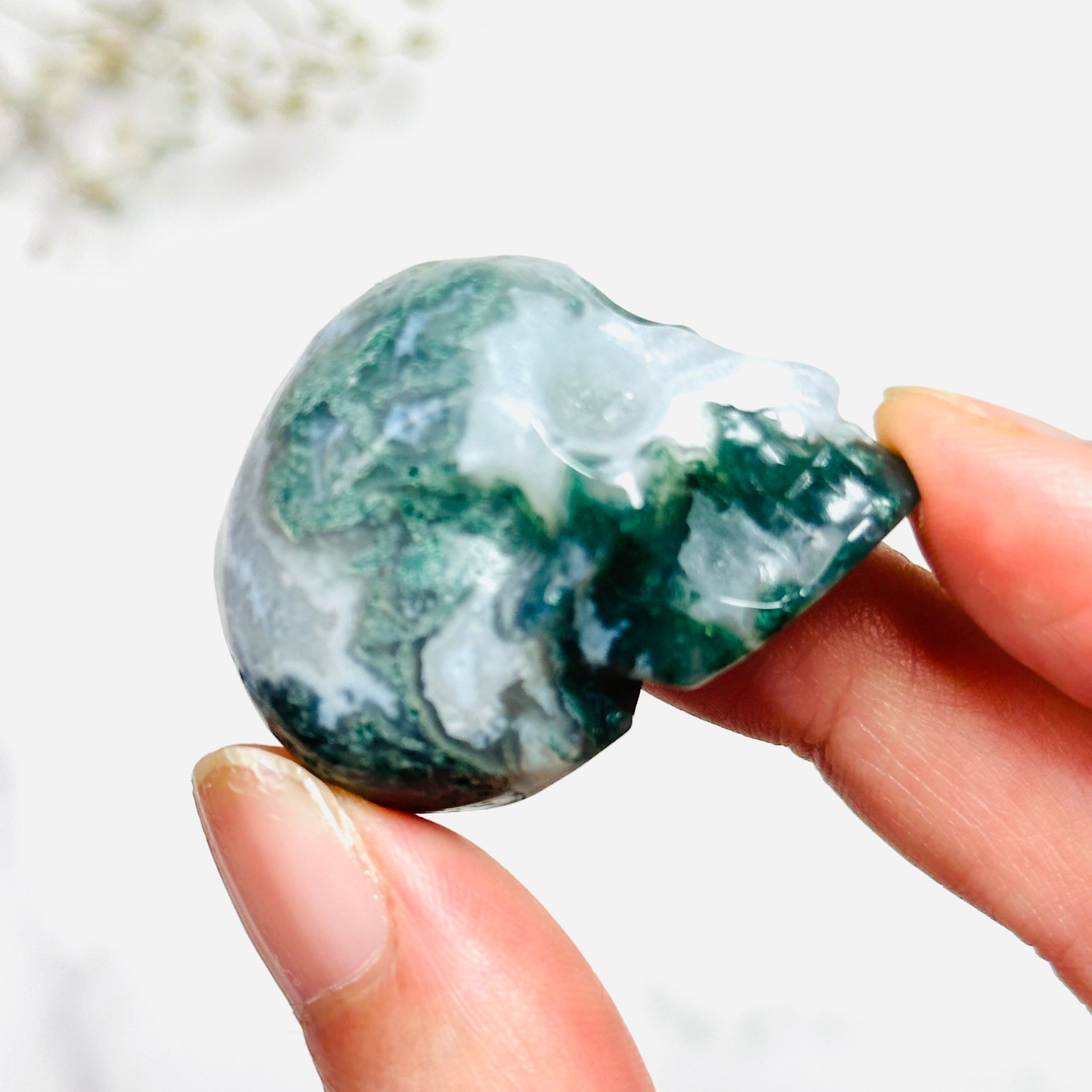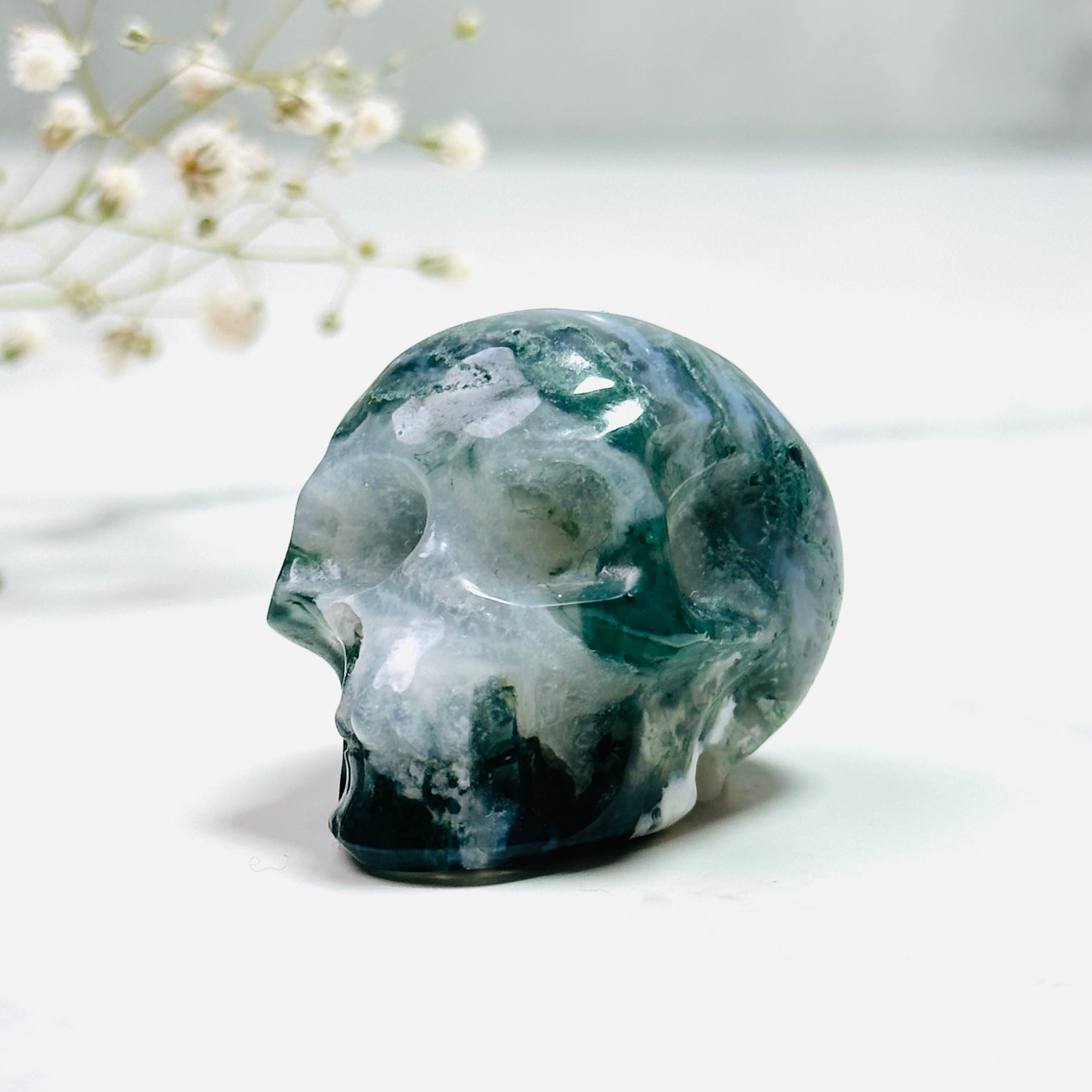 モスアゲートのスカルヘッドです。静かに物思いに耽るその表情は自分の分身のような気がします。