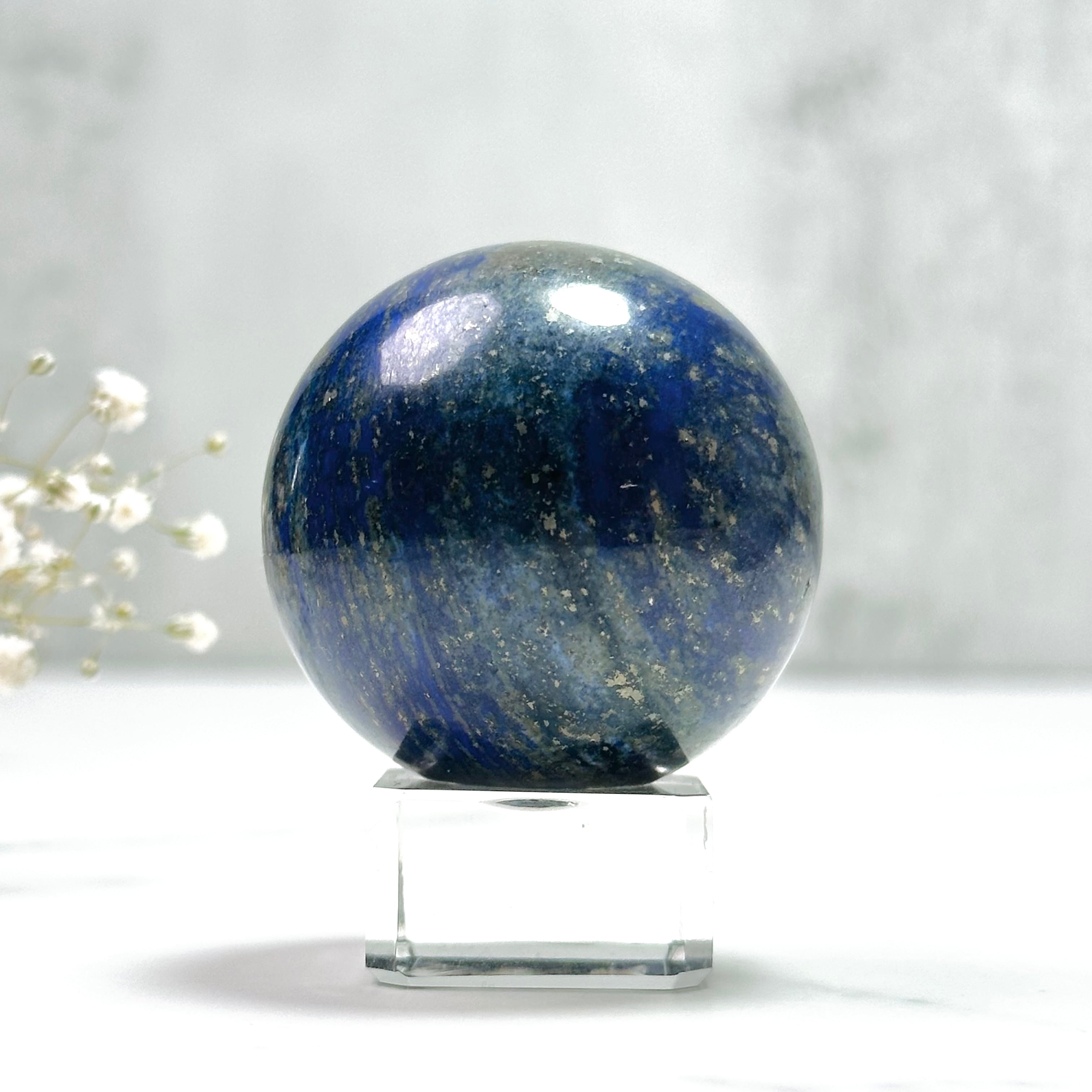 夜空を閉じ込めたような深いブルーが美しいラピスラズリのスフィア。金色のパイライトが星のように輝き、見る角度によって表情が変わります。程よい存在感で、お部屋やデスクに置くだけで空間を格上げ。インテリアとしてはもちろん、瞑想やヒーリングにもおすすめです。