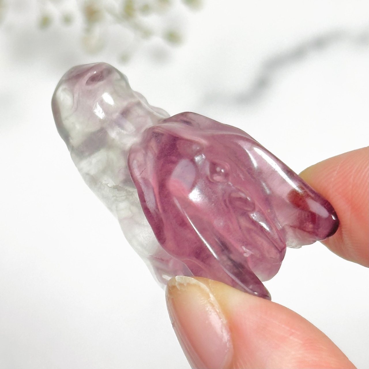 透明感ある明るい色合いが美しい天然石フローライトのドラゴンヘッド。龍は天に昇る存在であり、「出世」「成功」「金運上昇」のシンボルとされます。特にビジネスや新しい挑戦を始める方のお守りとして人気があります。中でも龍の頭部は「知恵」と「力」の源とされ、強い守護のパワーを宿すと信じられています。