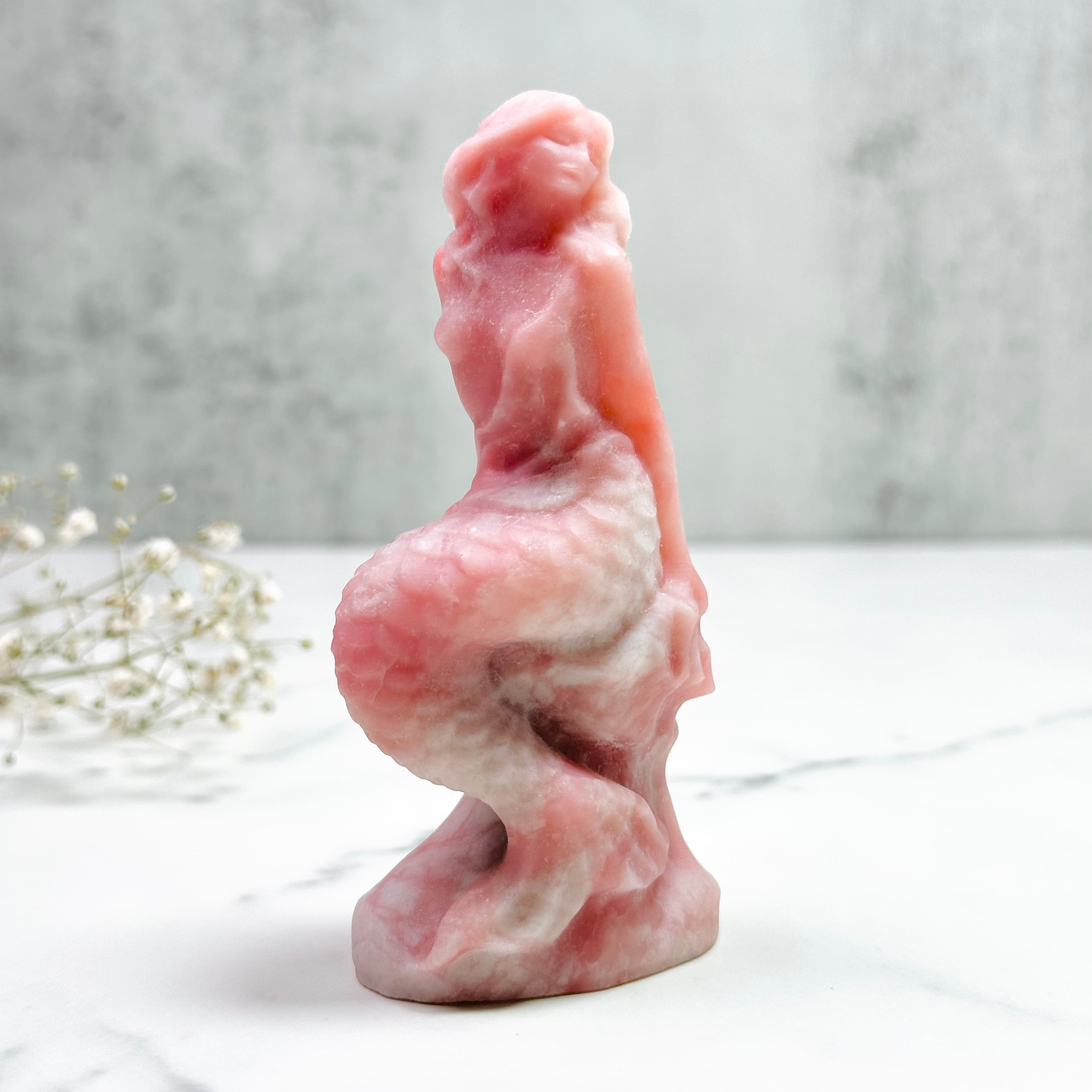 ふんわりとしたピンクが愛らしい、ピンクオパールのマーメイド。優しい色合いが見る人の心を和ませてくれます。デスクや玄関、ベッドサイドに飾るだけで癒しの空間に。女性的で流れるようなフォルムとナチュラルな天然石の組み合わせは、自分へのご褒美や贈り物にもおすすめです。