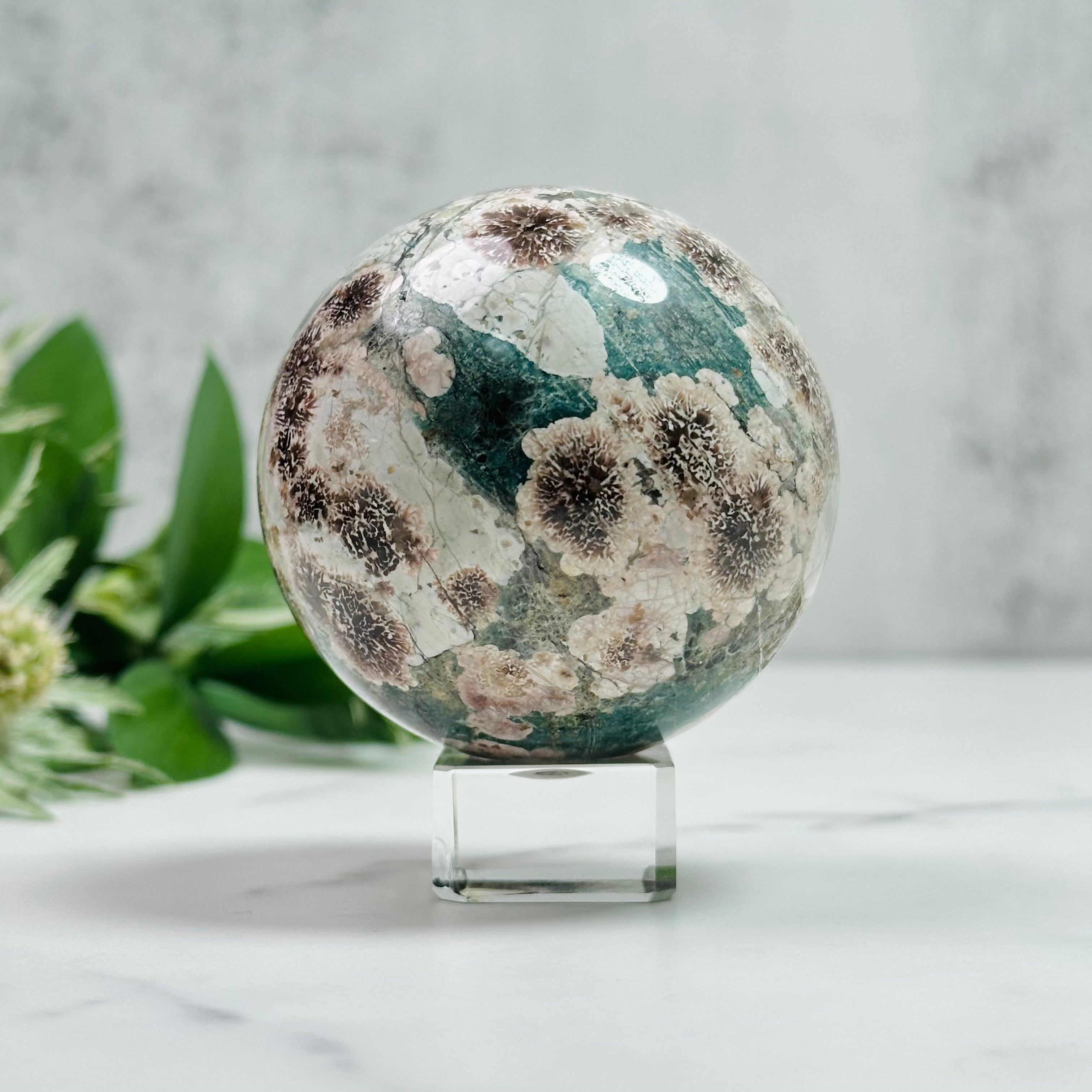 草原のような緑の石にお花の模様が広がるグリーンフラワージャスパーのスフィア。ボタニカルなテイストがナチュラルテイストのお部屋や夏のインテリアにぴったりです。自然の美しさをそのまま表現したようなスフィアは、見るたびにほっとできる癒しのアイテムです。