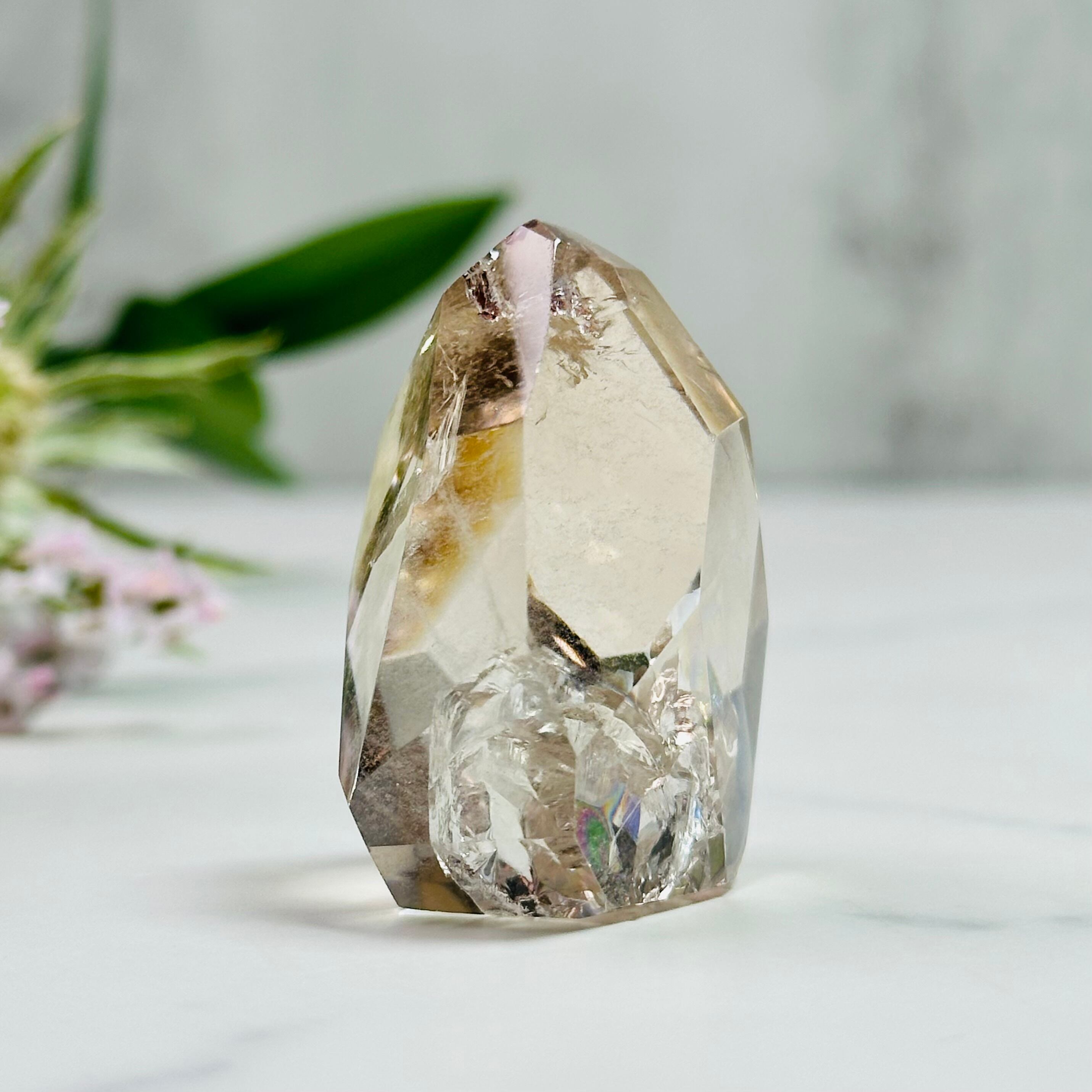 細かく瞬く煌めきが美しい虹入りクォーツフリーフォーム。色合いで光を受けてキラキラと輝きます。内部には幻想的なファントムも見られます。安定感・安心感を与える落ち着いた波動の石で、波だった心をゆっくりと解いて心を鎮めてくれます。タスクに追われる忙しない日々のなかで、ほんのひとときの自分のためだけの時間が、あなたをそっと癒してくれることでしょう。
