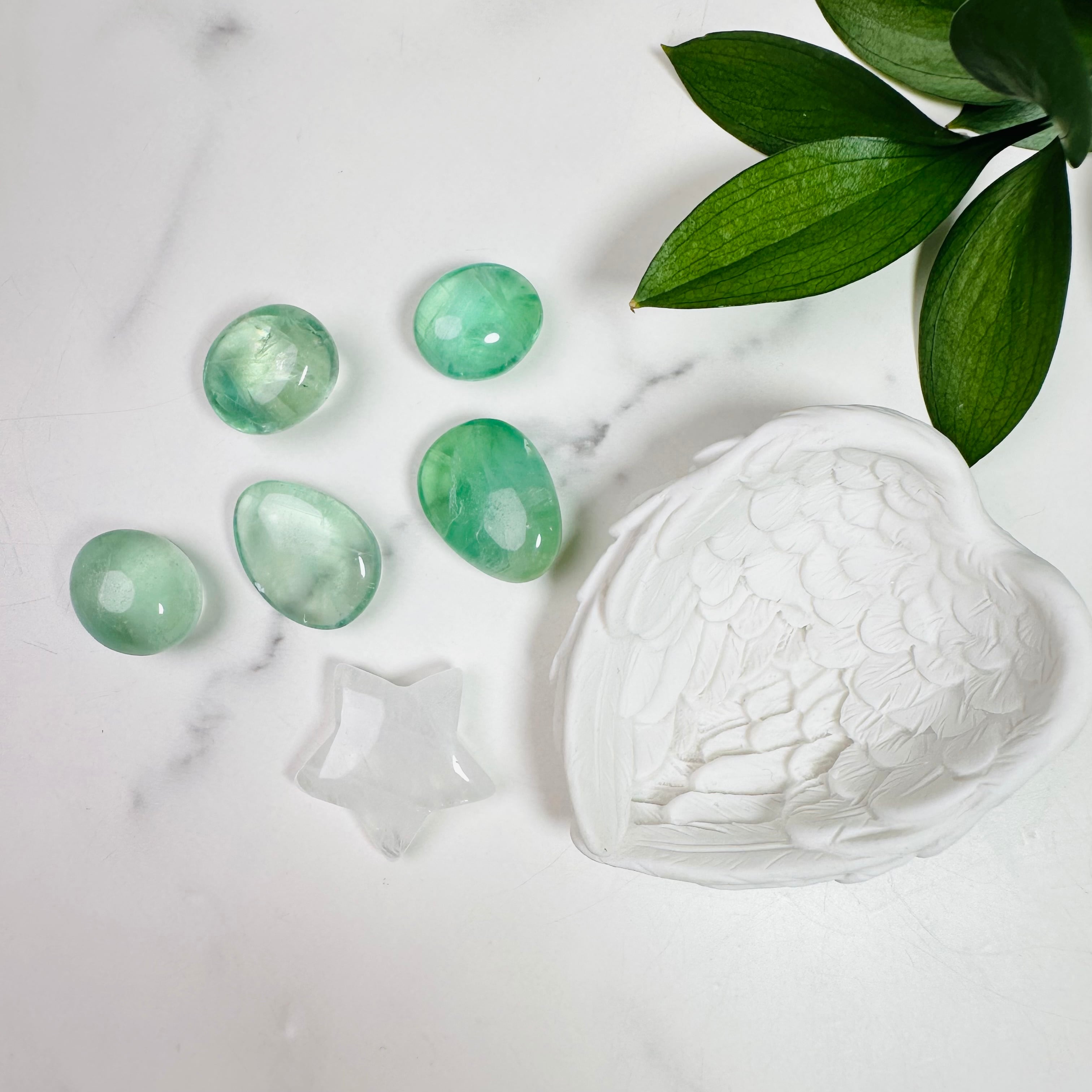 透明感たっぷりのグリーンのフローライトタンブル5個と、クリアクォーツのお星様、当店で大人気の天使の羽ボウルのセットです。ミントのような爽やかさでマイナスの気を取り除き、疲れた心をリフレッシュしてくれるフローライトのサプリメントで、いつもの自分を取り戻してくださいね。