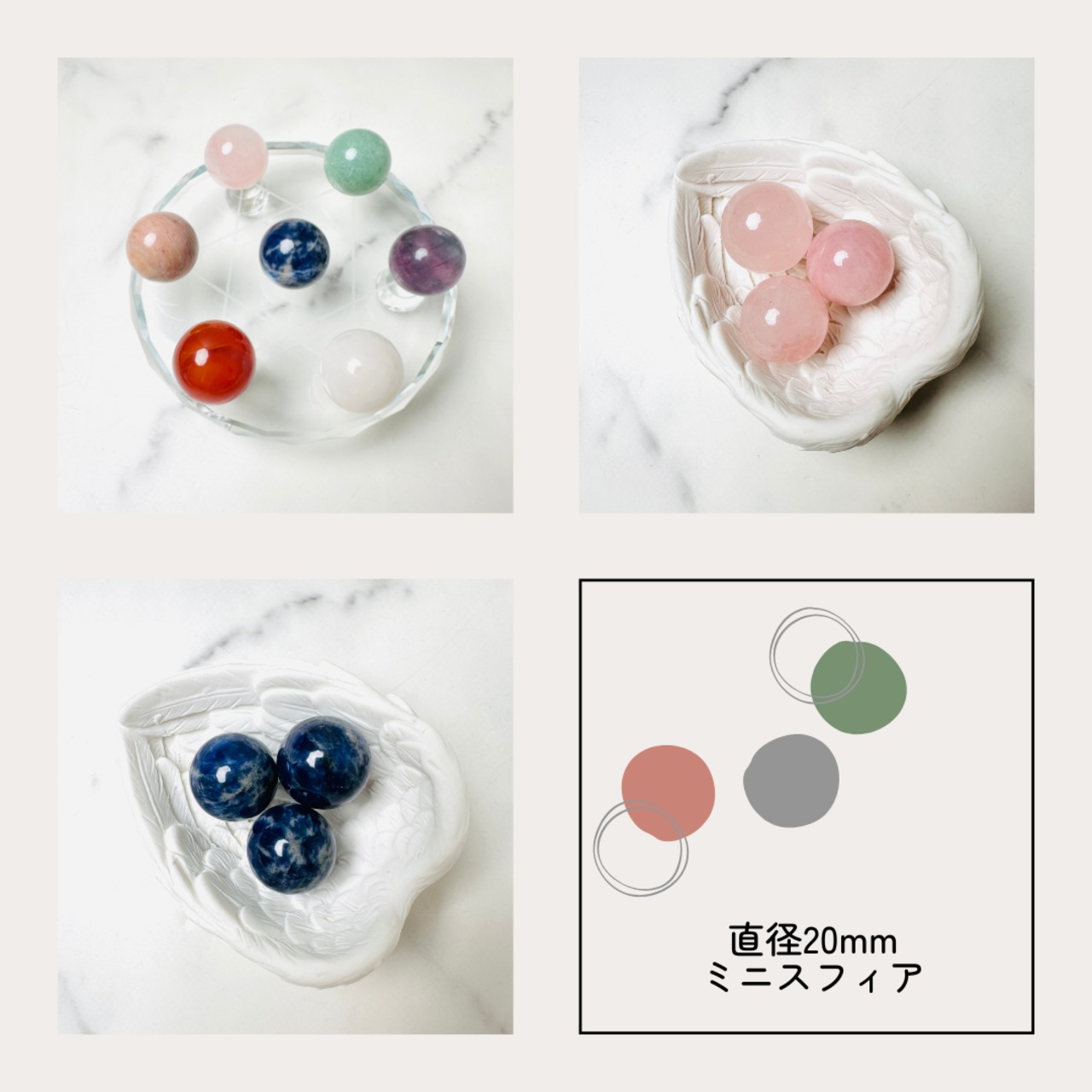 可愛らしい天然石のミニスフィアたち。お部屋のインテリアやデスク周りのアクセントとして飾るととっても可愛いです。つい集めたくなる小さな石たちは、コレクションやギフトにもぴったり。石ごとに異なる個性があり、選ぶ楽しさも魅力のひとつ。お気に入りの石を見つけて、日常に小さな癒しを取り入れてみませんか。