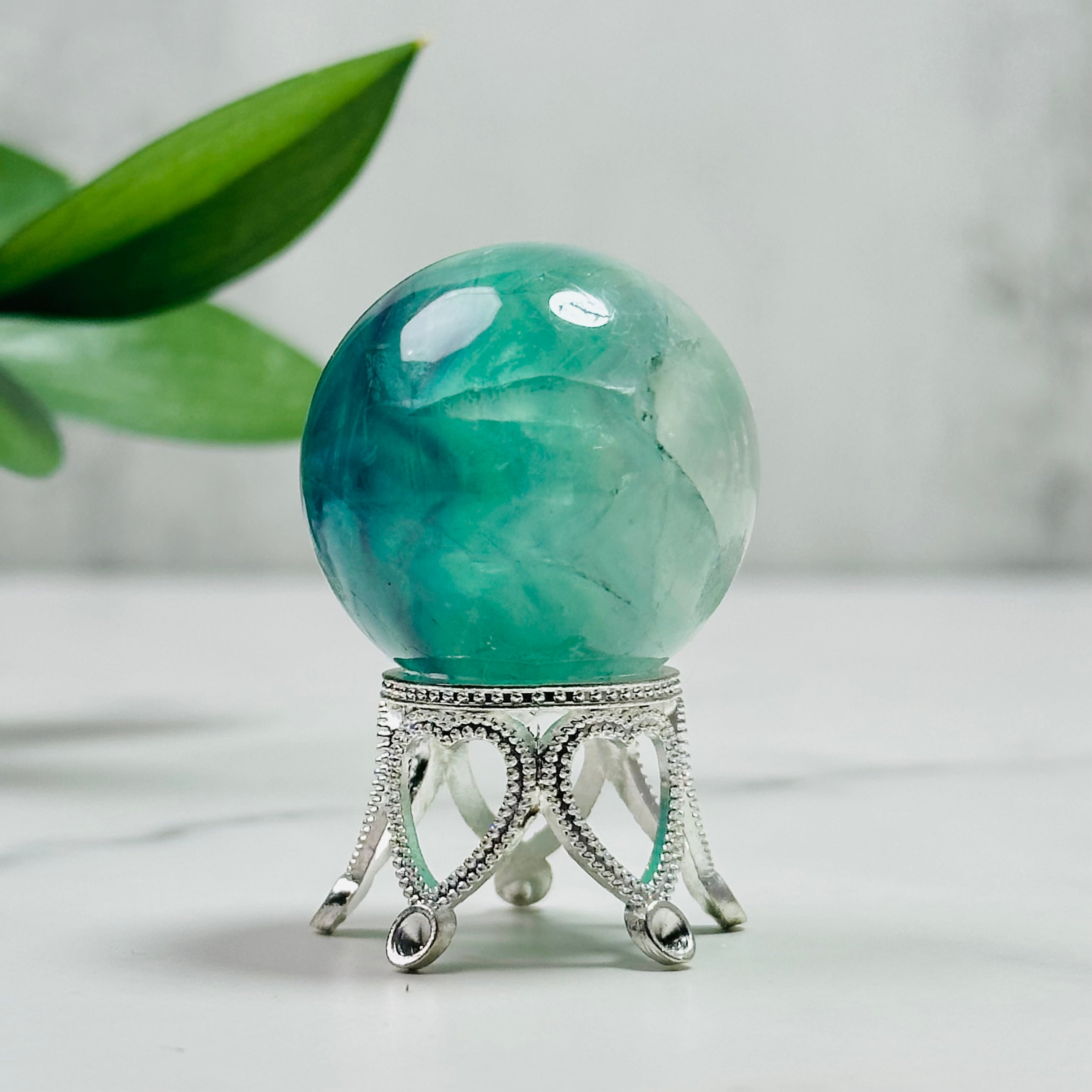 透け感のある結晶の中に、自然が描いた美しい模様が広がるフローライトのスフィア。光の角度や背景によって色の濃淡や輝きが変わり、手に取るたびに新しい表情を見せてくれます。丸みのあるフォルムは見た目にも柔らかく、お部屋のインテリアとして置くと空間をおしゃれに演出します。天然のアートとして、贈り物にも喜ばれる一品です。