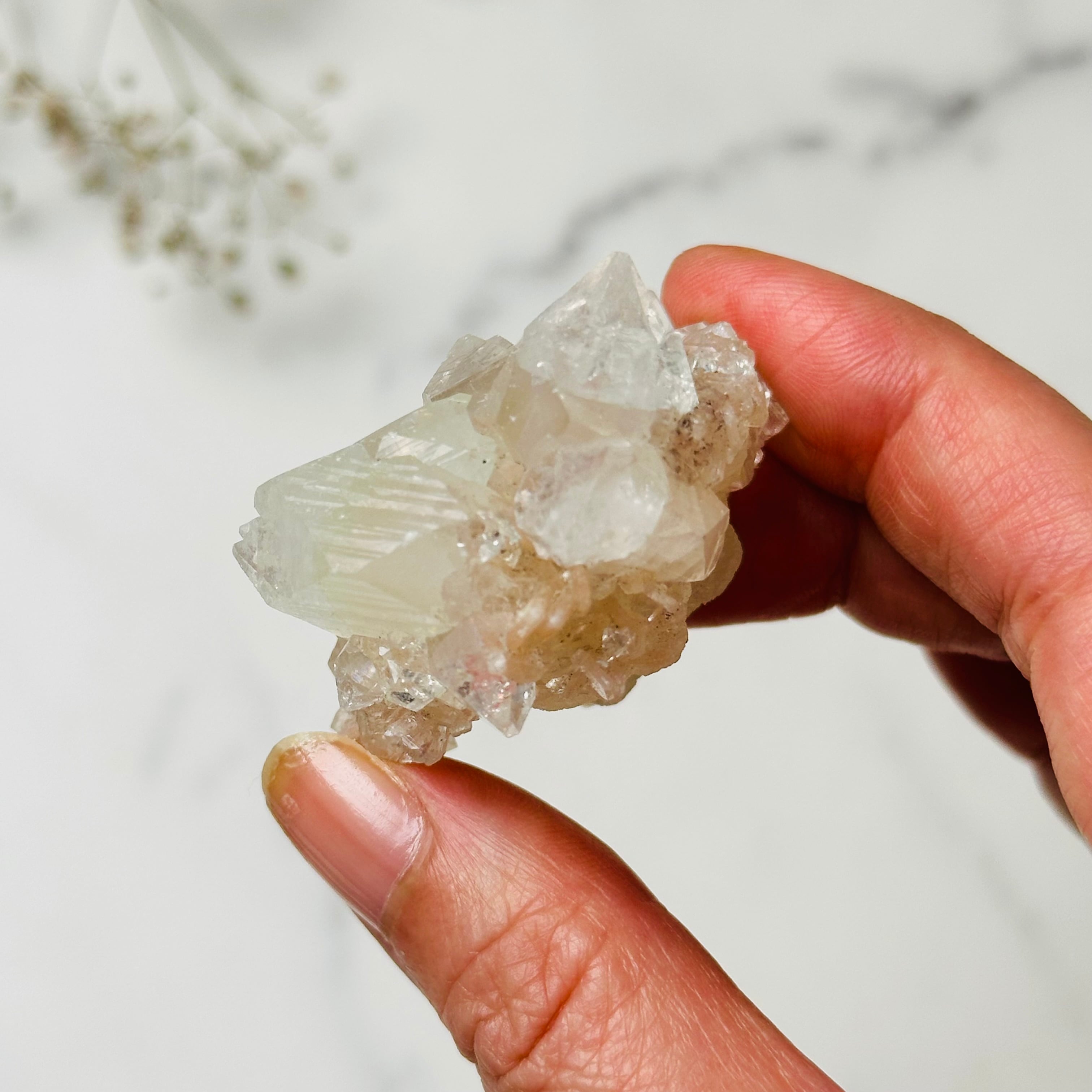 アポフィライトは「インスピレーションと癒し」を象徴する石として知られます。透明感のある結晶は光を受けてきらめき、心地よい浄化力を感じさせます。一方、スティルバイトは「優しさと安定」を意味し、柔らかなオレンジやピンクの色合いが温かみを添えてくれる石です。この二つが共生することで、美しさだけでなく、調和と安らぎを同時に感じられるのが魅力です。