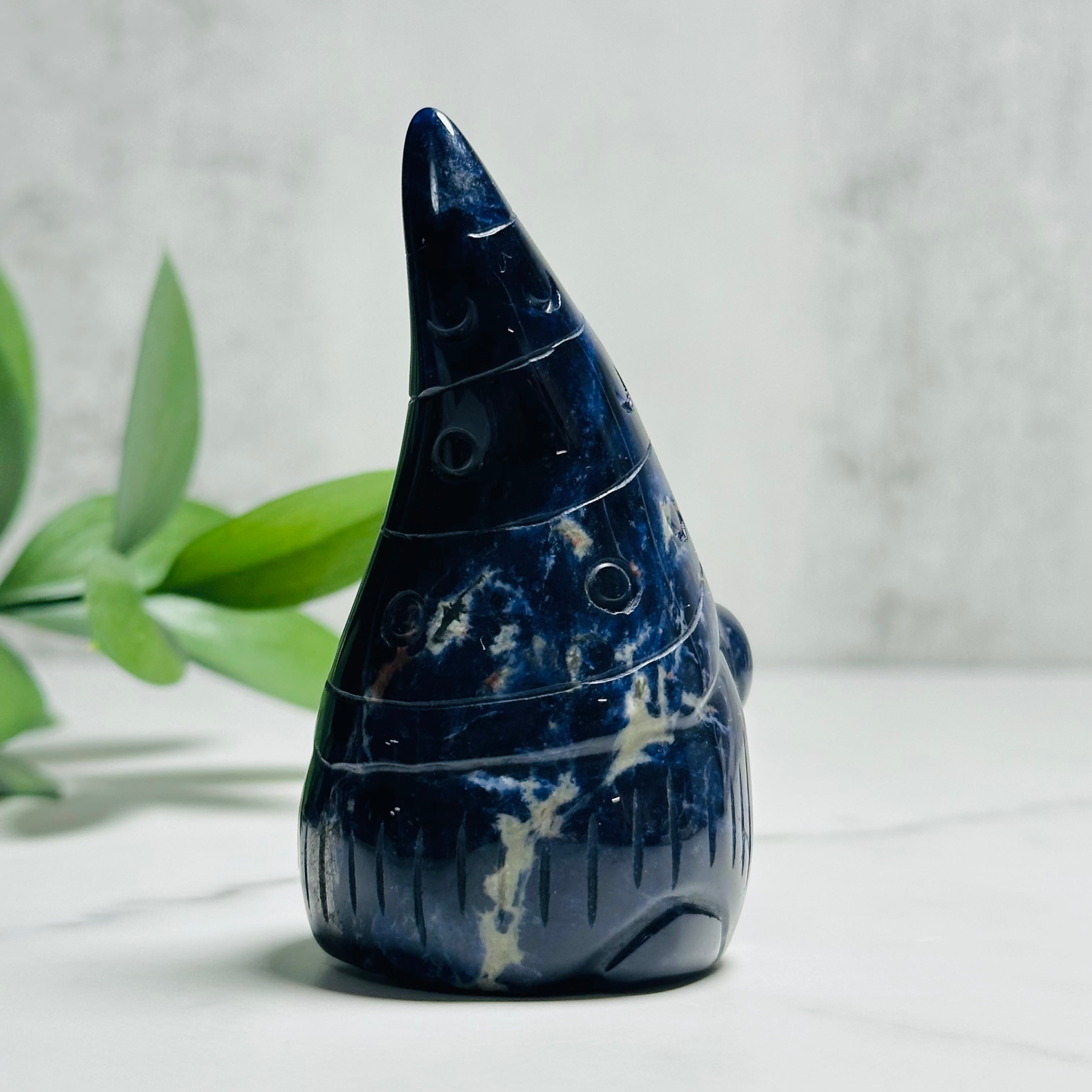 夜空を思わせる深いブルーが美しいソーダライトのノームさん。落ち着きのある色合いがインテリアに上品さをプラス。丸みを帯びたフォルムが愛らしく、見ているだけで心がほっとするような柔和な存在感があります。デスクや玄関、ベッドサイドなど、さりげない癒しを添えたい場所にぴったり。天然石ならではの風合いと模様の個性が楽しめる一点物です。