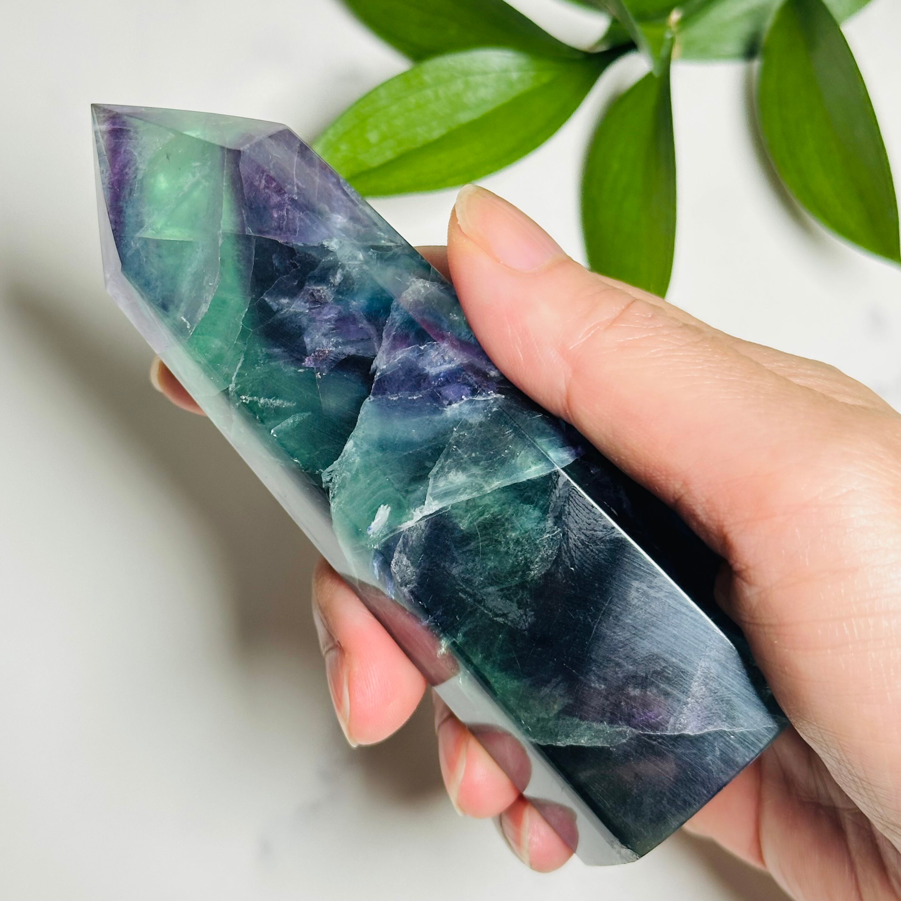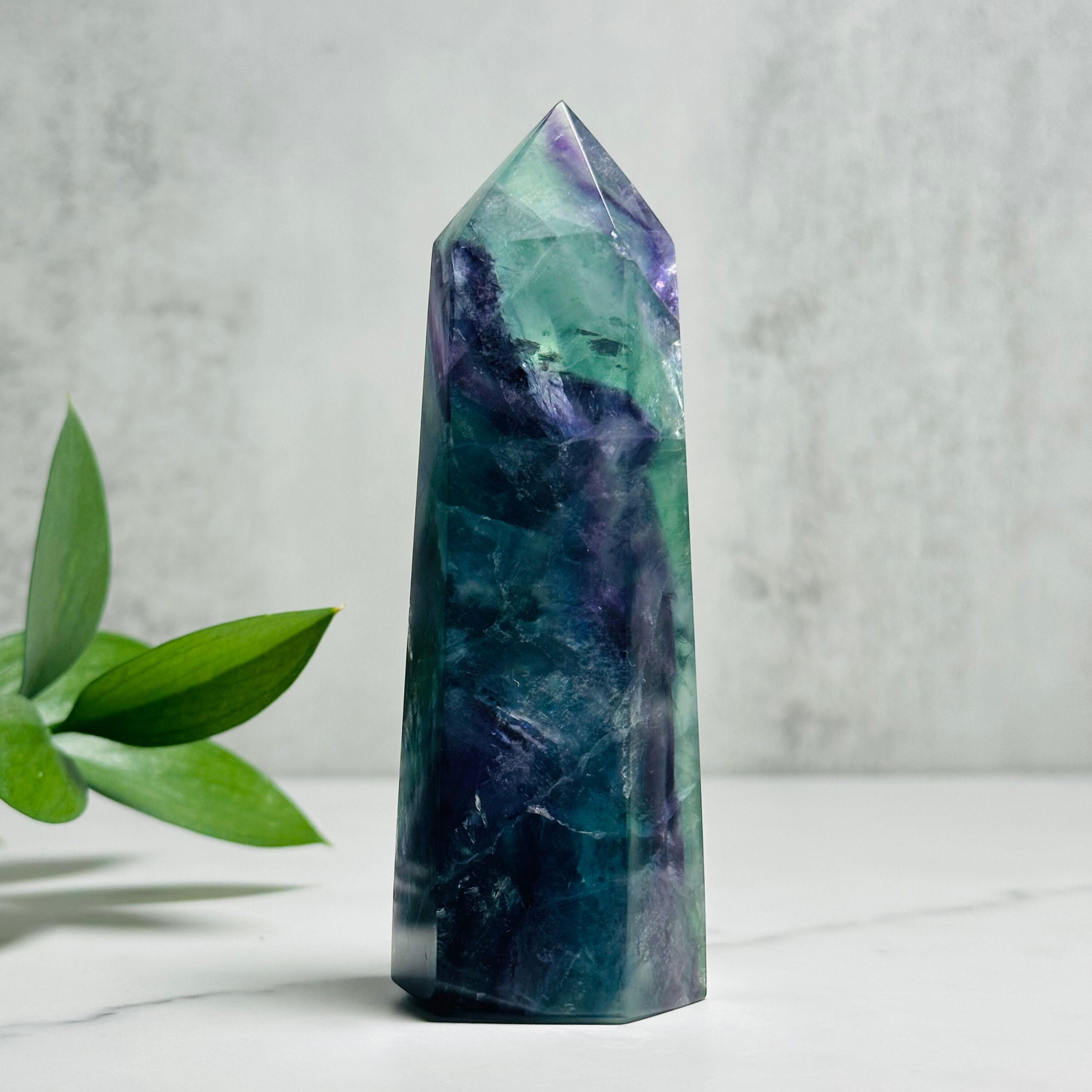 濃い紫と深いグリーンが重なり合い、幻想的な風景を閉じ込めたようなレインボーフローライトのタワー。光に透かすと溶け合う色のグラデーションが際立ち、見る角度によって異なる美しさを楽しめます。インテリアとして、リビングや玄関周りなどに置けば、お部屋をセンスアップしながらさりげない癒しと彩りを与えてくれます。