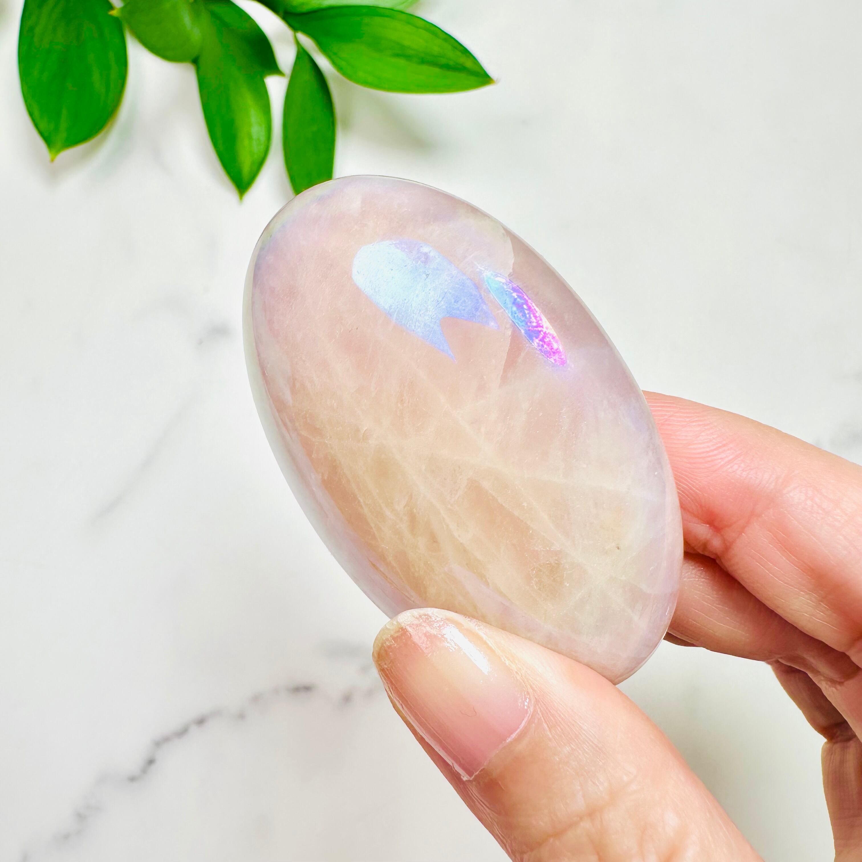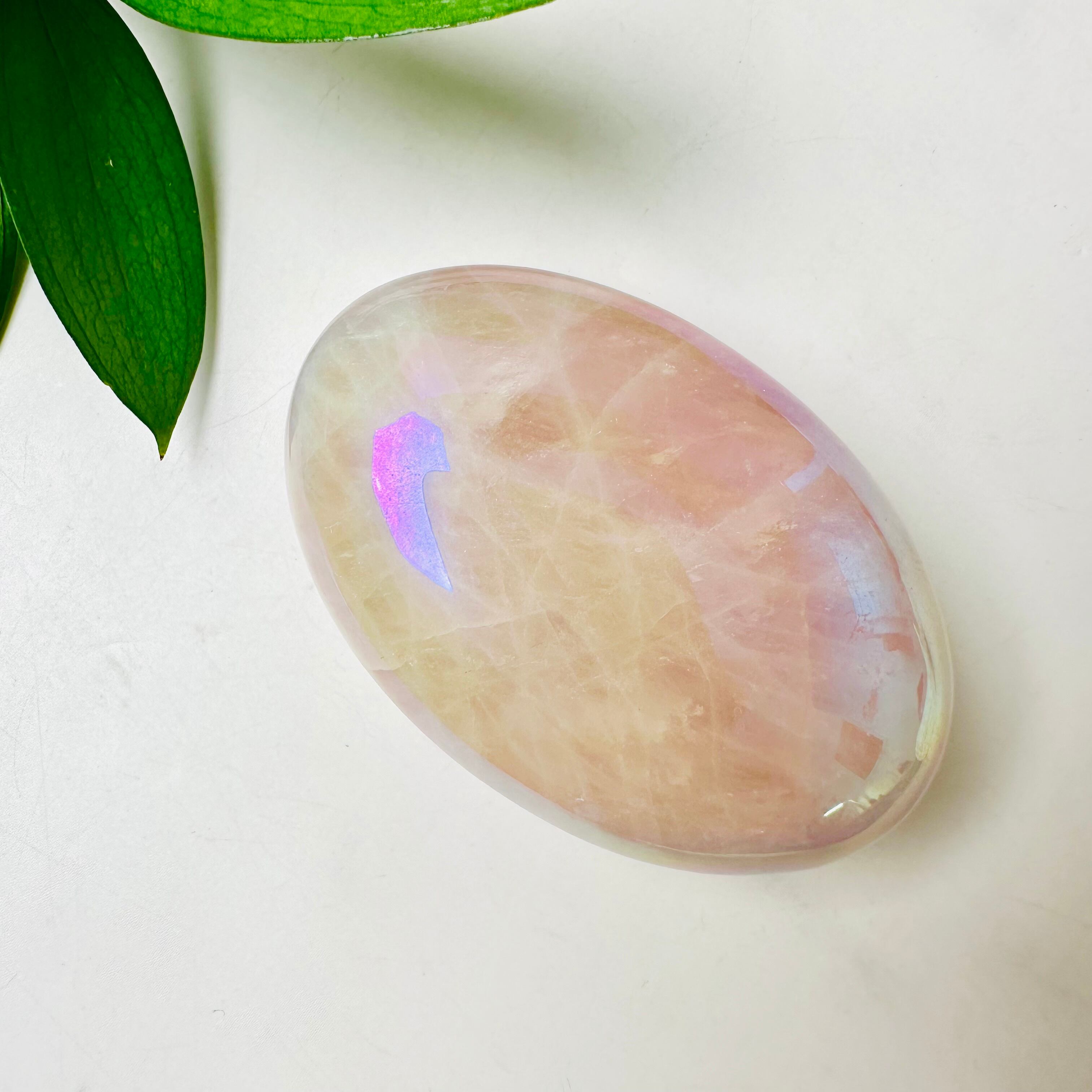 優しいピンクのローズクォーツに、オーラ加工を施した幻想的なパームストーン。角度によって淡く虹色に輝き、まるで夢の中の宝石のような美しさです。ふんわりとした温かみと、キラリと光る透明感が魅力で、手のひらにすっとなじむサイズ感も◎。日々の癒しアイテムとしてはもちろん、大切な方への贈り物にもぴったりです。