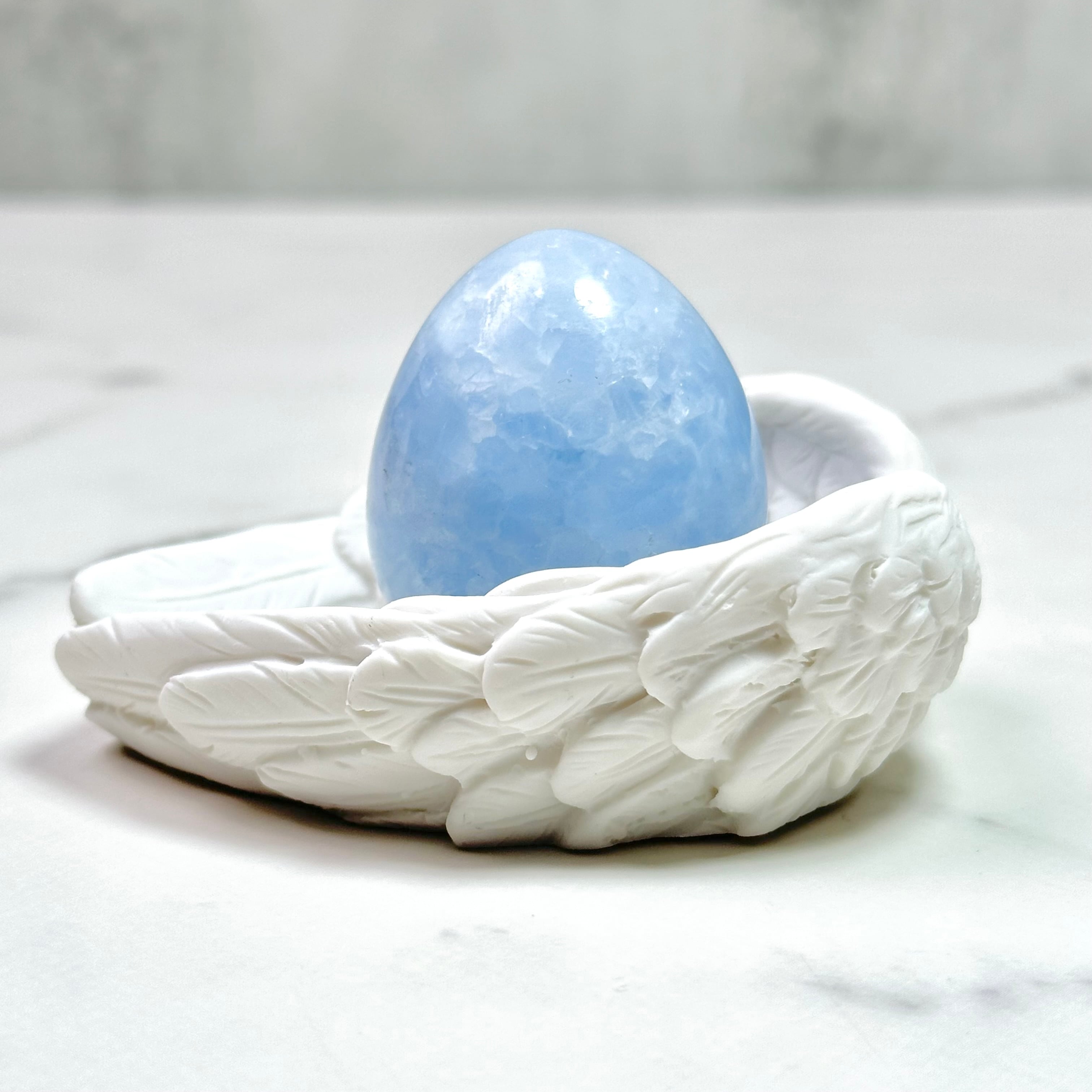 淡い空色が美しいセレスタイトを磨き上げたエッグ。透明感のあるブルーはまるで空や雲を閉じ込めたようです。丸みのある卵型で、手に取ると優しい雰囲気に包まれるような癒しを感じます。お部屋にそっと置くだけで、清らかな空間を演出してくれます。