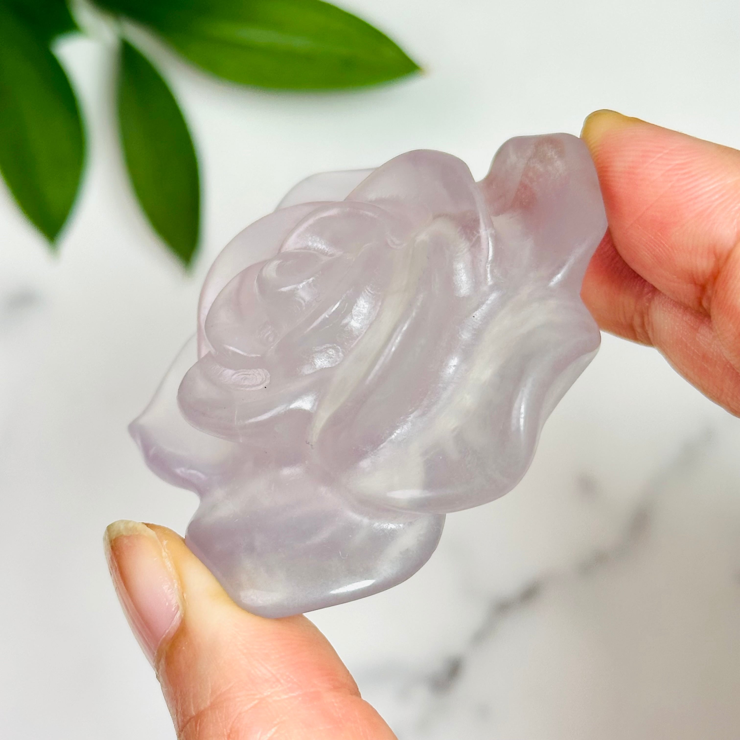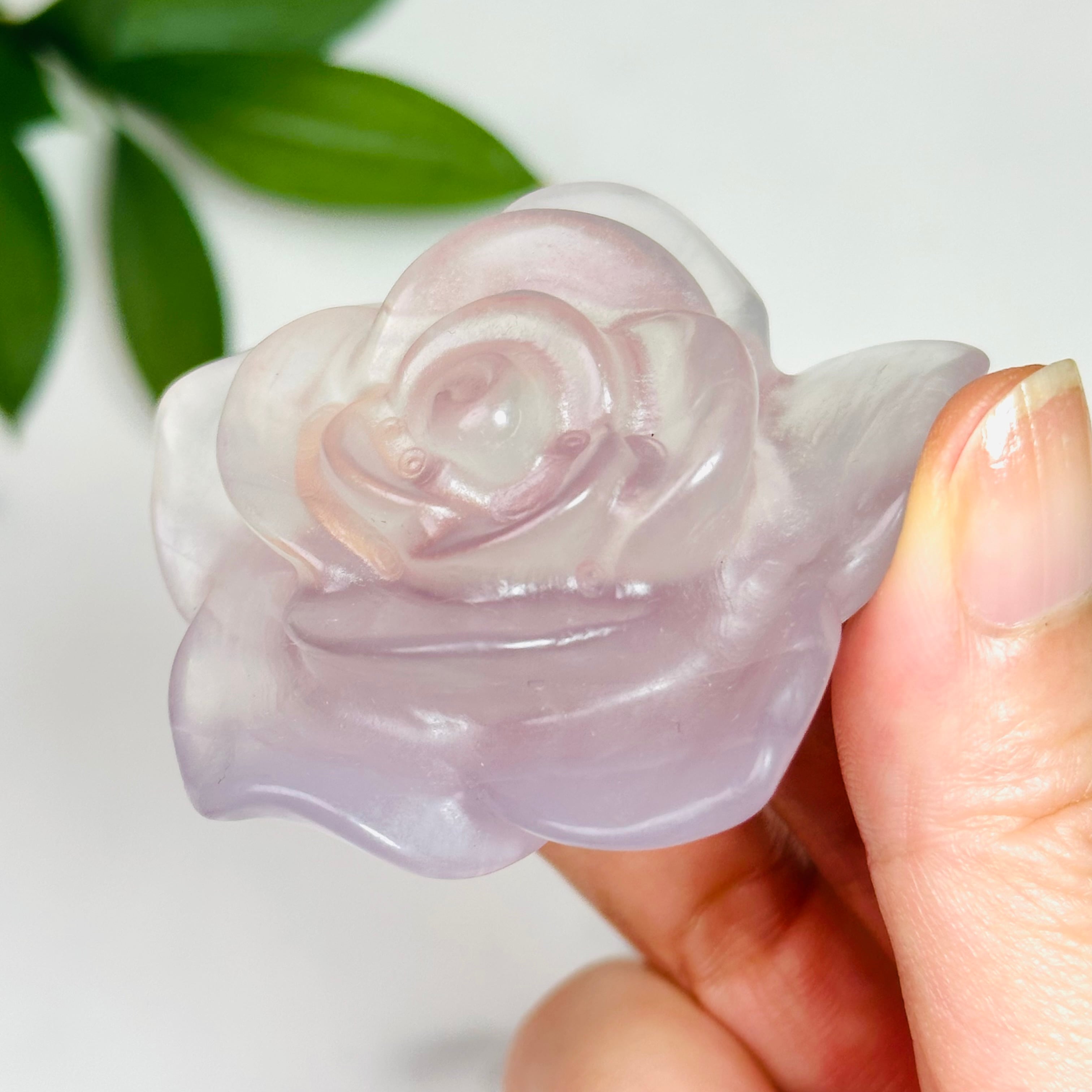 透明感のある淡いパープルカラーが美しいフローライトの薔薇オブジェ。天然石ならではのグラデーションが花びらに広がり、光に透けると幻想的な輝きを放ちます。お部屋に飾るだけでロマンティックな雰囲気を演出でき、デスクやリビング、寝室のインテリアにぴったり。大切な方へのギフトや、特別な日の贈り物にもおすすめのアイテムです。
