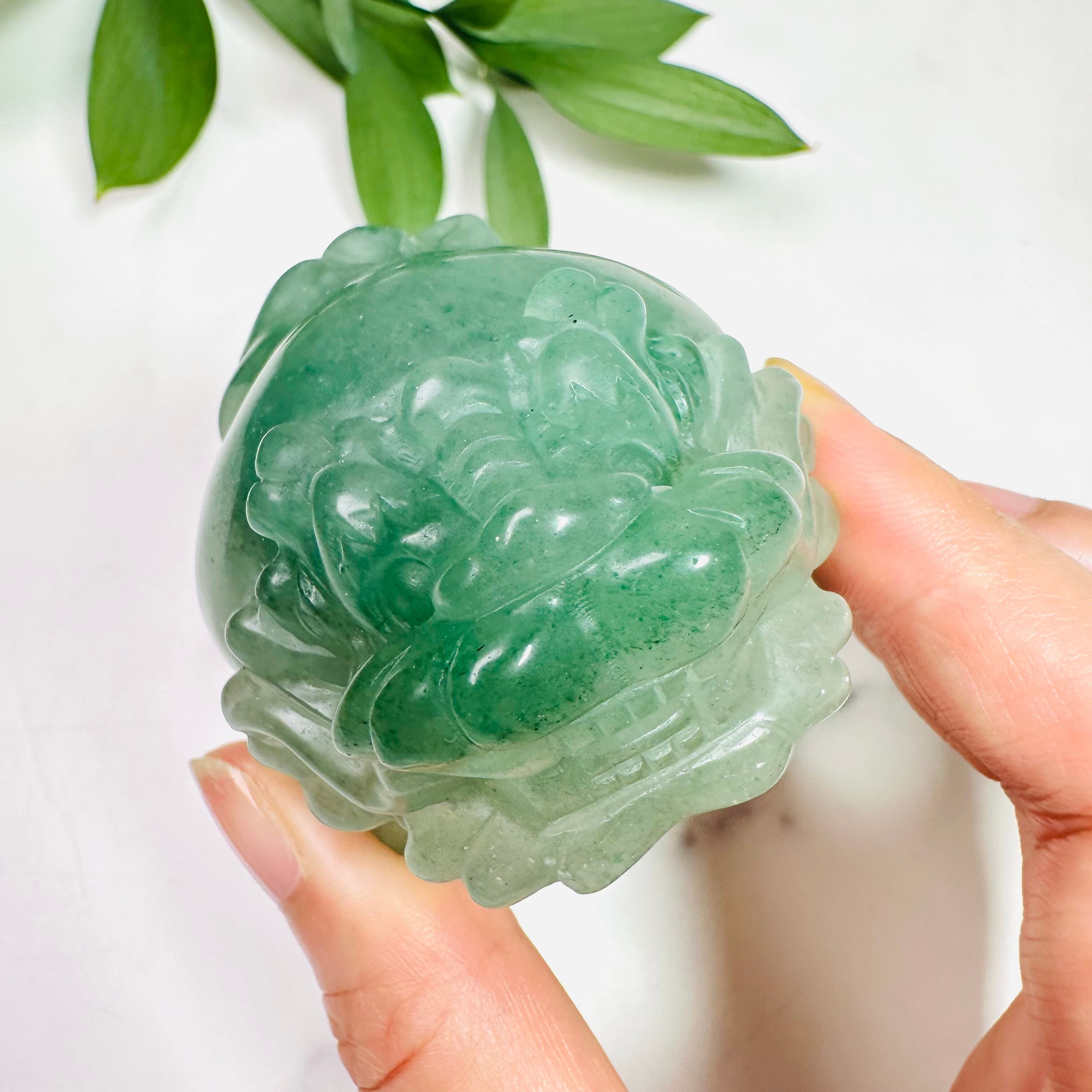 グリーンカラーにきらめく内包物が魅力のグリーンストロベリークォーツを、縁起モチーフであるロングイ(龍亀)に彫刻しました。龍の力強さと亀の安定感をあわせ持つロングイは、風水インテリアとしても人気があり、玄関やリビングに置くだけで上品な存在感を放ちます。