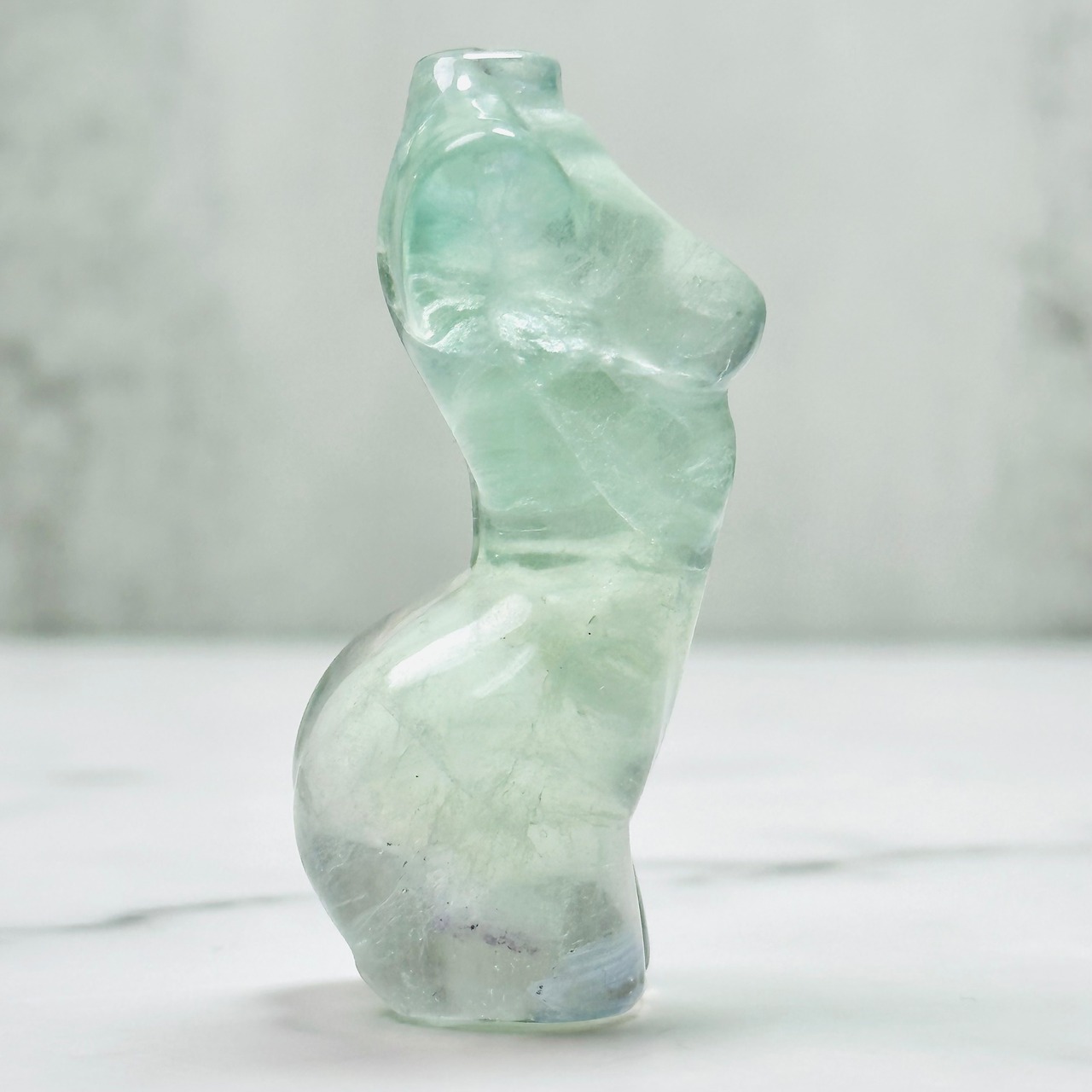 透明感のあるグリーンが美しいフローライトを丁寧に磨き上げたレディボディ。滑らかな曲線と繊細なラインは芸術作品のようで、置くだけでお部屋に洗練された雰囲気を添えます。光を受けると柔らかな輝きを放ち、ナチュラルで幻想的な存在感を楽しめるのも魅力。インテリアとしてはもちろん、アートピースや特別な贈り物にもおすすめの天然石オブジェです。