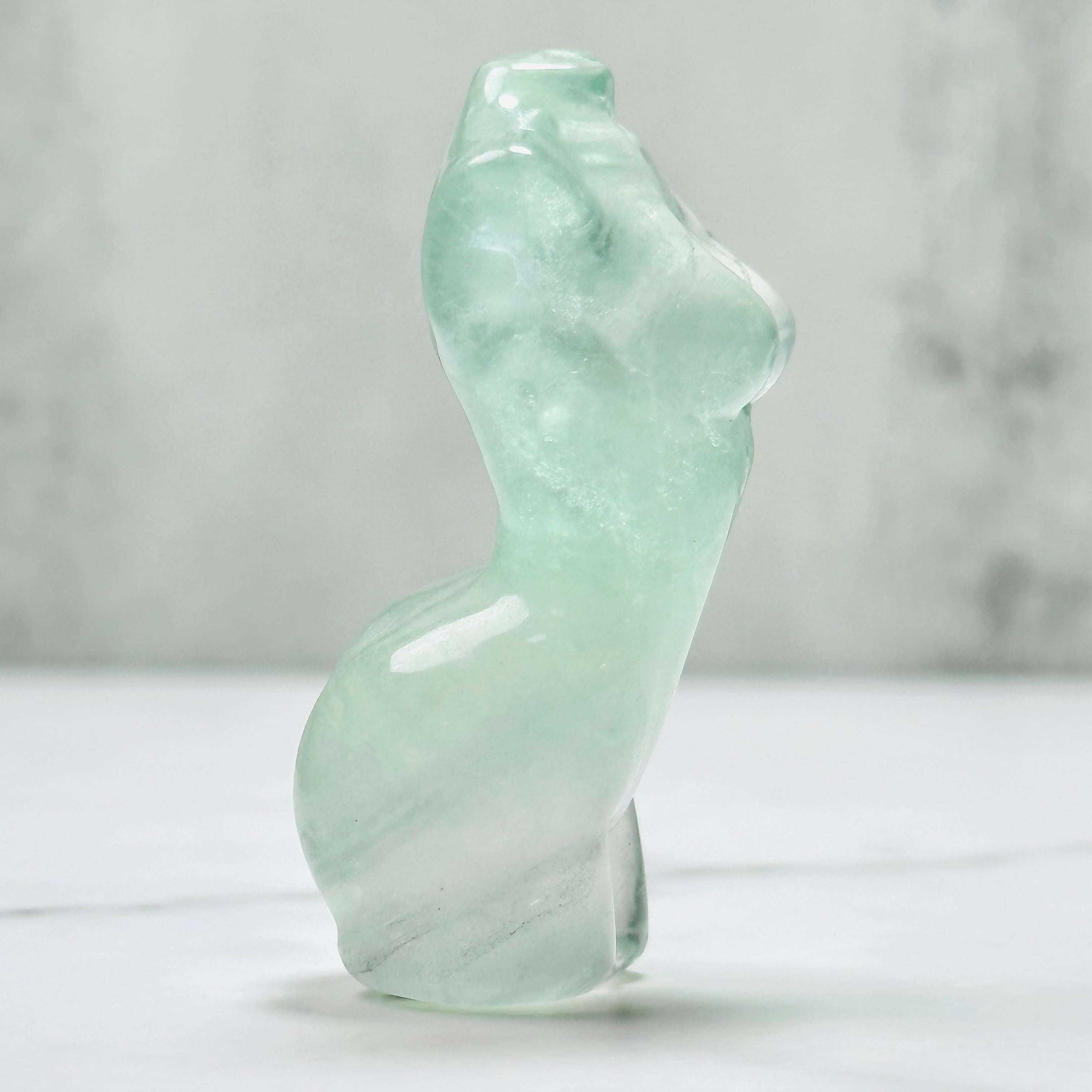 透明感のあるグリーンが美しいフローライトを丁寧に磨き上げたレディボディ。滑らかな曲線と繊細なラインは芸術作品のようで、置くだけでお部屋に洗練された雰囲気を添えます。光を受けると柔らかな輝きを放ち、ナチュラルで幻想的な存在感を楽しめるのも魅力。インテリアとしてはもちろん、アートピースや特別な贈り物にもおすすめの天然石オブジェです。