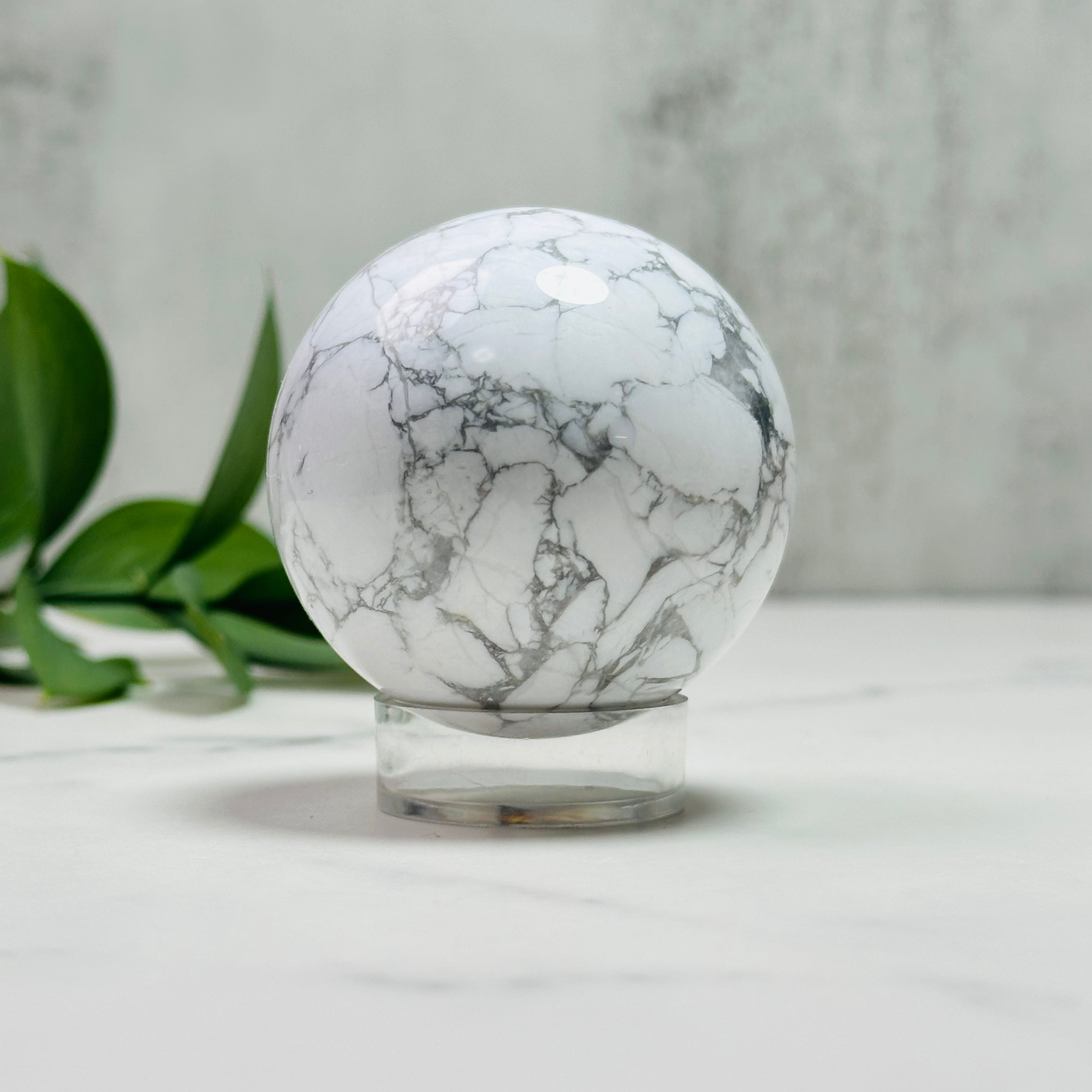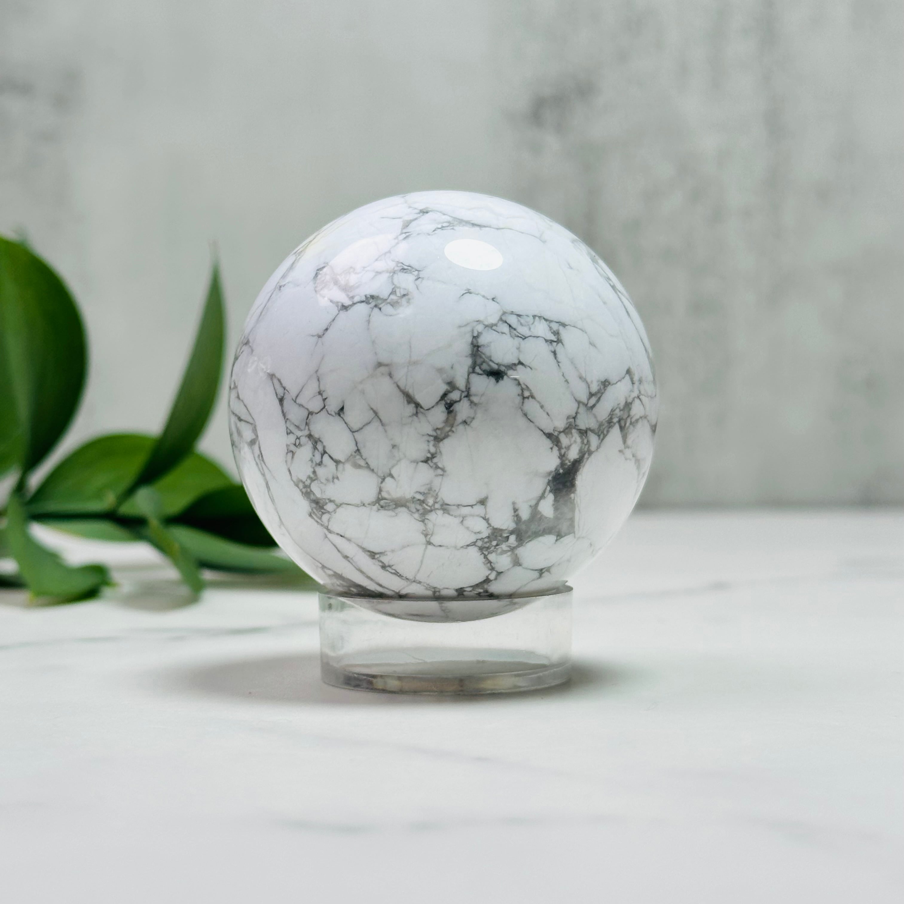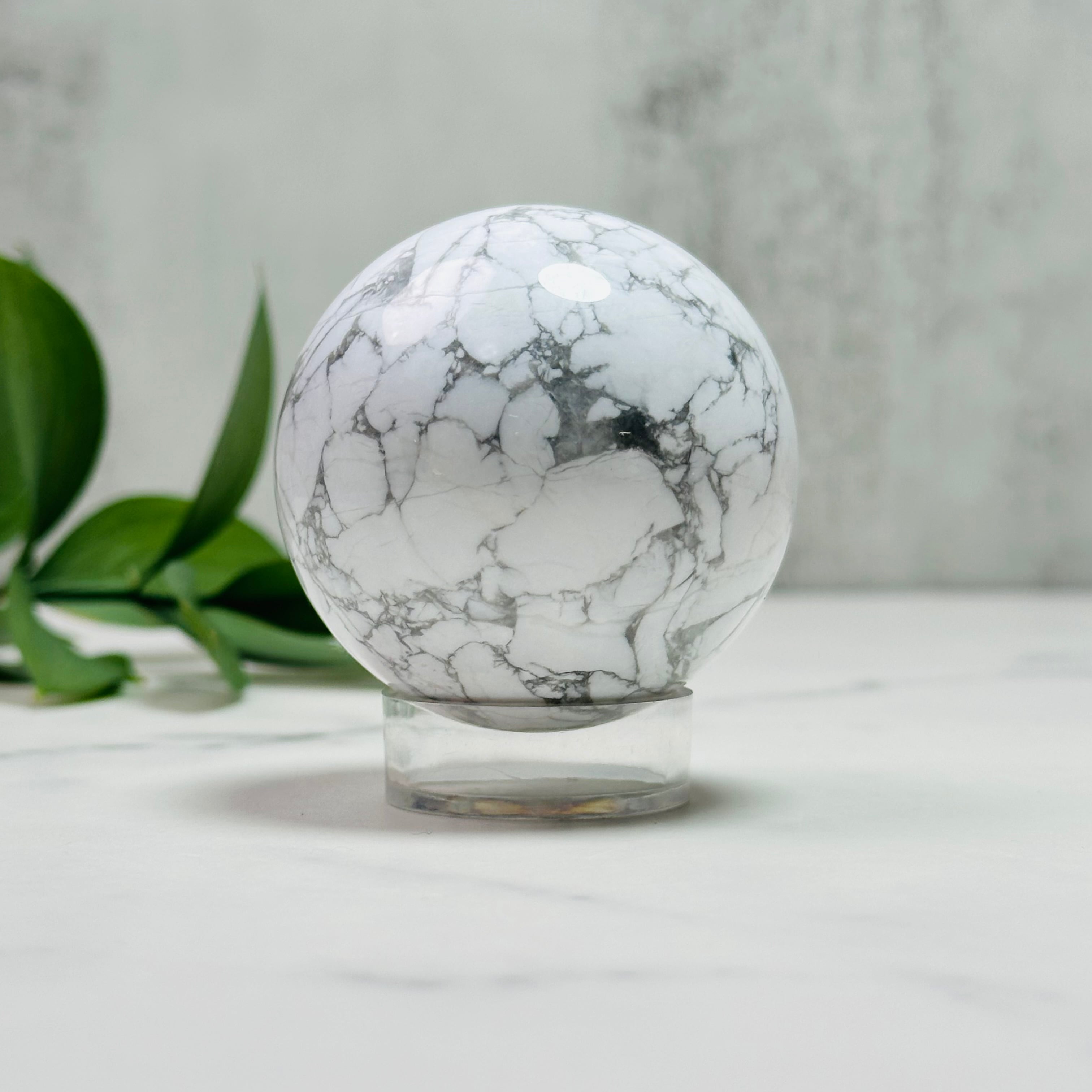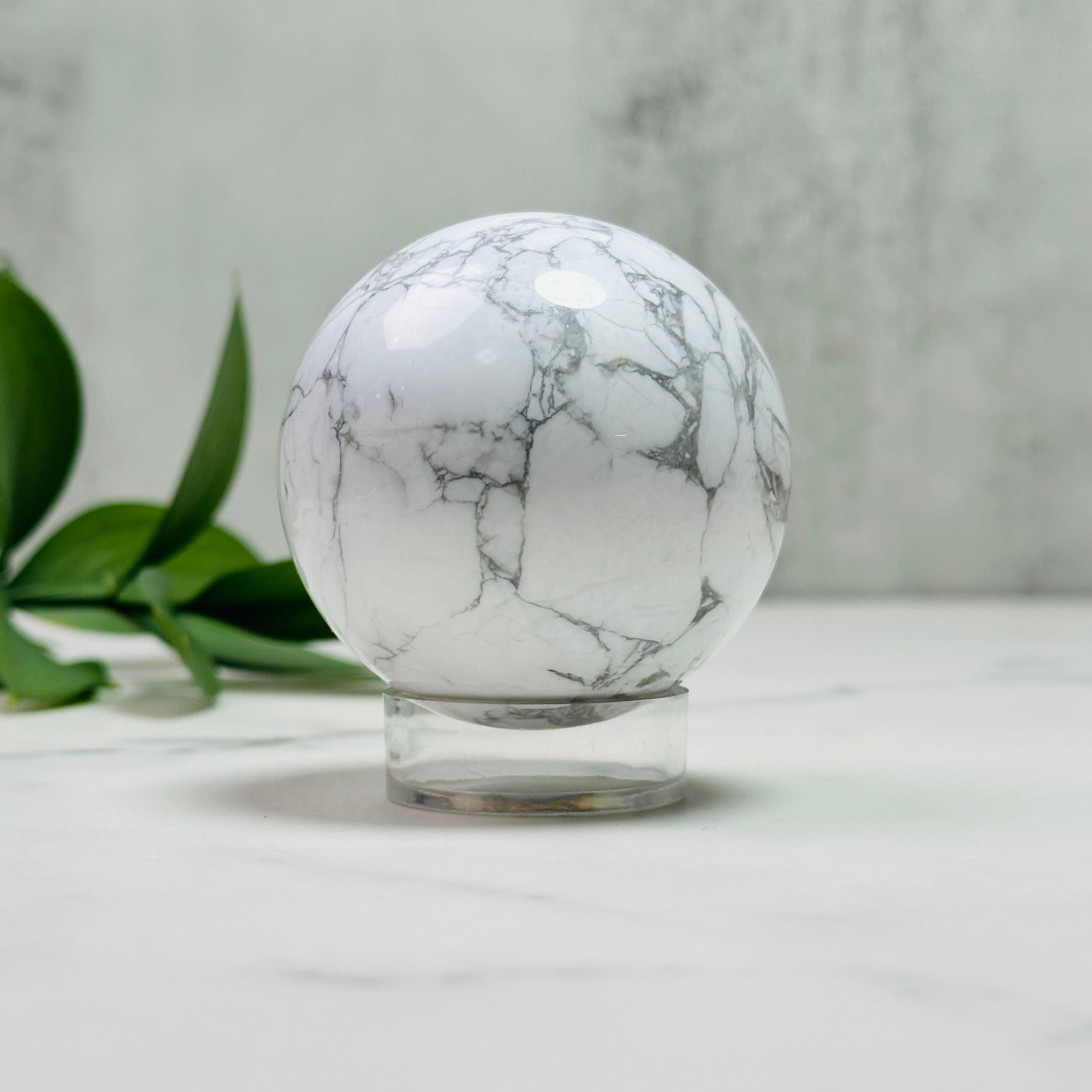 白地にグレーのマーブル模様が美しいハウライトのスフィア。すっきりとして上品な佇まいは、お部屋に清らかで落ち着いた雰囲気を与えてくれます。存在感のあるサイズ感はリビングや書斎、寝室のインテリアにぴったり。飾るだけでシンプルながらもスタイリッシュな空間を演出できる天然石オブジェです。
