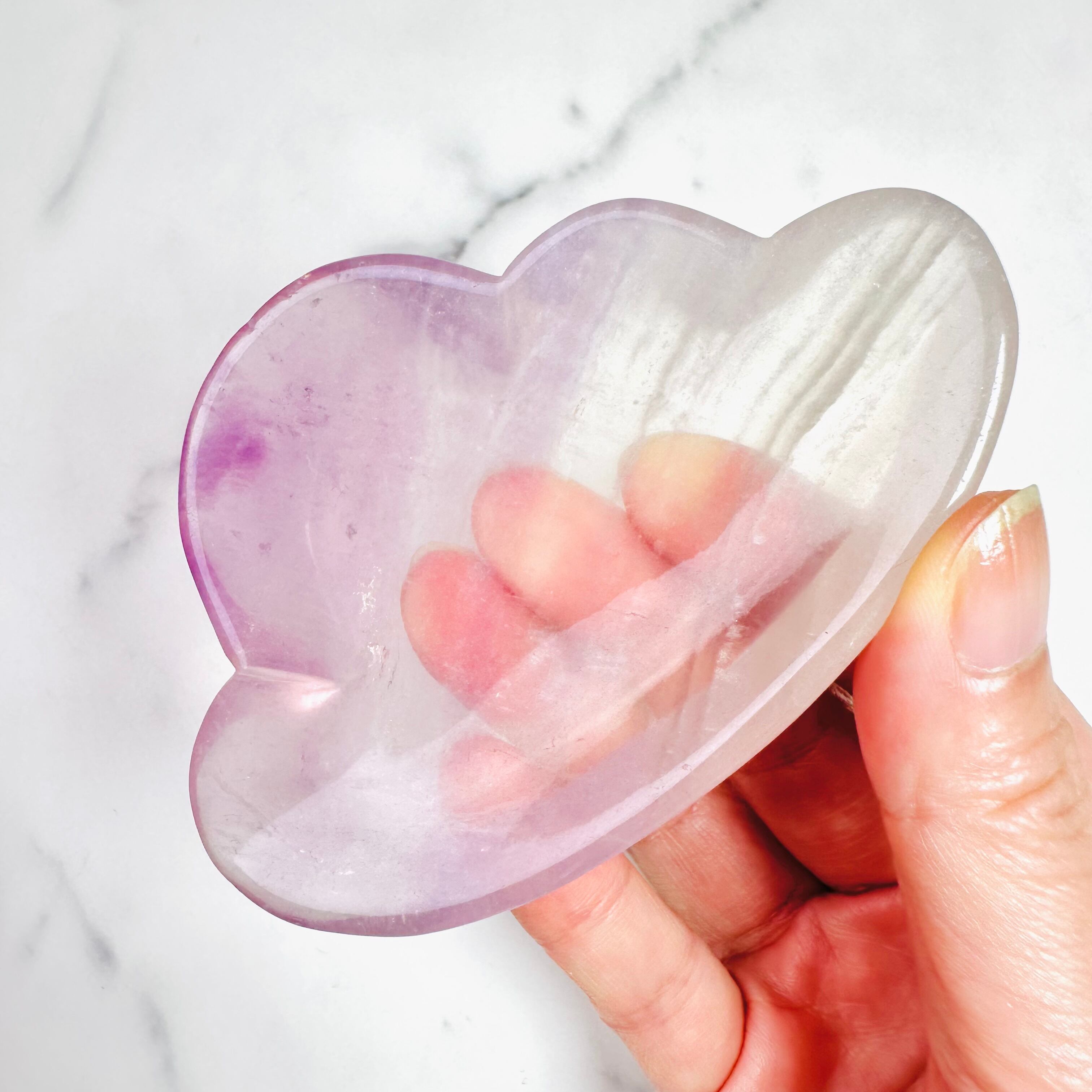 透明感あふれるピンクのグラデーションが美しいフローライトを、ふんわりとした雲型のトレイに仕上げました。光に透かすと幻想的に輝き、見る角度によって異なる表情を楽しめるのが魅力。アクセサリートレイや小物置きとして実用できるのはもちろん、置いておくだけでお部屋をおしゃれに彩るインテリアにもなります。天然石ならではの柔らかな色合いは、リビングや寝室、玄関にぴったり。大切な方へのギフトにもおすすめです。