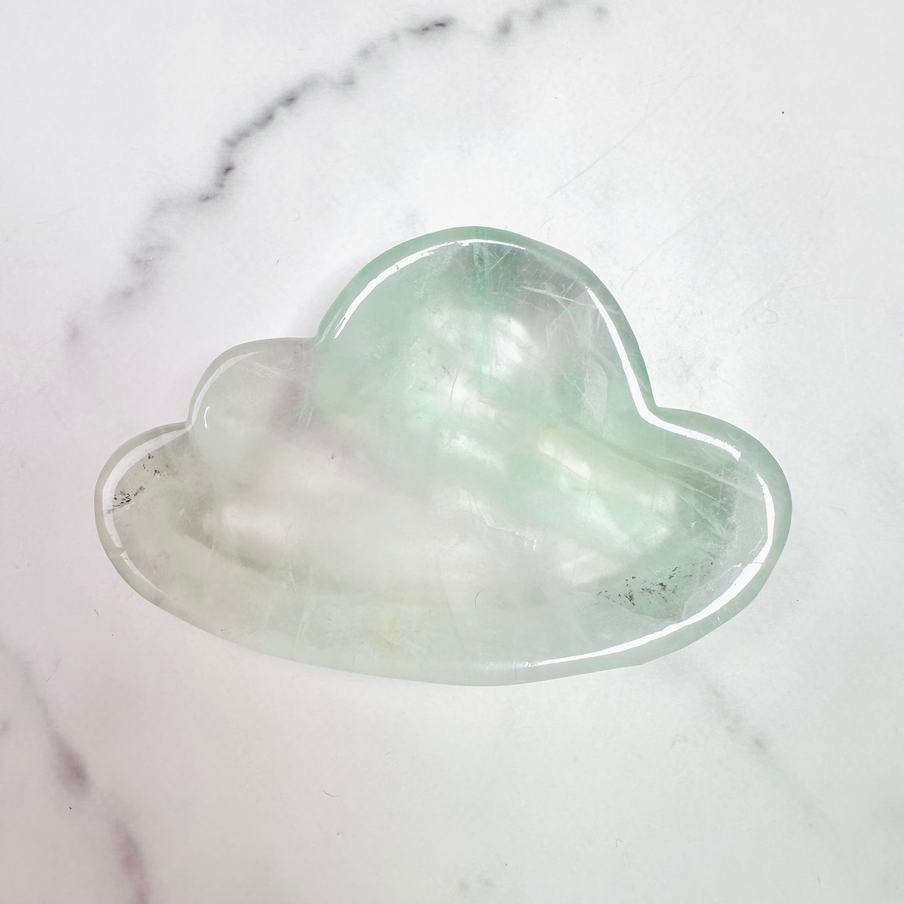 透明感あふれるグリーンのグラデーションが美しいフローライトを、ふんわりとした雲型のトレイに仕上げました。光に透かすと幻想的に輝き、見る角度によって異なる表情を楽しめるのが魅力。アクセサリートレイや小物置きとして実用できるのはもちろん、置いておくだけでお部屋をおしゃれに彩るインテリアにもなります。天然石ならではの柔らかな色合いは、リビングや寝室、玄関にぴったり。大切な方へのギフトにもおすすめです。