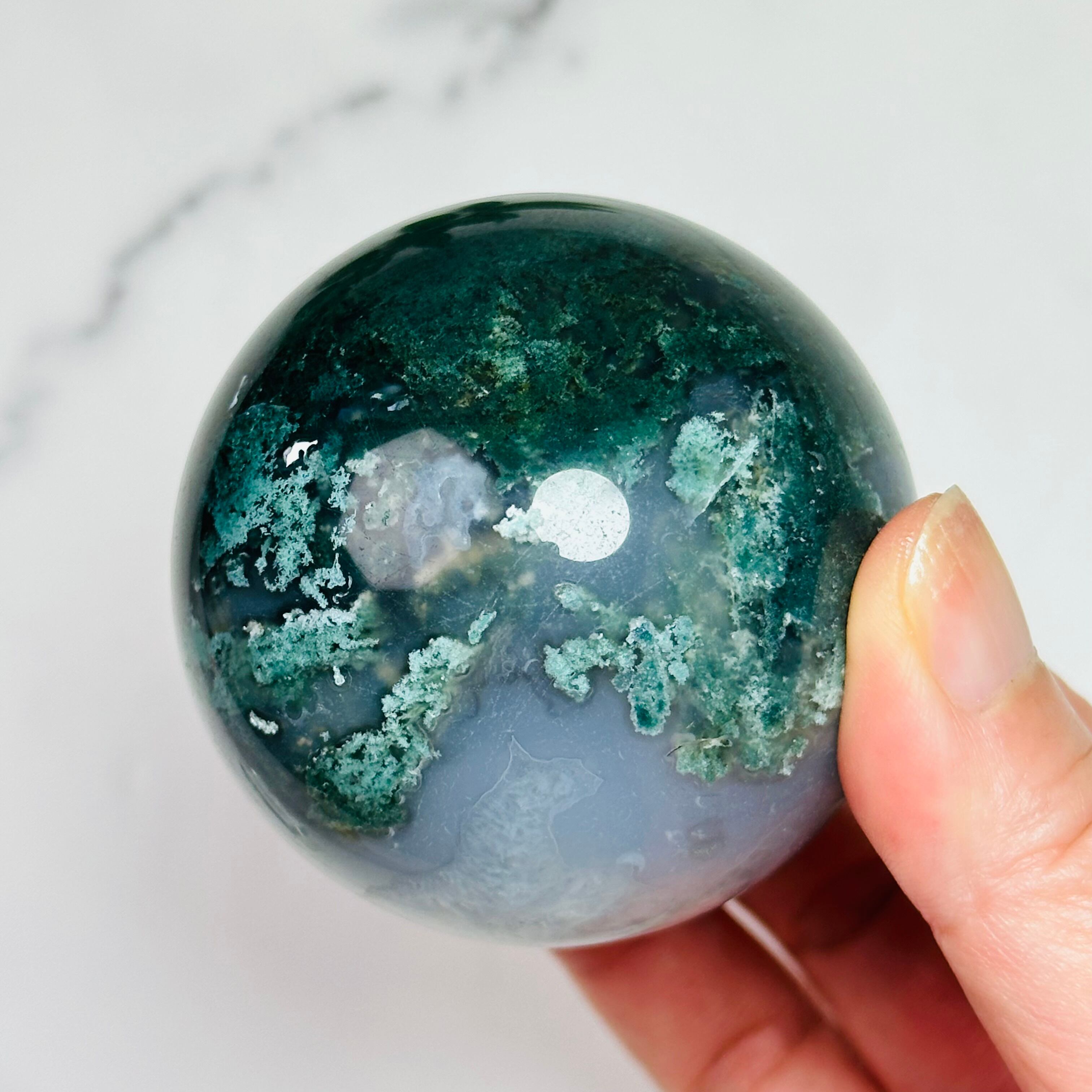 深みのあるフォレストグリーンが森林を思わせるモスアゲートスフィア。自然が生み出した唯一無二の模様は、眺めているだけで穏やかな気持ちにしてくれます。リビングや書斎、玄関に置けば、そこに自然を閉じ込めたかのような癒しのインテリアになります。