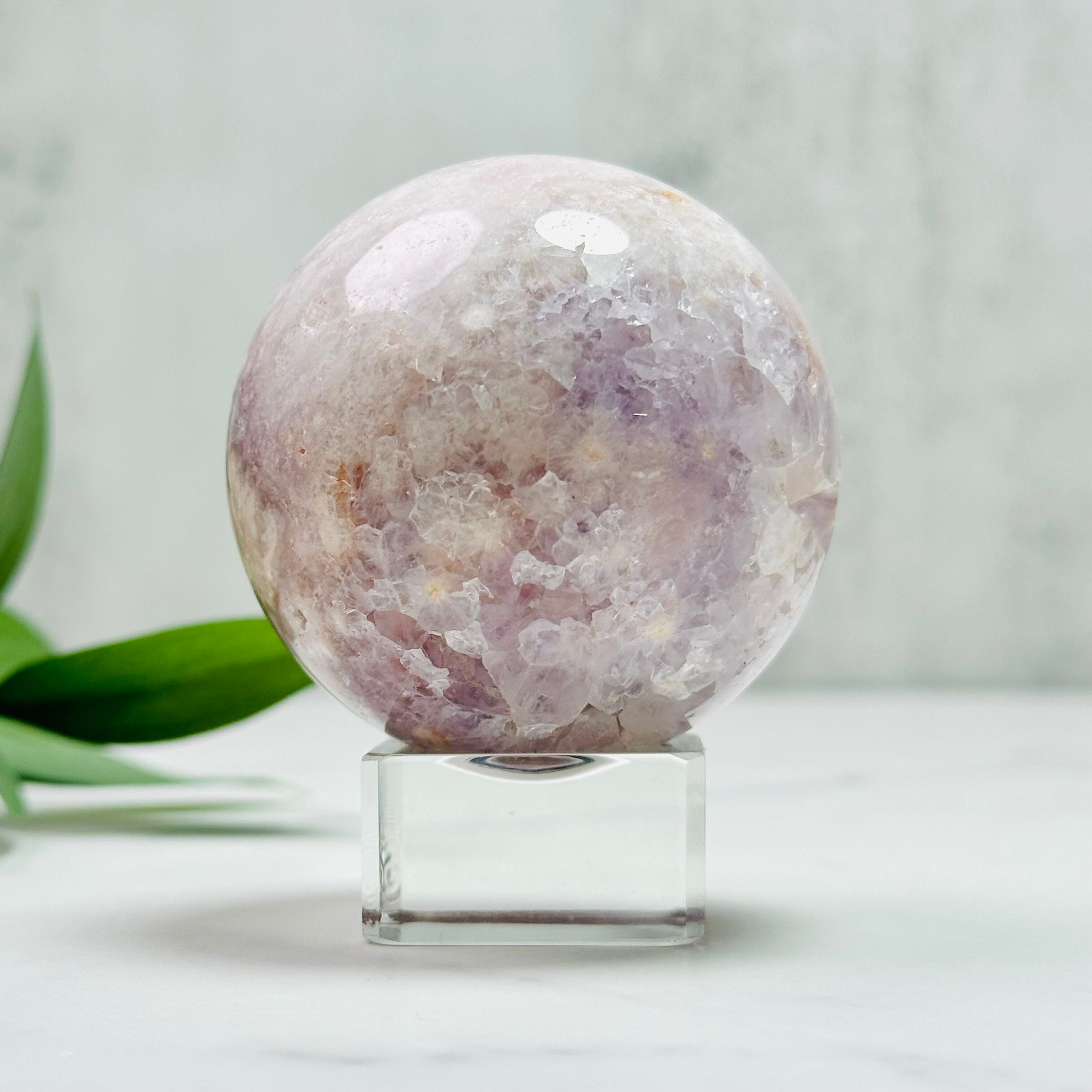 優しいピンクとラベンダーの色合いが美しいピンクアメジスト&フラワーアゲートスフィア。花びらが広がるような模様は、自然が描き出したアートそのものです。光に透けると柔らかな輝きを放ち、お部屋を幻想的でロマンティックな雰囲気に彩ります。